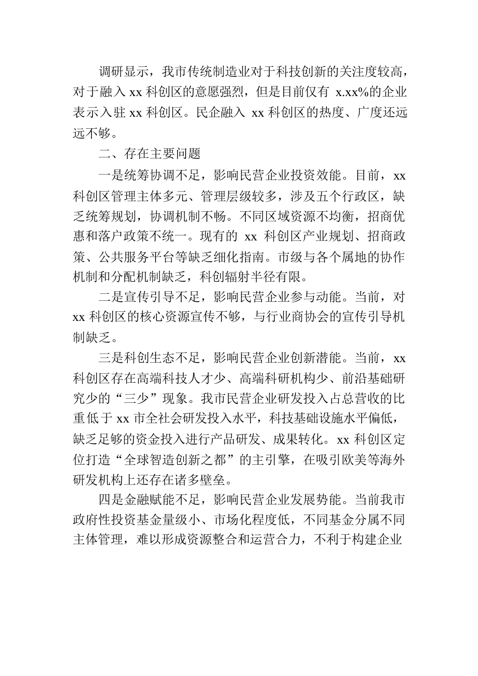党的二十大报告提出,“加快实施创新驱动发展战略,加快实现高水平科技自立自强”“加快建设世界重要人才中心和创新高地”。xx科创区是xx建设现代化滨海大都市、国家自主创新示范区、全球智造创新之都的重要空间平台,是xx市域空间重构和功能优化的核心板块。如何运用市委市政府给出“领先领跑、聚能聚势、大气大美、重构重塑”的四个关键词,开启好xx科创分区高能级的这把“钥匙”,让优质民营企业加快融入,实现转型发展、能级提升,成为研究的关键。一、基本面分析民企是xx创新发展的主力军,是xx经济高质量发展的动力和引擎,在高新技术企业数量、研发经费方面占全市xx%和xx%以上。当前,作为xx创新发展的核心引擎,xx科创区规划已正式从“规划图”走向“施工图”,引导量大面广的民营企业以科技创新赋能转型发展、加快动能转换、提升创新能级,是xx实现高质量发展的重要举措。当前,xx登记在册的市场主体xxx.x万户,其中高新技术企业xxxx余家,民营企业占比高达xx%以上。科技大脑数据显示,截至xxxx年x月,xx民营企业内部研发机构共计xxxx家,包括高新技术企业研究开发中心xxx家,国家企业技术中心xx家,企业工程(技术)中心xxxx家,企业技术中心x家,企业研究院xxx家。xx%的市级以上企业技术中心设在民营企业,研发经费的xx%来自民营企业。xxxx年,xx市实现规模以上工业增加值xxxx.x亿元,同比增长x.x%,从经济类型看,私营企业增长x.x%。全市高技术、高新技术产业、战略性新兴产业、新材料、人工智能产业增加值分别增长x.x%、x.x%、x.x%、x.x%和x.x%,均快于规模以上工业整体增速。全市固定资产投资同比增长xx.x%,其中民间项目投资增长xx.x%。从投资主要构成看,制造业投资增长xx.x%,基础设施投资增长xx.x%,合计对固定资产投资增长的贡献率为xx.x%。xxxx年xx月,我市获得了x项xxxx年度国家科学技术奖项目,其中x项由民营企业牵头或合作获奖。xx科创区是xx科技创新的重大战略平台,围绕新材料、电子信息、生物医药、高端装备、软件与新兴服务业、绿色石化等领域,以x%的面积集聚了全市xx%的省部级以上创新平台,初步形成了以实验室、高等院校、产业技术研究院和企业研发机构等为重点的科创平台体系。xx科创区具有强大的人才聚焦效应,集聚了xx%的国家级人才和xx%的省级人才。xx科创区集聚了一批科研实力强、市场需求大的标杆企业,尤其是产业链“链主”企业和行业龙头企业。为精准了解民企融入xx科创区的意愿,我们通过线上线下调研相结合的方式,共有xxx家优质企业参与调研。调研显示,我市传统制造业对于科技创新的关注度较高,对于融入xx科创区的意愿强烈,但是目前仅有x.xx%的企业表示入驻xx科创区。民企融入xx科创区的热度、广度还远远不够。二、存在主要问题一是统筹协调不足,影响民营企业投资效能。目前,xx科创区管理主体多元、管理层级较多,涉及五个行政区,缺乏统筹规划,协调机制不畅。不同区域资源不均衡,招商优惠和落户政策不统一。现有的xx科创区产业规划、招商政策、公共服务平台等缺乏细化指南。市级与各个属地的协作机制和分配机制缺乏,科创辐射半径有限。二是宣传引导不足,影响民营企业参与动能。当前,对xx科创区的核心资源宣传不够,与行业商协会的宣传引导机制缺乏。三是科创生态不足,影响民营企业创新潜能。当前,xx科创区存在高端科技人才少、高端科研机构少、前沿基础研究少的“三少”现象。我市民营企业研发投入占总营收的比重低于xx市全社会研发投入水平,科技基础设施水平偏低,缺乏足够的资金投入进行产品研发、成果转化。xx科创区定位打造“全球智造创新之都”的主引擎,在吸引欧美等海外研发机构上还存在诸多壁垒。四是金融赋能不足,影响民营企业发展势能。当前我市政府性投资基金量级小、市场化程度低,不同基金分属不同主体管理,难以形成资源整合和运营合力,不利于构建企业全生命周期成长扶持机制。三、对策建议加快xx科创区建设是xx着力全面实施创新驱动发展模式的重要探索,是着力推动xx创新型城市建设的重要举措,是高质量支撑xx现代化滨海大都市和共同富裕先行市建设的重要抓手。建议加强顶层设计、优化合作模式、发挥标杆...