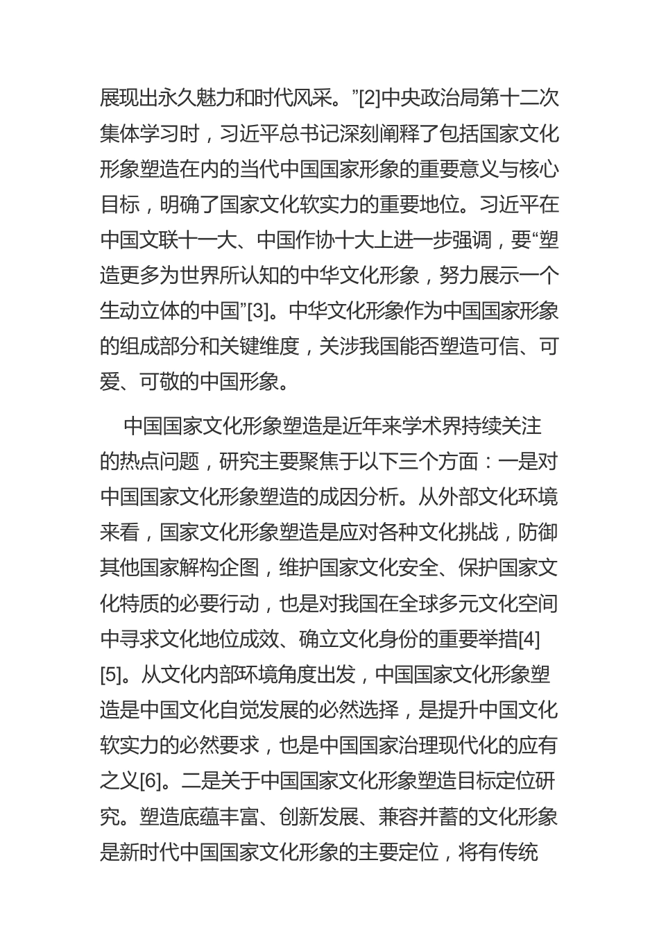 【党课讲稿】中国国家文化形象塑造:概念内涵、基本特征与价值意蕴一、引言文化吸引力作为一个国家的软实力已成为各国进一步发展的重要影响因素。早在1997年,亨廷顿在《文明的冲突》一文中提到,本世纪冲突的基本来源将不再是经济上的差异或者意识形态上的不同,而是各国之间的文化冲突。进入新世纪,一些硬实力强大的国家都在制定自己的文化传播战略,以增强其文化软实力。国家文化形象的塑造是文化传播的直接效果,有助于增强国家文化软实力,进而获得各国想要的经济利益和对世界政治局势的控制力或影响力[1]。我国作为发展中大国,也应顺应这一趋势,塑造自己的文化形象,进一步提升我国文化的国际影响力。事实上,我国就如何更好塑造国家文化形象这一问题已经展开了积极探索。党的十七届六中全会明确提出“建设社会主义文化强国”的战略目标,并将培育文化产业、扩大国际影响力纳入其中。党的十九大指出:“深入挖掘中华优秀传统文化蕴含的思想观念、人文精神、道德规范,结合时代要求继承创新,让中华文化展现出永久魅力和时代风采。”[2]中央政治局第十二次集体学习时,习近平总书记深刻阐释了包括国家文化形象塑造在内的当代中国国家形象的重要意义与核心目标,明确了国家文化软实力的重要地位。习近平在中国文联十一大、中国作协十大上进一步强调,要“塑造更多为世界所认知的中华文化形象,努力展示一个生动立体的中国”[3]。中华文化形象作为中国国家形象的组成部分和关键维度,关涉我国能否塑造可信、可爱、可敬的中国形象。中国国家文化形象塑造是近年来学术界持续关注的热点问题,研究主要聚焦于以下三个方面:一是对中国国家文化形象塑造的成因分析。从外部文化环境来看,国家文化形象塑造是应对各种文化挑战,防御其他国家解构企图,维护国家文化安全、保护国家文化特质的必要行动,也是对我国在全球多元文化空间中寻求文化地位成效、确立文化身份的重要举措[4][5]。从文化内部环境角度出发,中国国家文化形象塑造是中国文化自觉发展的必然选择,是提升中国文化软实力的必然要求,也是中国国家治理现代化的应有之义[6]。二是关于中国国家文化形象塑造目标定位研究。塑造底蕴丰富、创新发展、兼容并蓄的文化形象是新时代中国国家文化形象的主要定位,将有传统性和时代性的文化元素植入国家文化形象中,构建以“中国精神、中国气派、中国风格”为核心、传统与当代相兼容的国家文化形象[7][8],形成以誠信为基石、以与时俱进为时代特征以及和处共赢的文化形象体系[9]。三是关于中国国家文化形象塑造的举措。塑造良好的国家文化形象需立足于本国文化积淀和发展特色,以特有的文化精神和文化魅力为导向,吸引和感召受众,从而扩大中华文化的影响力。同时主动适应、吸纳最新科学技术的“科技引领”,与时俱进把握时局变化、乘势而动用好契机、检视自身强基固本、区分对象精准施策,才能建设新时代良好的中国文化形象[10][11]。不难看出,国内外学者已通过理论分析和案例分析的方法,对文化形象塑造的内外部成因、举措等进行了较为详细的阐述,取得了丰富的研究成果。但是尚缺乏从国家文化形象塑造的概念等关涉中国国家文化形象塑造的本源性问题出发来剖析和阐释其基本特征与价值意蕴的研究。鉴于此,本文尝试从国家文化形象塑造的概念内涵出发,阐述国家文化形象塑造的基本特征,揭示国家文化形象塑造的价值意蕴,以期为后续深化中国国家文化形象塑造的研究抛砖引玉。二、中国国家文化形象塑造的概念内涵从字面上看,中国国家文化形象塑造可分为“中国国家文化形象”和“塑造”两个层面。因此,应从这两个层面来理解中国国家文化形象塑造这一概念。关于“中国国家文化形象”的界定,可从认知评价角度、价值论维度、本质论角度展开。一是从认知评价角度来看,中国国家文化形象代表着中国国家的文化内涵与水平,通过一系列的文化成果体现出国家的文化风貌,是国内外公众对中国文化传统、价值观念、精神品格、行为模式等的认知和理解。二是从价值论的维度来看,中国国家文化形象是中国文化体系在发展和建设过程中所体现出来的价值。对内主要表现为国家文化形象的向心力和凝...