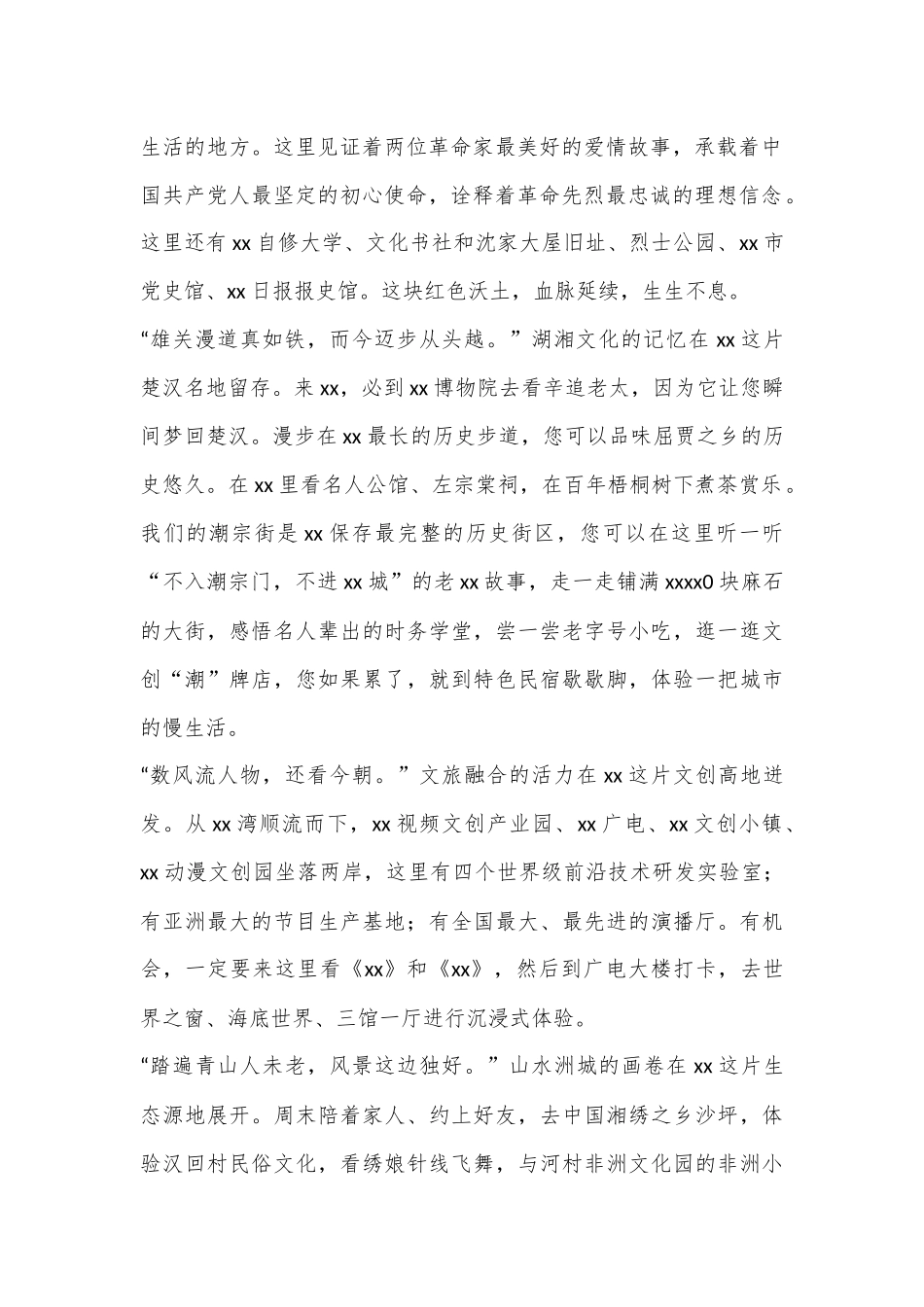 XX文化产业推介会致辞、讲话、发言汇编(10篇)目录1.推介会致辞22.推介会致辞53.推介会致辞74.推介会致辞95.推介会致辞116.推介会致辞137.推介会致辞158.推介会致辞179.推介会致辞1910.推介会致辞21推介会致辞大家上午好!快乐xx,韵味星城;开心福地,怎能不来。今天我很幸福,因为我能在这里为幸福xx代言。先有xx,后有xx城。xx因千年古刹xx寺而得名。中国共产党第一个省级支部在xx;创办最早的干部学校在xx;习近平总书记来xx考察,唯一去过的文化产业园区“中国V谷”也在xx。亲爱的朋友们,让我们一起走进幸福xx。“为有牺牲多壮志,敢教日月换新天。”中国革命的火种在xx这片伟人故地点燃。xx中共x区委员会旧址,是xx生活的地方。这里见证着两位革命家最美好的爱情故事,承载着中国共产党人最坚定的初心使命,诠释着革命先烈最忠诚的理想信念。这里还有xx自修大学、文化书社和沈家大屋旧址、烈士公园、xx市党史馆、xx日报报史馆。这块红色沃土,血脉延续,生生不息。“雄关漫道真如铁,而今迈步从头越。”湖湘文化的记忆在xx这片楚汉名地留存。来xx,必到xx博物院去看辛追老太,因为它让您瞬间梦回楚汉。漫步在xx最长的历史步道,您可以品味屈贾之乡的历史悠久。在xx里看名人公馆、左宗棠祠,在百年梧桐树下煮茶赏乐。我们的潮宗街是xx保存最完整的历史街区,您可以在这里听一听“不入潮宗门,不进xx城”的老xx故事,走一走铺满xxxx0块麻石的大街,感悟名人辈出的时务学堂,尝一尝老字号小吃,逛一逛文创“潮”牌店,您如果累了,就到特色民宿歇歇脚,体验一把城市的慢生活。“数风流人物,还看今朝。”文旅融合的活力在xx这片文创高地迸发。从xx湾顺流而下,xx视频文创产业园、xx广电、xx文创小镇、xx动漫文创园坐落两岸,这里有四个世界级前沿技术研发实验室;有亚洲最大的节目生产基地;有全国最大、最先进的演播厅。有机会,一定要来这里看《xx》和《xx》,然后到广电大楼打卡,去世界之窗、海底世界、三馆一厅进行沉浸式体验。“踏遍青山人未老,风景这边独好。”山水洲城的画卷在xx这片生态源地展开。周末陪着家人、约上好友,去中国湘绣之乡沙坪,体验汉回村民俗文化,看绣娘针线飞舞,与河村非洲文化园的非洲小伙伴翩翩起舞。特别是xx园林生态园的“花之谷·动趣王国”,萌宠动物可爱极了,期待您的亲近、渴望您的爱抚。“不管风吹浪打,胜似闲庭信步。”快乐xx的烟火气息在xx这片网红潮地浓郁。华灯初上,xx沿岸“灯光秀美”,脱口秀剧场“剧剧精彩”。四方坪夜市“热闹非凡”,天南海北的小吃美食齐聚于此,明星达人纷至沓来打卡,尽情享受人间烟火的浪漫。如今的xx,是开创新幸福的地方。我们正致力于建设更聚人气的全域文旅示范区,“馆园融合”项目已写入省委、省政府重要文件,“芒果城”概念、苏托垸项目、金霞新城令人期待;鹅羊山、山鹰潭、xx河夜游、三湘红街等项目正紧锣密鼓推进。“五色斑斓绣天下,开心福地润古今”。遇见xx,入眼的是风景,入脑的是幸福,入心的是人生,让我们共游开心福地,共赴幸福之约!谢谢大家!推介会致辞xx区是商贾云集的繁荣之区、文脉延绵的钟秀之区、创业创新的梦想之区。用一句话概括,不来有遗憾,来了会震撼。这里有“一揽全城”的高度。全省第一、第二高楼均矗立于此,站在xx中心xxx米之上,入住开在云端的xx酒店,可远眺xx、俯瞰xx,苍天近咫尺、手可摘星辰;百度数据xx第一、第二大热门购物中心均坐落于此,可来五一商圈、万家丽商圈,逛名店首店、买名品好物、看名展名会,在xx、观天下、买全球。这里有“一步千年”的烟火。三千年xx,城址未变,城心依旧,xx区是古今xx中心,历来为官街、文街、商街聚集之地。在官街打卡,这里可聆听xx第一官巷藩后街的“明清那些事”;来文街寻迹,这里可追寻苏洵苏轼父子足迹,杏花春雨,老泉别径;进商街探访,这里可感受宝南钱局开炉铸币、何其高光,登隆街、黄泥街昔时繁华、人潮依旧。漫步老街巷,感受穿越时空的贵气、文气、烟火气。这里有“一曲悠长”的唱和。随着袁家岭中央文化区布局建设,一个全省演艺文化的高地、城市音乐会客厅正从无声绽放到精彩蝶变。在省花鼓戏剧...