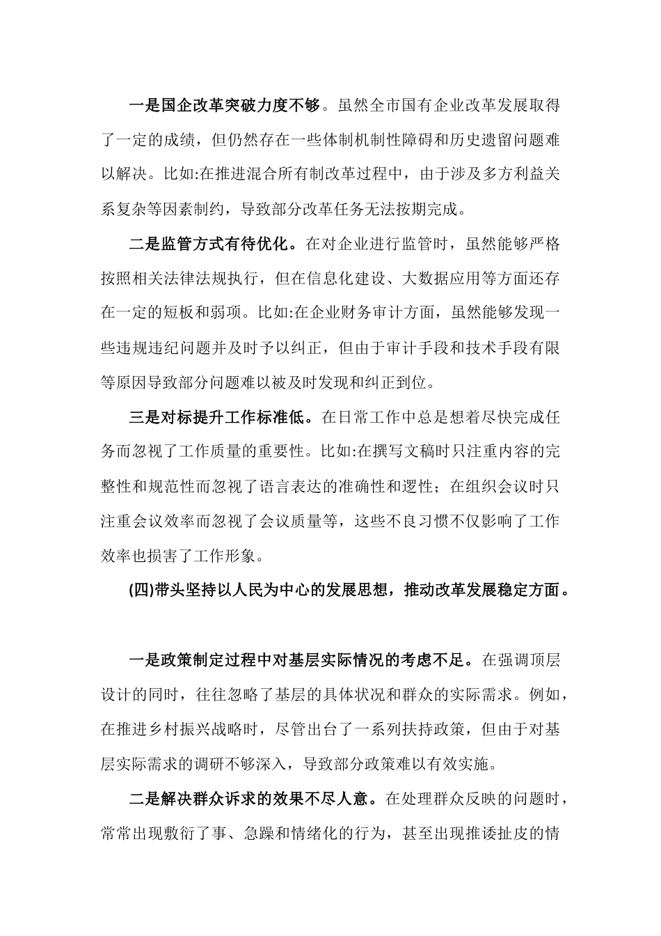 2025年民主生活会个人对照检查材料与2024年民主生活会(组织生活会)对照检查材料存在问题【两篇文】供参考2025年民主生活会个人对照检查材料根据市委统一部署,我深入学习了习近平新时代中国特色社会主义思想和党的二十届三中全会精神,重点研读了《习近平谈治国理政》第四卷等书目。坚持把自己摆进去、把职责摆进去、把工作摆进去,深刻查摆自身存在的差距和不足,深挖问题根源,明确整改措施,现对照检查如下:一、存在的问题(一)带头深刻领悟“两个确立”的决定性意义,增强“四个意识”、坚定“四个自信”、做到“两个维护”方面。一是学习的全面性还不够。对政治理论知识的学习缺乏全面系统的研究,存在实用主义倾向,特别是对一些新思想、新观点、新论断理解还不够透彻,有时仅满足于学过了、知道了,没有真正做到入脑入心。比如:在学习贯彻党的二十届三中全会精神中,虽然能够完成规定动作,但在跟进学习习近平总书记系列讲话精神等方面还有差距。二是学用转化效果不够好。在学习的过程中,没有很好地处理工学关系,存在任务观念强、重业务轻学习的思想,学习时间不够充足,没有处理好工学矛盾。比如:在推进国企改革三年行动方案落实过程中,由于日常事务繁忙等原因,对上级政策文件学习研究不深不透,导致部分政策措施落地见效不够明显。三是谋划工作落实还有差距。面对新时代国有企业改革发展稳定面临的新形势新任务新挑战,结合我市实际提出有针对性的思路举措还不够多,特别是在解决企业历史遗留问题方面,缺乏创新思维和有效手段,一定程度上影响了工作成效。比如:在推动国有企业高质量发展方面,虽然制定了一系列政策措施,但在具体实施过程中,由于协调配合不够紧等原因,导致部分政策落地效果不佳。(二)带头用马克思主义中国化时代化最新成果凝心铸魂方面。一是研讨发言感悟感受不够。在参加集体研讨时,只是简单地汇报了自己的学习和工作情况,没有深入地剖析自己的思想和灵魂深处。比如:在学习党的二十届三中全会报告时,只注重了解报告的主要内容和精神实质,没有深入思考如何将报告精神与实际工作相结合。二是对标对表查找问题不足。对于自己分管的工作领域和业务范围,虽然能够及时发现问题并积极协调解决,但对于其他领域的工作关注度不够高,不能做到全方位、多角度地进行自我检查和反思。比如:在开展党建工作时,虽然能够按照上级党组织的要求完成各项任务,但对于基层党支部的实际需求了解不够充分,导致部分工作效果不尽如人意。(三)带头坚持和加强党的全面领导方面。一是国企改革突破力度不够。虽然全市国有企业改革发展取得了一定的成绩,但仍然存在一些体制机制性障碍和历史遗留问题难以解决。比如:在推进混合所有制改革过程中,由于涉及多方利益关系复杂等因素制约,导致部分改革任务无法按期完成。二是监管方式有待优化。在对企业进行监管时,虽然能够严格按照相关法律法规执行,但在信息化建设、大数据应用等方面还存在一定的短板和弱项。比如:在企业财务审计方面,虽然能够发现一些违规违纪问题并及时予以纠正,但由于审计手段和技术手段有限等原因导致部分问题难以被及时发现和纠正到位。三是对标提升工作标准低。在日常工作中总是想着尽快完成任务而忽视了工作质量的重要性。比如:在撰写文稿时只注重内容的完整性和规范性而忽视了语言表达的准确性和逻性;在组织会议时只注重会议效率而忽视了会议质量等,这些不良习惯不仅影响了工作效率也损害了工作形象。(四)带头坚持以人民为中心的发展思想,推动改革发展稳定方面。一是政策制定过程中对基层实际情况的考虑不足。在强调顶层设计的同时,往往忽略了基层的具体状况和群众的实际需求。例如,在推进乡村振兴战略时,尽管出台了一系列扶持政策,但由于对基层实际需求的调研不够深入,导致部分政策难以有效实施。二是解决群众诉求的效果不尽人意。在处理群众反映的问题时,常常出现敷衍了事、急躁和情绪化的行为,甚至出现推诿扯皮的情况,这使得一些问题迟迟得不到解决,引起了群众的不满和失望,同时也损害了***的形象和威信。例如,在处理信访案件时,由于工作人员责任心不足、态度粗暴等问题,导...
