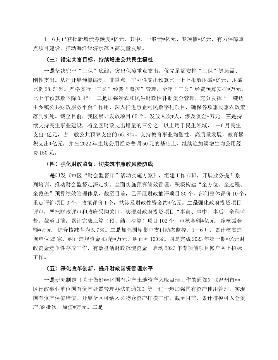 区财政局2023年上半年财政工作总结和下半年工作思路2023年上半年,区财政局紧紧围绕区委、区政府中心工作,全力以赴争要素、保平衡、强保障,为纵深推进产业聚变、城市蝶变、幸福跃变提供最大财力支撑。现将上半年工作总结和下半年工作思路汇报如下:一、上半年财政工作情况1-6月,全区财政总收入实现*万元,同比增长22.5%,完成年度任务的58.8%。一般公共预算收入*万元,同比增长17.9%,完成年度任务的59.9%。其中:税收收入*万元,同比增长58%,完成年度任务的61.6%,非税收入*万元,同比下降7.8%,完成年度任务的58.1%。税收收入占一般公共预算收入比重52.33%,比上年同期提高13.28个百分点。1-6月,全区一般公共预算支出*万元,同比增长52.33%,其中教育、社会保障和就业等民生支出12.67亿元,占一般公共预算支出的65.78%。(一)发挥政策效应,全力支持经济企稳回升一是贯彻落实“8+4”政策体系,整合“四张要素清单”,迭代更新稳主体稳就业系列政策,进一步提振市场信心,助推经济运行持续向好。继续落实留抵退税等组合式减税降费政策,1-6月累计留抵退税*亿元。二是优化营商环境,结合“万名干部进万企开展”“三服务”等专项行动,调研企业需求,宣传政策导向,指导企业开展政策申报,实现产业优惠政策兑现再提速。截至6月底,累计兑现各类惠企政策资金*万元,惠及企业193家。三是强化直达资金监管,紧抓“直达资金拨付速度,项目目标实现程度,预算执行进度”三个重点对直达资金项目实施动态监控,对执行过程中的偏差及时反馈、调整,确保直达资金精准投向。截至目前,我区共获直达资金*亿元,已支付*亿元,支付率53.1%。(二)挖掘增收潜力,稳步助推重大项目建设一是密切关注收入动态,及时研判分析财政收入形势,深化财税联动机制,加大税源培植力度,拓宽结构生财渠道,合理有序把握组织收入节奏。二是加强非税收入征管,坚持依法征收、规范执收、源头控收,确保实现非税收入应收尽收、应缴尽缴,实现停车场经营权出让等收入*亿元。三是积极向上争取资金,准确把握国家政策导向和支持重点,深入挖掘政策信息,最大限度争取政策倾斜和扶持,1-6月累计获得上级补助*亿元,其中省对市县一般性转移支付*亿元、税收返还*亿元、绿色转换激励奖补*万元。四是狠抓项目谋划储备,1-6月已获批新增债券额度*亿元,其中,一般债*亿元、专项债*亿元,有力保障重点项目建设,推动海洋经济示范区高质量发展。(三)锚定共富目标,持续增进公共民生福祉一是坚决兜牢“三保”底线,突出保障重点支出,优先足额安排“三保”等急需、刚性支出。从严开展预算编制,非重点、非刚性支出预算比一上上报数压减*亿元,压减比例28.51%。严格实行“三公”经费“双控”管理,全年“三公”经费预算安排*万元,比上年预算数下降0.4%。二是加强涉农和民生财政性补助资金管理,充分发挥“一键达+乡镇公共财政服务平台”作用,深入推进惠企利民数字化项目,确保各项惠民惠农政策落到实处。截至目前,我区累计发放项目65个,发放人次*人,涉及资金*万元。三是持续支持民生事业建设,将全区财政支出增量的三分之二以上用于民生领域,1-6月民生支出*亿元,占一般公共预算支出的65.8%。支持教育事业均衡性、高质量发展,教育累积支出*亿元,并在2022年生均公用经费普调50元的基础上,继续追加调增生均公用经费150元。(四)强化财政监督,切实筑牢廉政风险防线一是印发《**区“财会监督年”活动实施方案》,组建工作专班,开展业务提升系列培训,推动财会监督走深走实。全面实施预算绩效管理,积极构建“全方位、全过程、全覆盖”预算绩效管理体系,截至目前,已开展财政抽评项目30个,部门整体评价10个,重点评价项目3个,政策评价1个,共涉及财政性资金约*亿元。二是强化政府投资项目评审,严把财政评审和政府采购关口,实现对政府投资项目“事前、事中、事后”全程监督。截至目前,累计完成三算(预、结、决算)项目102个,审核金额*亿元,净核减金额*万元,综合核减率为5.7%。三是加强国库集中支付动态监控,1-6月,累计核实违规单位25家,纠正违规资金43笔*万元,纠正率100...