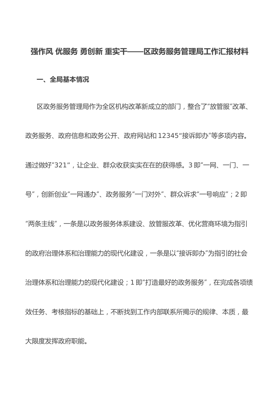强作风优服务勇创新重实干——区政务服务管理局工作汇报材料一、全局基本情况区政务服务管理局作为全区机构改革新成立的部门,整合了“放管服”改革、政务服务、政府信息和政务公开、政府网站和12345“接诉即办”等多项内容。通过做好“321”,让企业、群众收获实实在在的获得感。3即“一网、一门、一号”,创新创业“一网通办”、政务服务“一门对外”、群众诉求“一号响应”;2即“两条主线”,一条是以政务服务体系建设、放管服改革、优化营商环境为指引的政府治理体系和治理能力的现代化建设,一条是以“接诉即办”为指引的社会治理体系和治理能力的现代化建设;1即“打造最好的政务服务”,在完成各项绩效任务、考核指标的基础上,不断找到工作内部联系所揭示的规律、本质,最大限度发挥政府职能。二、政务服务体系建设情况(一)改革背景2015年5月12日,国务院召开全国推进简政放权放管结合职能转变工作电视电话会议,首次提出了“放管服”改革的概念,改革开始转向“简政放权、放管结合、优化服务”三管齐下,并将协调推进“放管服”改革作为优化营商环境、推动经济社会持续健康发展的战略举措。“放”:即简政放权,通过清理非许可审批事项,精简审批中介服务,精简前置审批事项,清理取消中央指定地方实施审批事项等措施,降低准入门槛;“管”:即创新监管,通过推行地方政府部门权力清单和责任清单制度、落实部门市场监管责任、推广“双随机”检查、建设全国统一的投资项目在线审批监管平台、打造以信用监管为核心的综合监管体系和推进市场监管的制度化、规范化、程序化,建设法治化市场环境等措施,促进公平竞争;“服”:即高效服务,通过推进审批标准化和智能化、改革优化投资项目审批流程、编制公共服务事项清单和办事指南,清理各类证明事项,推进线上线下办事大厅标准化和规范化建设等措施,加强“规范、公开、便民、高效”的政务服务体系建设,最大限度方便企业群众办事创业。(二)形势任务政务服务体系建设是“放管服”改革的重要内容,也是重塑政府和市场关系、刀刃向内的政府自我革命。我区政务服务体系建设起步晚、底子薄,与企业、群众期望存在很大差距,局党组先后多次通过参观学习、摸底调研、座谈交流等方式,找准差距和不足,明确三年工作计划。第一阶段:正视问题,实现自身跨越。明确2020年为政务服务改革攻坚年。紧盯市级2021年政务服务任务指标,强化政务服务信息化平台建设,贯通区、镇(街)村(居)三级政务服务体系,着力推动政务服务全程电子化,实现可在线咨询、可在线受理、可在线查询、可在线支付、可在线评价,推进多渠道智能化服务。第二阶段:精准发力,实现品质提升。明确2021年为政务服务品质提升年。认真分析政务服务短板,继续推进政务服务深化应用,聚焦企业群众办事方便、顺畅,打造政务服务品牌为目标,推动线上线下联动,实现企业群众到政府办事就像“网购”一样方便,增强企业群众的体验感满意度。第三阶段:与时偕行,实现功能飞跃。明确2022年为政务服务赶超飞跃年。引入更多的领先技术和手段,利用大数据、区块链、5G、人工智能等先进技术,围绕增强企业群众体验感,大幅提升政务服务的智能化、个性化服务,推动**政务服务飞速发展。(三)工作进展为实现三年工作计划,我局以“民有不便,服务必变”为服务宗旨,研究制定了1+5+N政务服务体系建设方案。即围绕一条主线,建成**区全要素政务服务体系,通过打造一支专业化的政务服务队伍、健全一套行之有效的政务服务保障制度、明确一套内容详实的政务服务任务清单、建成一个多端一体信息化网络平台、建设一批环境好、功能全、服务优的政务服务大厅(即:1支专业队伍、1套保障制度、1套任务清单、1个信息平台、1批实体大厅)5条路径,转化为N项具体举措构成的全要素“**1+5+N政务服务体系”,在合法依规的前提下,最大限度的利企便民,增强企业群众的体验感满意度。1.建成一支专业队伍。按照市政务服务标准化要求,落实“前台综合受理、后台分类审批、综合窗口出件”工作模式,以定人、定岗、定责的原则,配齐配强政务服务工作人员(含编内、编外、公益岗就业人员)。同时,...