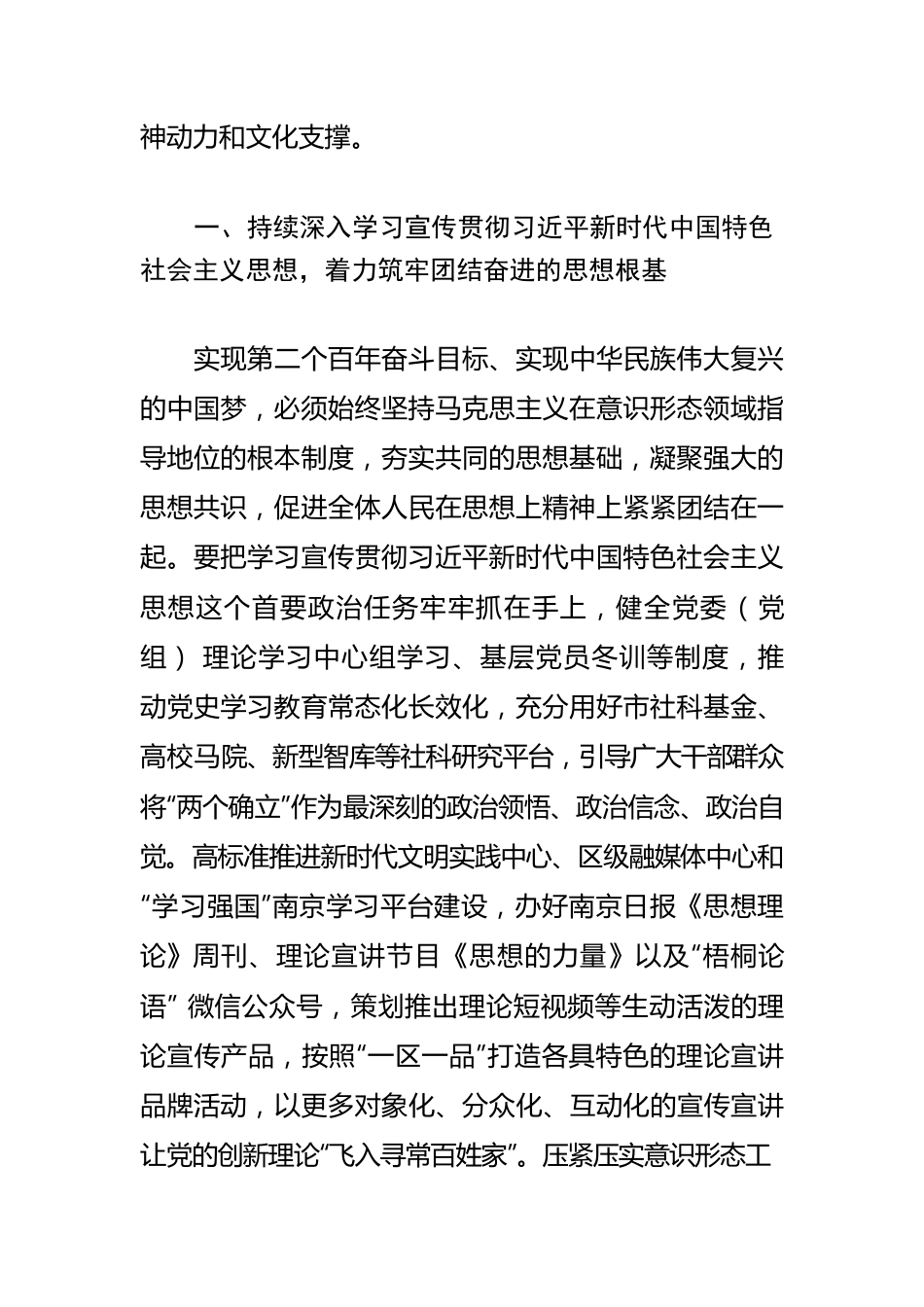 【宣传思想文化工作】展现建设社会主义文化强国先行区的南京力量建设社会主义文化强国,是建设社会主义现代化强国的重要内容,是实现中华民族伟大复兴的必然要求。江苏省第十四次党代会提出“建成社会主义文化强国先行区”的目标任务,对深入推进文化强省建设作出全面部署。面向全面建设社会主义现代化强国新征程,南京将坚持以习近平新时代中国特色社會主义思想为指导,深入贯彻习近平总书记对江苏工作重要指示精神和党中央重大决策部署,认真落实省第十四次党代会精神,围绕“举旗帜、聚民心、育新人、兴文化、展形象”使命任务,不断增强城市文化软实力、竞争力、影响力,聚力打造文化凝聚力和引领力强、文化事业和产业强、文化人才队伍强的文化强市,构筑思想文化引领高地、道德风尚建设高地、文艺精品创作高地,为建成社会主义文化强国先行区贡献南京力量,为全市扛起“争当表率、争做示范、走在前列”光荣使命、谱写“强富美高”新江苏现代化建设南京新篇章、全面建设人民满意的社会主义现代化典范城市提供强大思想保证、舆论支持、精神动力和文化支撑。一、持续深入学习宣传贯彻习近平新时代中国特色社会主义思想,着力筑牢团结奋进的思想根基实现第二个百年奋斗目标、实现中华民族伟大复兴的中国梦,必须始终坚持马克思主义在意识形态领域指导地位的根本制度,夯实共同的思想基础,凝聚强大的思想共识,促进全体人民在思想上精神上紧紧团结在一起。要把学习宣传贯彻习近平新时代中国特色社会主义思想这个首要政治任务牢牢抓在手上,健全党委(党组)理论学习中心组学习、基层党员冬训等制度,推动党史学习教育常态化长效化,充分用好市社科基金、高校马院、新型智库等社科研究平台,引导广大干部群众将“两个确立”作为最深刻的政治领悟、政治信念、政治自觉。高标准推进新时代文明实践中心、区级融媒体中心和“学习强国”南京学习平台建设,办好南京日报《思想理论》周刊、理论宣讲节目《思想的力量》以及“梧桐论语”微信公众号,策划推出理论短视频等生动活泼的理论宣传产品,按照“一区一品”打造各具特色的理论宣讲品牌活动,以更多对象化、分众化、互动化的宣传宣讲让党的创新理论“飞入寻常百姓家”。压紧压实意识形态工作责任制和网络意识形态工作责任制,完善风险研判、决策风险评估、风险防控协同机制,全面加强各类阵地管理,深化“扫黄打非”工作,做到明责任、重研判、强管理、善斗争,坚决维护政治安全、文化安全和意识形态安全。二、争创全国文明典范城市,推动形成适应新时代要求的思想观念、精神面貌、文明风尚、行为规范中国式现代化是物质文明和精神文明相协调的现代化,必须坚持社会主义核心价值观,深化文明培育、文明实践、文明创建,弘扬时代精神、树立时代新风、造就时代新人,促进人的全面发展与人的现代化。要加强中国特色社会主义和中国梦宣传教育,加强爱国主义、集体主义、社会主义教育,大力弘扬伟大建党精神,广泛弘扬党和人民在各个历史时期奋斗中形成的伟大精神。抓好《南京市红色文化资源保护利用条例》宣传和实施,推进中华民族文化基因库(一期)雨花台红色基因库建设,建好用好“中国南京红色在线”平台,持续深化“四史”宣传教育,广泛组织开展仪式感强的宣传教育活动,讲好红色故事、传承好红色基因。大力塑造和弘扬城市精神和市民精神,完善道德典型选树宣传机制,广泛开展南京榜样、最美人物、身边好人等评选,选树一批新时代的先锋、新时代的奋斗者,引导人们见贤思齐、崇德向善。深化拓展新时代文明实践中心建设,建好市志愿服务信息化平台,建强基层文明实践志愿服务队伍,充分发挥志愿服务队伍在党的创新理论宣讲、基层思想政治工作、移风易俗等方面的作用,在服务群众中更好强信心、聚民心、暖人心。深化“志愿之城”建设,培育塑造一批聚焦新时代文明实践、红色文化传承、疫情防控的志愿服务品牌,在国际志愿服务工作上努力探索创新经验。常态化开展各类群众性精神文明创建活动,推动文明城市创建指标融入各行业各部门工作标准和日常管理,不断探索特大城市治理的南京路径,全力争创全国文明典范城市。三、促进公共文化服...
