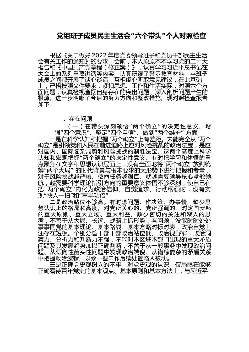 “”党组班子成员民主生活会六个带头个人对照检查根据《关于做好2022年度党委领导班子和党员干部民主生活会有关工作的通知》的要求,会前,本人原原本本学习党的二十大报告和《中国共产党章程(修正案)》,认真学习习近平总书记在大会上的系列重要等内容,真研了警示教育材料,与班子讲话认读成员之间都开展了谈心谈话,互相虚心听取意见建议,在此基础上,严格按照文件要求,紧扣思想、工作和生活实际,对照六个方面问题,认真检视查摆自身存在的突出问题,深入剖析问题产生的根源,一步明晰了今后的努力方向和整改措施,照告进现对检查报如下.、存在问题(一)“”在深刻悟两个确立的决定性意,增带头领义“”“”“强四个意识、坚定四个自信、做到两个维护”方面。“”“一是在科学认知和把握两个确立上有差距。未能完全从两个”确立是引领党和人民在前进道路上应对风险挑战的政治法宝,是应国内、国复局和挑的制法宝,两个高度上科学对际杂势风险战胜这“”知和宏把握两个确立的决定性意,有把学和体悟的重认观义时习“”点聚焦在文字和思想认识层面上,没有全面地将两个确立放到统“筹两个大局”的时代背景与根本要求的大形势下进行把握和考量,于挑越峻,使命任越巨,就越需要核心掌舵对风险战严务艰领导领航,越需要科学理论指引方向的重要意义体悟不够深刻,使自己在“”把两个确立内化为政治信仰、自觉追求、行动纲领时,没有实“”“”现快人一拍和事半功倍二是政治站位不高。有想、作决策、事情,缺少思够时问题办想上的格局和高度,党所关心的、党所的,定国安邦认识对强调对的重大原、重大立、重大利益,缺少密切的关注和深入的思则场考,不善于从大局、长远、战略上抓形势,看问题,没能时时处处事事同党的基本理论、基本路线、基本方略对标对表,政治自觉上还存在短板。个别分管干部干部政治站位低、政治视野窄,政治洞察力、分析力和判断力不强,不能对本区域本部门出现的重大矛盾问题及其发展趋势加以正确判断,不善于从一般事务中发现政治问题、从倾向性苗头性问题中发现政治端倪、从错综复杂的矛盾关系中把握政治,以致一些工作后置陷入被。逻辑续处动三是正确党史观树立的不牢。对党史观的认识,仅局限在能够正确看待百年党史的基本观点、基本原则和基本方法上,与习近平正确党史的重要要求相比,在略高度、史深度总书记对观战历和全局角度上把握的不够到位。比如,对党史的学习、了解、领会多,在实际工作中,运用、贯彻、落实少,未真正把党史学习成效转化为服务保障工作的实际成果,特别是在疫情严峻的特殊时期、“”办文办会任务繁重的情况下,遇到难啃的硬骨头时,从党史中找“”“”经验、寻对策还不够,发挥党史的教科书营养剂作用不充分。(二)在用近平新代中国特色社会主思想凝带头习时义心铸魂方面。一是对贯穿习近平新时代中国特色社会主义思想中的立场观点方法把握不系。学研究近平新代中国特色社会主思够统习习时义“”“”“想,往往将重点放在了十个明确十四个持十三个方面成坚”就等具体内容上,主观上认为只要把这些关键性的内容学深悟透,就可以实现学思用贯通、知信行统一。因此,将主要精力放在了用“”“心体悟其中的具体内容上,如:十个明确的具体所指是什么?十”“”四个坚持科学内涵是什么?十三个方面成就到底包含什么内容?但很少能够沉下心来,对三者之间的辩证统一关系,以及习近平新代中国特色社会主思想的形成、展程,行系性的思考时义发历进统“”研究,特另刂是面对二十大报告提出的个坚持的重大理论创新,由于之前具有一关系的一系列科学理没有研深悟时对辩证统论透,使自己缺少统筹兼顾、科学把握的理论底蕴和政治能力,不能及有效地理解、把握和消化穿其中的立点方法,作时贯场观为领导干部,对照中央和文件的要求,实事求是地讲,自己在学用结合上存在虚化弱化象,未能达到体代性、把握律性、富于造现现时规创性的高标准要求。二是践行近平新代中国特色社会主思想的能力习时义有待提高。全面贯彻习近平新时代中国特色社会主义思想成果筹划不,化效率不高,以党的新理指履行核心能统谋够转创论导职不够到位。虽然在学...