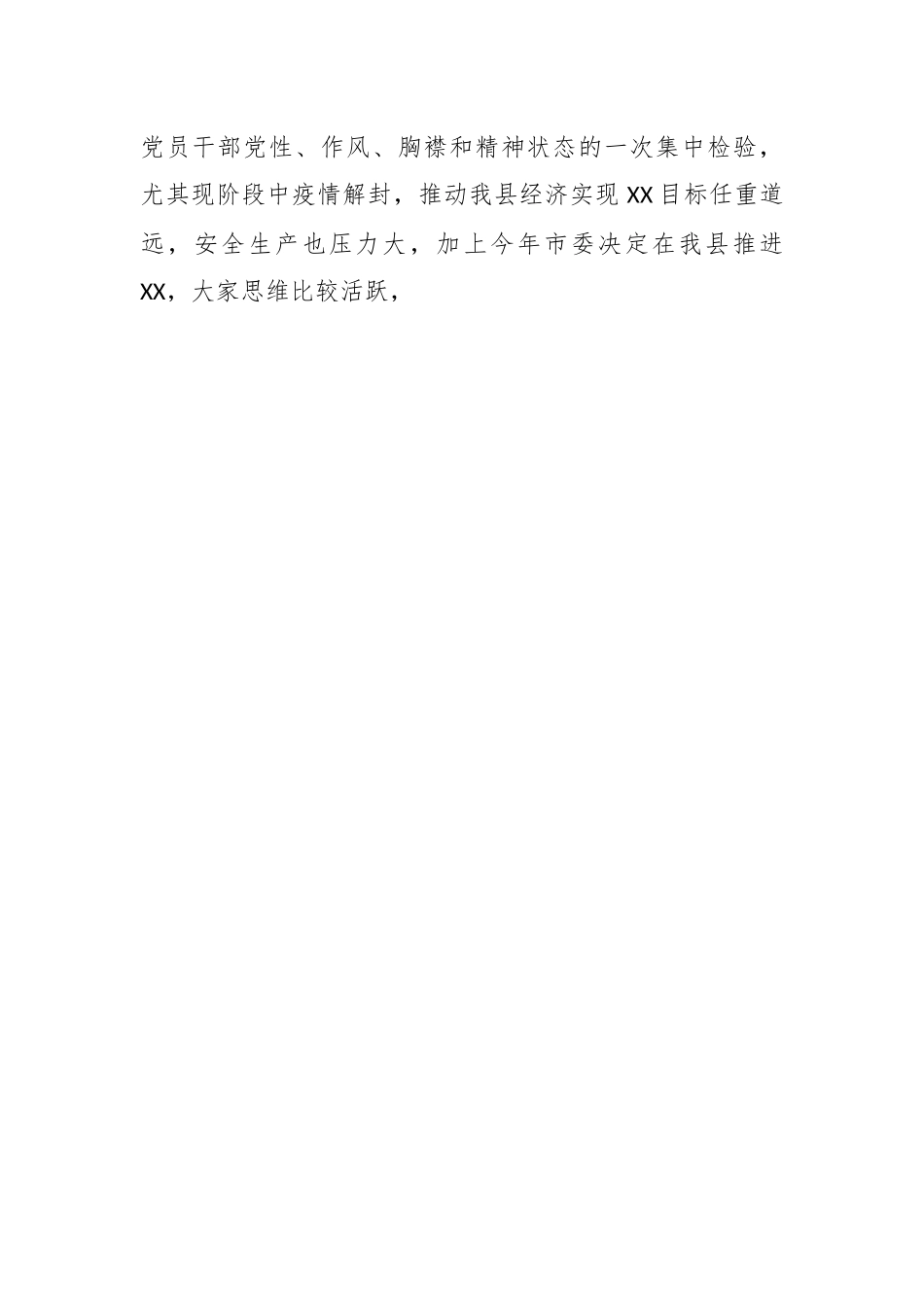 XX县委书记个人在本年度民主生活会上的主持词尊敬的XX同志:我县党委委员应到X人,实到X人,X同志列席参加会议,符合开会规定人数,会议是否开始!〔请示XX市常务副市长XX同志后〕各位委员,根据工作安排,今天我们召开县党委2022年民主生活会。XX同志在百忙之中莅临指导这次会议,是对我们班子的关心厚爱,是对我们工作的巨大鼓舞和鞭策,是对我们的偏爱,在此,我代表县党委,对XX同志的莅临指导表示衷心的感谢!为了开好这个会,我们前期专门召开党委会进行了研究部署,在组织理论学习、筹划准备的基础上,又广泛征求了机关、基层和群众的意见建议,班子成员之间也进行了深入的谈心谈话,交换了意见看法,大家认真撰写对照剖析材料,我们进行了审查把关,应该说,会议准备是严肃、认真和比较充分的,在这里就开好这次专题民主生活会,提三点要求:一要端正态度。开好专题民主生活会,是对党员干部党性、作风、胸襟和精神状态的一次集中检验,尤其现阶段中疫情解封,推动我县经济实现XX目标任重道远,安全生产也压力大,加上今年市委决定在我县推进XX,大家思维比较活跃,开好这次专题民主生活会意义特殊且重大。希望大家借此机会,拿起批评和自我批评这个武器,摆正心态、敞开心扉、刀口向内、坦诚相见,真正在专题民主生活会中得到锻炼和提高。二要精准画像。民主生活会主要是讲问题的因此大家要开门见山,抓住要害,敢讲真话,敢说实话,集中主题查摆问题。要强化问题意识,坚持问题导向,自我批评不评功摆好,相互批评不绕弯子,直说问题,真正触及思想和灵魂。三要民主团结。要始终出于公心、出于善意、出于真心,诚心诚意地帮助同志找问题、查病因、治治病,既要有红红脸、出出汗的紧张与严肃,又要有加加油、鼓鼓劲的宽松与和谐,共同努力把这次生活会,开成求真务实、解决问题、发扬民主、增进团结、锻炼党性的会议,确保实现更高层次的团结。按照计划安排,这次民主生活会共有五项内容:一是讲评2021年度民主生活会检视问题整治情况和征求意见情况。二是党委班子作对照检查。三是班子成员逐一进行对照检查,作自我批评,其他成员对其提出批评意见。四是总结会议情况,提出整改工作要求。五是请XX同志讲话。首先,进行第一项议程,由我讲评2021年度民主生活会检视问题整治情况和征求意见情况。XXXXXXXXXXXXXXXXXXX〔征求意见情况〕按照要求,会前认真征求了机关、基层和群众的意见建议对群众反映集中的问题,均已纳入《XX党委检视反思问题清单》。XXXXXXXXXXXXXXXXXXX下面,进行第二项议程,由我代表班子作对照检查。XXXXXXXXXXXXXXXXXXX下面,进行第三项议程,主要采取“个人讲、大家评、逐个过”的办法,班子成员逐一进行对照检查,作自我批评其他成员对其提出批评意见。下面,我先作剖析发言。〔党委书记自我剖析〕以上是我的剖析发言,不妥之处,请同志们批评帮助。XXXXXXXXXXXXXXXXXXX〔大家的批评结束后〕刚才,大家对我进行了严肃认真的批评,提出了很多中肯的意见建议,我虚心接受,认真对照问题不足,加以改正接下来,按照XX同志、XX同志、XX同志、XX同志、XX同志、XX同志、XX同志、XX同志的顺序发言。每名同志自我剖析结束后,大家依次进行批评帮助,剖析的同志要进行表态发言。下面请XX同志发言。XXXXXXXXXXXXXXXXXXX下面,进行第四项议程,由我总结会议情况一会XX同志还要作具体指示要求,下面我简要总结一下会议情况。一是准备比较充分。会前,大家能够认真对照《方案》内容,积极征求意见、深入交换思想,搞好对照检查,撰写发言材料,从大家的发言质量来看,态度是端正的,思考是深入的,问题找的是实在的。二是剖析比较深刻。大家紧密联系思想和工作实际,深入查问题、挖根源,敢于亮家丑、说真话、讲实情,批评的很客观、很具体,没有遮遮掩掩,确实向组织交了心、亮了底。三是批评比较坦诚。对同志的批评上,大家出于公心,不绕圈子直点问题,态度诚恳、真批实帮,较好地体现了党内生活的原则性战斗性,也起到了红脸出汗的效果。会后大家要抓好以下两个方面整改提高工作:一是认真反思。针对自己查找的、同志们指出的问题,坚持有则改之、无则加勉不断...