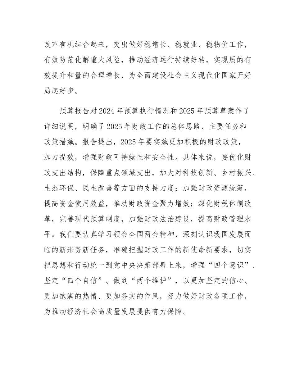 财政局局长在理论学习中心组会上学习2025年全国两会精神研讨发言材料同志们:刚刚闭幕的全国两会,是在全面贯彻落实党的二十大精神开局之年、深入推进中国式现代化建设的关键时期召开的一次重要会议,是一次民主、团结、求实、奋进的大会。两会期间,总书记发表了一系列重要讲话,对推进中国式现代化、推动高质量发展、增进民生福祉等作出了新的重大部署,为我们做好各项工作指明了前进方向、提供了根本遵循。政府工作报告明确了2025年经济社会发展的总体要求、主要目标和重点任务,对财政工作提出了新的更高要求。下面,围绕学习贯彻全国两会精神,结合财政工作实际,我谈几点体会,以供同志们参考。一、深刻领会全国两会精神,切实把思想和行动统一到党中央决策部署上来今年全国两会是在我国发展进入战略机遇和风险挑战并存、不确定难预料因素增多的时期召开的一次重要会议。会议全面贯彻党的二十大和二十届二中、三中全会精神,审议通过了政府工作报告、预算报告等重要文件,批准了2025年国民经济和社会发展计划,选举和决定了新一届国家机构和全国政协领导人员,圆满完成了各项议程,取得了丰硕成果。特别是总书记全票当选为中华人民共和国主席、中华人民共和国中央军事委员会主席,充分反映了全党全军全国各族人民的共同愿望和心声,极大鼓舞和激励亿万人民更加紧密地团结在以同志为核心的党中央周围,为实现强国建设、民族复兴的宏伟目标共同奋斗。政府工作报告全面总结了过去一年的工作,客观分析了当前面临的形势和问题,明确提出了2025年经济社会发展的总体要求、主要目标和重点任务,体现了稳中求进的工作总基调,彰显了推动高质量发展的坚定决心,回应了人民群众的关切和期待。报告指出,今年要坚持稳中求进工作总基调,完整、准确、全面贯彻新发展理念,加快构建新发展格局,着力推动高质量发展,更好统筹质的有效提升和量的合理增长,更好统筹经济质的持续提升和量的合理增长,更好统筹供给侧结构性改革和扩大内需,更好统筹经济政策和其他政策,更好统筹国内循环和国际循环,更好统筹当前和长远,全面深化改革开放,大力提振市场信心,把实施扩大内需战略同深化供给侧结构性改革有机结合起来,突出做好稳增长、稳就业、稳物价工作,有效防范化解重大风险,推动经济运行持续好转,实现质的有效提升和量的合理增长,为全面建设社会主义现代化国家开好局起好步。预算报告对2024年预算执行情况和2025年预算草案作了详细说明,明确了2025年财政工作的总体思路、主要任务和政策措施。报告提出,2025年要实施更加积极的财政政策,加力提效,增强财政可持续性和安全性。具体来说,要优化财政支出结构,保障重点领域支出,加大对科技创新、乡村振兴、生态环保、民生改善等方面的支持力度;加强财政资源统筹,提高资金使用效益,推动财政资金聚力增效;深化财税体制改革,完善现代预算制度,加强财政法治建设,提高财政管理水平。我们要认真学习领会全国两会精神,深刻认识我国发展面临的新形势新任务,准确把握财政工作的新使命新要求,切实把思想和行动统一到党中央决策部署上来,增强“四个意识”、坚定“四个自信”、做到“两个维护”,以更加坚定的信心、更加饱满的热情、更加务实的作风,努力做好财政各项工作,为推动经济社会高质量发展提供有力保障。二、认真落实积极财政政策,为经济社会发展提供有力支持2025年是全面贯彻落实党的二十大精神的开局之年,是实施“十四五”规划承前启后的关键之年,也是应对疫情冲击、推动经济恢复发展的重要一年。做好今年财政工作,要以新时代中国特色社会主义思想为指导,全面贯彻党的二十大和二十届二中、三中全会精神,认真落实中央经济工作会议部署,坚持稳中求进工作总基调,完整、准确、全面贯彻新发展理念,加快构建新发展格局,着力推动高质量发展,更好统筹质的有效提升和量的合理增长,更好统筹经济质的持续提升和量的合理增长,更好统筹供给侧结构性改革和扩大内需,更好统筹经济政策和其他政策,更好统筹国内循环和国际循环,更好统筹当前和长远,全面深化改革开放,大力提振市场信心,把实施扩大内需战略同深化供给侧结...