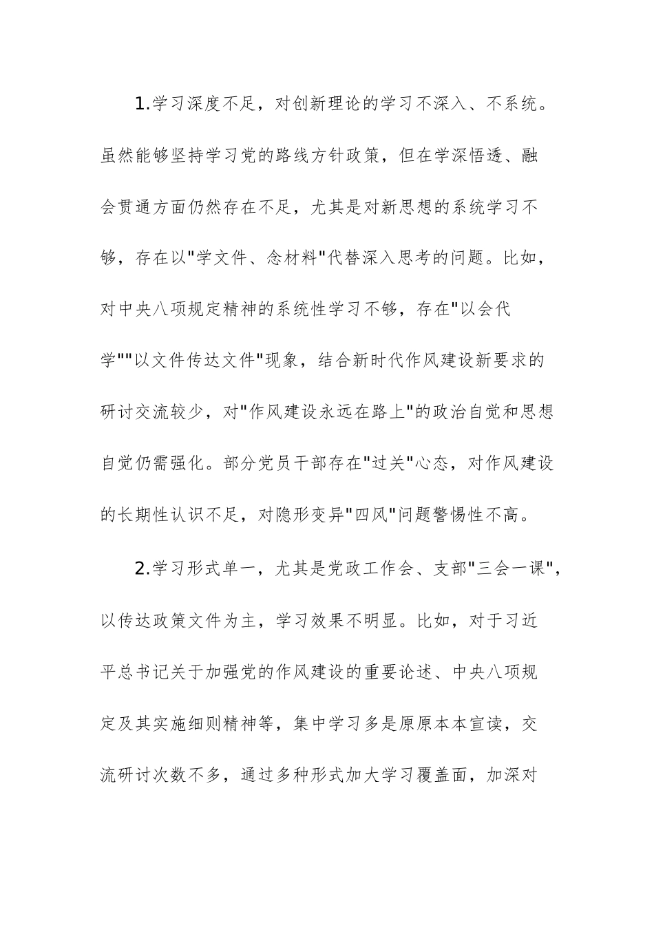 2025年深入贯彻中央八项规定精神学习教育查摆问题清单及整改措施供参考根据党委关于开展中央八项规定精神学习教育查摆问题相关通知精神,局党组在认真学习习近平总书记最新重要讲话和重要指示批示精神,以及中央八项规定及其实施细则精神的基础上,坚持边学习边检视,对照违反中央八项规定及其实施细则清单,逐一查摆在工作作风、工作执行、制度建设等方面存在的问题,全面查摆存在的突出问题,制定整改措施,明确整改责任和时限,形成如下问题清单及整改方案。一、对照查摆存在的主要问题(一)理论学习与思想认识方面1.学习深度不足,对创新理论的学习不深入、不系统。虽然能够坚持学习党的路线方针政策,但在学深悟透、融会贯通方面仍然存在不足,尤其是对新思想的系统学习不够,存在以"学文件、念材料"代替深入思考的问题。比如,对中央八项规定精神的系统性学习不够,存在"以会代学""以文件传达文件"现象,结合新时代作风建设新要求的研讨交流较少,对"作风建设永远在路上"的政治自觉和思想自觉仍需强化。部分党员干部存在"过关"心态,对作风建设的长期性认识不足,对隐形变异"四风"问题警惕性不高。2.学习形式单一,尤其是党政工作会、支部"三会一课",以传达政策文件为主,学习效果不明显。比如,对于习近平总书记关于加强党的作风建设的重要论述、中央八项规定及其实施细则精神等,集中学习多是原原本本宣读,交流研讨次数不多,通过多种形式加大学习覆盖面,加深对学习内容的理解做得不到位。(二)工作作风方面1.调研前未充分听取基层意见,调研内容与实际需求"两张皮",提出的对策建议缺乏针对性,成果转化不足。比如,调研过程中安排时间紧凑,没有沉下心来耐心倾听,更多的是在走马观花,蜻蜓点水,没有深入到实际当中,更没有深入到群众当中。调研后对问题的梳理分析不够深入,存在"调而不研、研而不用"现象,对调研中发现的共性问题和典型案例,未能形成长效解决机制,导致同类问题反复出现。2.面对复杂任务存在畏难情绪,缺乏勇于担当、敢于负责的精神,工作推进存在"等靠要"现象,缺乏主动思考和解决问题的能力。比如,工作标准偏低,制度执行缺乏严格性。有些紧急工作仅满足于一般化、随波逐流。个别会议记录程序过度简化,在涉及人事议题工作,班子成员未对任免干部的个人能力、工作作风等方面进行客观评价。(三)纪律执行方面1.制度更新不及时,有些制度未能及时根据中央八项规定精神最新要求进行修订,体现过紧日子的思想不突出。比如,考勤制度,仍然规定有加班发放补助的条款,虽然在实际执行中没有发放补助,但与中央八项规定精神明显违背的条款,没有及时更新,无法适应新形势下作风建设需求。。2.监督制度执行不到位,对重点岗位、关键环节监督不到位,难以做到问题早发现、早处置。比如,对发现的违反中央八项规定精神问题,处理偏软、偏轻,未能形成足够震慑力,导致个别干部心存侥幸,违规行为屡禁不止。对干部"八小时外"生活圈、社交圈关注不足,个别干部存在违规参加老乡会、接受管理服务对象宴请等问题。(四)长效机制建立方面1.对历史遗留问题整改不彻底,存在"运动式整改"倾向,长效机制未有效运转。比如,对于理论学习形式单一方面,通过巡视巡查整改、民主生活会等提出,纳入整改计划,但是整改效果不明显,没有真正起到促进学习、提升政治素质的作用。又如,对上级决策部署存在"选择性落实""象征性执行",对重点任务跟踪问效不严,存在"重部署、轻落实"现象,导致部分工作进展缓慢、成效不佳。2.作风建设虚化,执行效率低下,重点任务落实缺乏"钉钉子"精神,导致工作成效与预期目标存在差距。比如,面对改革发展中的难点问题,存在"推诿扯皮""绕道走"现象,缺乏攻坚克难的勇气和魄力。个别干部"躺平"思想抬头,工作满足于"过得去",对高质量完成任务的标准要求不高。又如,个别干部存在迟到早退、擅自离岗现象,外出报备制度执行不严格,工作时间从事与业务无关活动,影响机关整体工作氛围。二、问题整改措施(一)加强理论学习,提升政治素养。一是丰富学习形式和内容。制定详细的学习计划,组织党员深入学习八项规定精神及相关政策法规。...