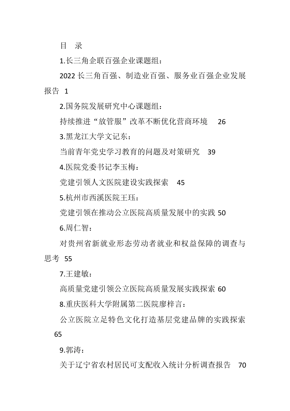 目录1.长三角企联百强企业课题组:2022长三角百强、制造业百强、服务业百强企业发展报告12.国务院发展研究中心课题组:持续推进“放管服”改革不断优化营商环境263.黑龙江大学文记东:当前青年党史学习教育的问题及对策研究394.医院党委书记李玉梅:党建引领人文医院建设实践探索455.杭州市西溪医院王珏:党建引领在推动公立医院高质量发展中的实践506.周仁智:对贵州省新就业形态劳动者就业和权益保障的调查与思考557.王建敏:高质量党建引领公立医院高质量发展实践探索608.重庆医科大学附属第二医院廖梓言:公立医院立足特色文化打造基层党建品牌的实践探索659.郭涛:关于辽宁省农村居民可支配收入统计分析调查报告7010.中共中央党校党的建设教研部姬旭辉:关于内蒙古乌审旗以党建引领绿色低碳高质量发展的调研报告7311.柳飞:关于提升基层经办能力服务的几点思考基于江西上饶市德兴、广丰的调研8312.吉林工商学院张献莹:国有企业资产管理问题及对策研究8613.山东能源枣矿集团公司王志:加强国有企业党的思想政治工作的探索与实践9214.内蒙古师范大学经济管理学院郭雅楠:金融支持乡村振兴战略存在的问题及对策9515.省委宣传部李世元:开展全民阅读建设书香青海青海基层开展全民阅读工作的调研报告10116.南京银行信息技术部张银川:南京银行数字化赋能探索与实践10617.哈尔滨师范大学王思祺:农业农村数字经济发展存在的问题及对策10918.自治区人民政府发展研究中心课题组:努力走出具有广西特色的绿色发展之路11419.光明日报调研组:善教乐学“思政课”润心立德育新人内蒙古大力推进大中小学思政课一体化建设的实践探索11720.江苏百村联合调研组:沭阳县庙头镇聚贤村:花木+电商,铺就富民路12421.江苏百村联合调研组:沭阳县钱集镇石桥村:和睦乡邻,一起敲开致富门12822.浙江工商大学杭州商学院叶邵勇:数字乡村建设的问题与对策研究基于杭州区市县的案例13123.郝光辉:双循环背景下大学生村官现状调查与思考以广西柳州市、桂林市和河池市为例13624.江苏百村联合调研组:宿迁市洋河新区六里棚村:借势发展,强村富民开新篇14425.经济日报调研组:太原转型14726.李霞:唐山职业教育产教融合现状的调查与思考16127.中共铁岭市委党校田畅:铁岭市乡村基层治理存在的问题及其对策16928.江苏百村联合调研组:统筹“新”和“旧”,共筑富强梦从基层实践看乡村产业振兴17429.青海民族大学虞幸武:突发公共事件中政府信息公开制度的调查与思考17930.襄阳市财政局课题组:推动襄阳都市圈高质量发展的财政对策研究18431.五邑大学政法学院吴志锋:乡村多元矛盾纠纷化解机制的实践探索以广东省江门市新会区大鳌镇为例19332.安徽开放大学经济与管理学院李如:乡村振兴战略背景下太和县金融扶贫实践探索19833.中共石家庄市委党校课题组:新发展格局下石家庄都市圈建设研究20534.“都市型乡村产业融合发展模式研究”课题组:新模式、新业态助推“美丽乡村”转向“美丽经济”上海乡村产业融合的实践与经验21235.山东能源集团张艳丽:新形势下国有企业加强意识形态工作的探索与实践21836.莱州市农业综合开发服务中心张杰:烟台市县域农作物秸秆综合利用的探索与实践22237.新疆农业大学刘倩汝:易地扶贫搬迁后续发展问题与对策22738.沧州师范学院邵晓琳:优化营商环境促进企业创新关于沧州营商环境和企业创新评价的调研报告23339.光明日报调研组:与象比邻,共享绿色家园云南探索人与自然和谐共生的现代化样本24940.东北财经大学管理科学与工程学院王虹懿:在基层治理中运用大数据面临的问题与对策以湖北省荆门市为例25641.董晰:政府机关购买后勤服务的实践与探索26242.山东省菏泽市巨野县人力资源和社会保障局张钰灿:中小企业融资存在的问题与对策分析26643.赵智:2022长三角百强、制造业百强、服务业百强企业发展报告长三角企联百强企业课题组2021年,世界经济复苏乏力,海外新冠肺炎疫情持续不退,国内疫情呈现多点散发,企业发展环境面临深刻复杂的变化。长三角三省一市百强企业面对严峻复杂的经济形势,坚决贯彻落实党中央、国务院的决策部署,在各省市党委、政府领导下,克服困难,逆...