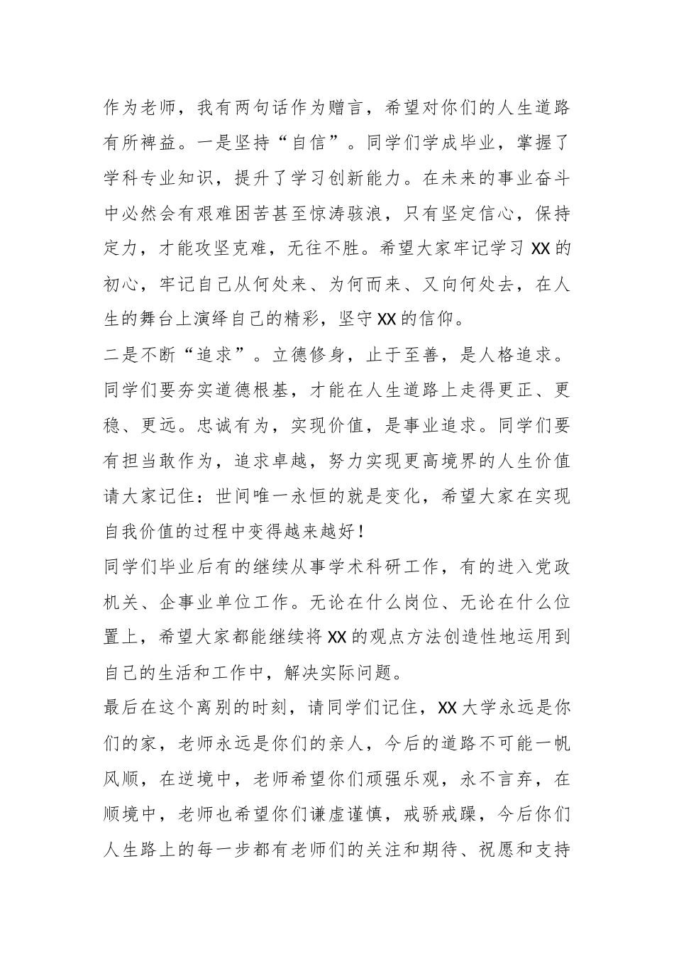 2023届关于导师代表在XX学院毕业典礼上的讲话亲爱的同学们:又是一年盛夏,XX校园里绿树成荫、万物盛放。每年的六月既是收获的季节,也是送别的时刻。大学时光转瞬即逝今天,XX大学XX学院2023届的同学们顺利完成了自己的学习生涯,即将开启一段新的人生旅程。在这里,我代表XX大学XX学院全体导师向全体毕业生同学表示热烈的祝贺!临别之际,作为老师和XX大学2006届的毕业生有几句话与大家共勉。这些年,无论走到哪里,总会听别人提起XX院的毕业生博学善思、有理想,敢担当。概括起来,就是我们XX大学的校训——博学而笃志,切问而近思。博学是从各方面广博地去学习,以开拓知识的范围,笃志是向远处大处立个志向,立了志向,就要坚定不移,切问是切切实实的问,近思是由近及远地想。我想,对于同学们来说,博学而笃志切问而近思,是学术科研上的精益求精,是在任何时候、任何地方、任何岗位、任何环境中都胸怀天下、心系人民都能沉得下去、顶得上来,都始终保持“眼睛向下”“精神向上”,不断追求卓越。作为老师,我有两句话作为赠言,希望对你们的人生道路有所裨益。一是坚持“自信”。同学们学成毕业,掌握了学科专业知识,提升了学习创新能力。在未来的事业奋斗中必然会有艰难困苦甚至惊涛骇浪,只有坚定信心,保持定力,才能攻坚克难,无往不胜。希望大家牢记学习XX的初心,牢记自己从何处来、为何而来、又向何处去,在人生的舞台上演绎自己的精彩,坚守XX的信仰。二是不断“追求”。立德修身,止于至善,是人格追求。同学们要夯实道德根基,才能在人生道路上走得更正、更稳、更远。忠诚有为,实现价值,是事业追求。同学们要有担当敢作为,追求卓越,努力实现更高境界的人生价值请大家记住:世间唯一永恒的就是变化,希望大家在实现自我价值的过程中变得越来越好!同学们毕业后有的继续从事学术科研工作,有的进入党政机关、企事业单位工作。无论在什么岗位、无论在什么位置上,希望大家都能继续将XX的观点方法创造性地运用到自己的生活和工作中,解决实际问题。最后在这个离别的时刻,请同学们记住,XX大学永远是你们的家,老师永远是你们的亲人,今后的道路不可能一帆风顺,在逆境中,老师希望你们顽强乐观,永不言弃,在顺境中,老师也希望你们谦虚谨慎,戒骄戒躁,今后你们人生路上的每一步都有老师们的关注和期待、祝愿和支持最后,衷心地希望你们把所学的知识与实践紧密结合起来,努力拼搏做出成绩回报社会,回报母校,谢谢大家!
