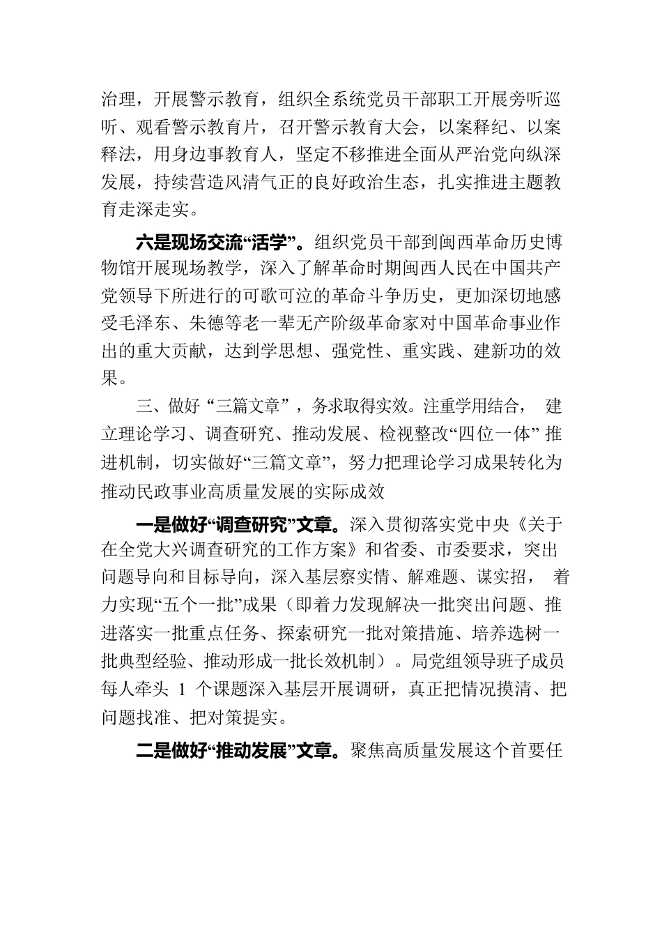 主题教育开展以来,龙岩市民政局党组深入学习贯彻习近平新时代中国特色社会主义思想和党的二十大精神,按照党中央关于主题教育的部署和省委、市委工作要求,以更高的标准、更严的要求、更实的措施推动民政系统主题教育高质量开展。一、落实“三个到位”,统一思想意志。坚持早准备、早安排、早部署,切实做到“三个到位”一是组织到位。召开局党组会议,深入学习贯彻习近平总书记在中央政治局集体学习、主题教育工作会议上对开展主题教育发表的系列重要讲话,及时传达学习贯彻中央和省委、市委主题教育工作会议精神。在市委主题教育第4联络组指导下,召开全局学习贯彻习近平新时代中国特色社会主义思想主题教育动员部署会,进行周密部署。成立以局党组书记为组长的主题教育领导小组,并下设办公室,统筹推动落实。二是谋划到位。对标对表习近平总书记重要讲话精神和中央及省委、市委部署要求,结合民政实际研究制定开展主题教育的“1+N”实施方案(即市民政局主题教育实施方案,理论学习方案、调查研究方案、检视整改方案等),确保主题教育“规定动作”做到位、“自选动作”有特色。三是宣传到位。在局网站开设主题教育专栏,通过“龙岩民政”微信公众号等拓展宣传渠道,协调融媒体中心等主流媒体平台宣传报道,营造良好氛围。二、坚持“六学联动”,奋力凝心铸魂。注重理论学习,坚持“六学联动”,不断把主题教育引向深入一是以上率下“领学”。9月以来,局党组召开3次理论学习中心组学习会议,开展2次专题研讨,举办1期读书班,认真学习习近平总书记有关主题教育系列重要讲话,以高度的政治自觉精心谋划推进主题教育各项任务落实。二是原原本本“精学”。及时为党员干部配发中央确定的8种学习材料和《习近平在福建》等福建特色学习材料,落实每两周集中学习制度,组织党员干部读原文、悟原理,夯实思想根基。三是融会贯通“深学”。把学习贯彻习近平总书记有关主题教育系列重要讲话,与学习贯彻习近平总书记对福建、对民政工作的重要讲话重要指示批示精神结合起来,与学习贯彻党的二十大精神结合起来,做到一体学习、一体领会、一体贯彻。四是丰富形式“乐学”。制定局机关青年理论学习计划,开展“青年大学习”行动,结合“中秋、国庆”两节举办“感悟思想伟力、书写青春华章”青年读书分享会,开展形式多样的“三会一课”、主题党日活动,通过寓教于乐,增强学习吸引力和感染力。五是警示教育“促学”。结合全市民政系统突出问题专项治理,开展警示教育,组织全系统党员干部职工开展旁听巡听、观看警示教育片,召开警示教育大会,以案释纪、以案释法,用身边事教育人,坚定不移推进全面从严治党向纵深发展,持续营造风清气正的良好政治生态,扎实推进主题教育走深走实。六是现场交流“活学”。组织党员干部到闽西革命历史博物馆开展现场教学,深入了解革命时期闽西人民在中国共产党领导下所进行的可歌可泣的革命斗争历史,更加深切地感受毛泽东、朱德等老一辈无产阶级革命家对中国革命事业作出的重大贡献,达到学思想、强党性、重实践、建新功的效果。三、做好“三篇文章”,务求取得实效。注重学用结合,建立理论学习、调查研究、推动发展、检视整改“四位一体”推进机制,切实做好“三篇文章”,努力把理论学习成果转化为推动民政事业高质量发展的实际成效一是做好“调查研究”文章。深入贯彻落实党中央《关于在全党大兴调查研究的工作方案》和省委、市委要求,突出问题导向和目标导向,深入基层察实情、解难题、谋实招,着力实现“五个一批”成果(即着力发现解决一批突出问题、推进落实一批重点任务、探索研究一批对策措施、培养选树一批典型经验、推动形成一批长效机制)。局党组领导班子成员每人牵头1个课题深入基层开展调研,真正把情况摸清、把问题找准、把对策提实。二是做好“推动发展”文章。聚焦高质量发展这个首要任务,紧扣“四个更大”重要要求,积极推进市委、市政府为民办实事民政牵头和负责项目,建立低收入人口动态监测和社会救助“零报告”机制,抓实“居家社区”养老服务提升工程,开展孤寡等特殊困难老年人和社会散居孤儿、事实无人抚养儿童、孤独症儿...