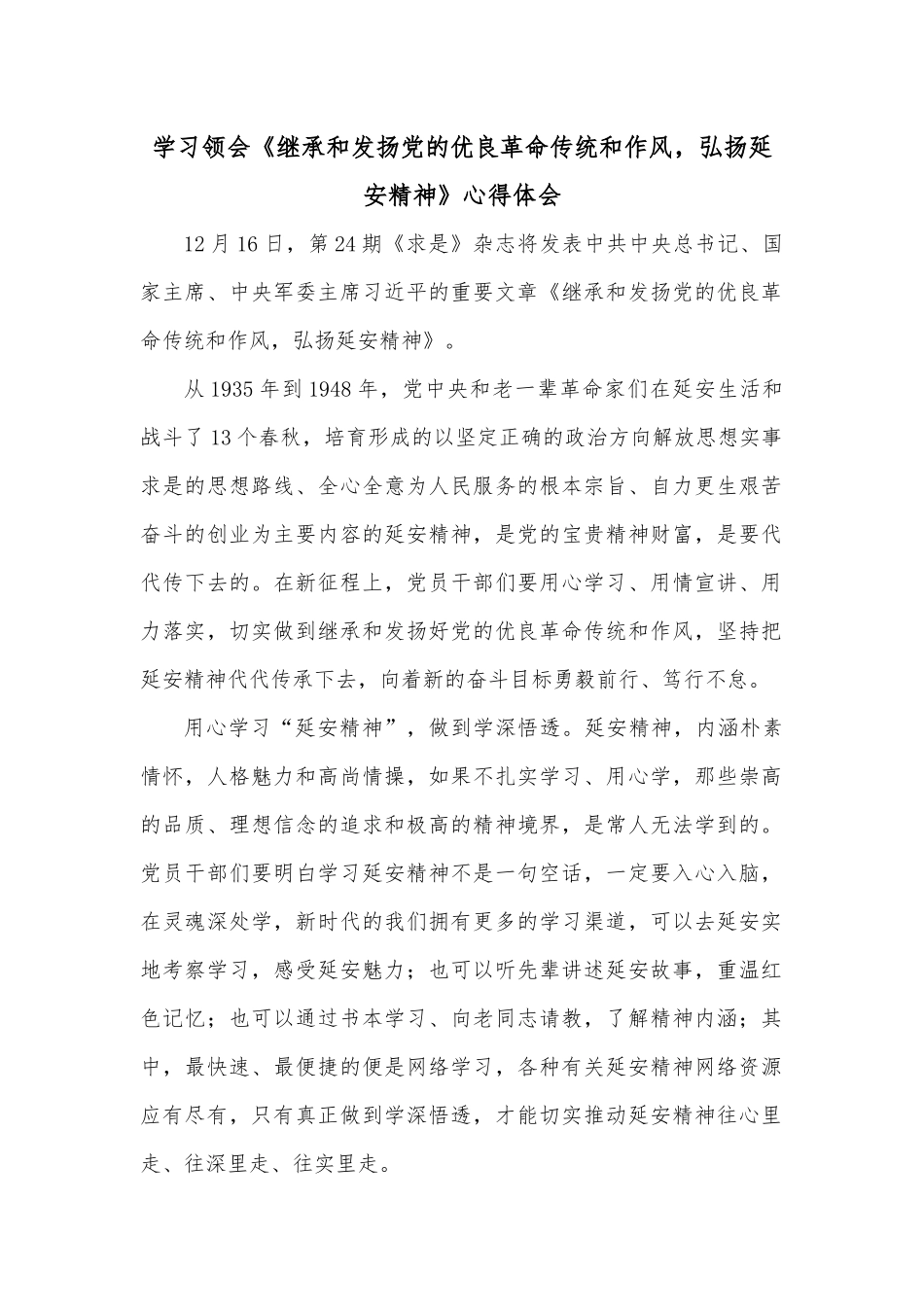 学习领会《继承和发扬党的优良革命传统和作风,弘扬延安精神》心得体会12月16日,第24期《求是》杂志将发表中共中央总书记、国家主席、中央军委主席习近平的重要文章《继承和发扬党的优良革命传统和作风,弘扬延安精神》。从1935年到1948年,党中央和老一辈革命家们在延安生活和战斗了13个春秋,培育形成的以坚定正确的政治方向解放思想实事求是的思想路线、全心全意为人民服务的根本宗旨、自力更生艰苦奋斗的创业为主要内容的延安精神,是党的宝贵精神财富,是要代代传下去的。在新征程上,党员干部们要用心学习、用情宣讲、用力落实,切实做到继承和发扬好党的优良革命传统和作风,坚持把延安精神代代传承下去,向着新的奋斗目标勇毅前行、笃行不怠。用心学习“延安精神”,做到学深悟透。延安精神,内涵朴素情怀,人格魅力和高尚情操,如果不扎实学习、用心学,那些崇高的品质、理想信念的追求和极高的精神境界,是常人无法学到的。党员干部们要明白学习延安精神不是一句空话,一定要入心入脑,在灵魂深处学,新时代的我们拥有更多的学习渠道,可以去延安实地考察学习,感受延安魅力;也可以听先辈讲述延安故事,重温红色记忆;也可以通过书本学习、向老同志请教,了解精神内涵;其中,最快速、最便捷的便是网络学习,各种有关延安精神网络资源应有尽有,只有真正做到学深悟透,才能切实推动延安精神往心里走、往深里走、往实里走。用情宣传“延安精神”,做到深入人心。人民是历史的创造者,是决定党和国家前途命运的根本力量,任何伟大的事业都需要与人民上下同心、步调一致,才能形成无坚不摧的战斗集体,才能汇聚起事业前行的磅礴力量。所以全体党员干部要带头做好“延安精神”的“宣传员”“发声人”,在线上要运用网络新媒体和工具,创新网上宣传内容、形式、手段,进一步提升吸引力、感染力、影响力、有效性,把党中央在延安革命事业历程中可歌可泣的感人故事讲出去;在线下要利用农民夜校、志愿服务、院落会、大宣讲、入户等方式,以人民群众通俗易懂、喜闻乐见的形式,让“延安精神”内涵飞入大街小巷、田间地头、寻常百姓家,形成传承弘扬红色文化的浓厚氛围,让“延安精神”传得更开、传得更广、传得更深入,真正做到让“延安精神”深入广大人民群众心里。用力落实“延安精神”,做到知行合一。实践是检验真理的唯一标准,我们光学懂弄通延安精神是远远不够的,最重要的还是做实延安精神,做实就是把延安精神落到实处。正所谓,空谈误国、实干兴邦,一分部署、九分落实,党员干部们要自觉做到先行一步、深学一层,做到思想务实、工作扎实、作风求实、措施落实,学以致用,将延安精神内化为强大的政治信仰、坚定的理想信念和崇高的精神追求,坚定不移的听党话、跟党走;外化为干好本职工作、推动事业发展的不竭动力,面对“娄山关”“腊子口”敢勇往直前、攻坚克难,只有这样才能不断打磨自身干事创业的本领,才能践行“不负人民”的胸怀、“使命在肩”的觉悟、“强国有我”的担当。