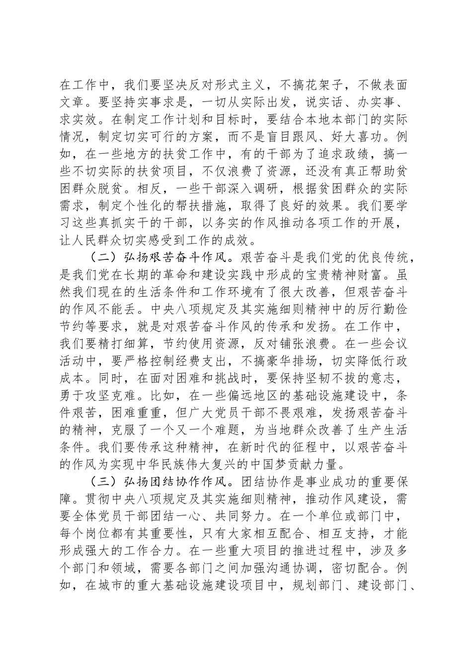 领导干部在作风建设深入贯彻xxx精神学习教育专题读书班上的交流发言同志们:按照局党组深入贯彻xxx精神学习教育工作部署下面,我与大家交流学习贯彻xxx及其实施细则精神的心得体会,不当之处请予以批评指正。xxx自出台以来,犹如一阵强劲的清风,吹遍了神州大地,为党风政风建设带来了全新的气象。它不仅是对党员干部行为的规范,更是我们党在新时代自我革新、自我净化的重要举措。在当前形势下,扎实开展xxx及其实施细则精神学习教育,持续推动作风建设走深走实,具有极其重要的现实意义。我们要锲而不舍落实xxx及其实施细则精神,推动党风政风持续向优向好。一、强化“三种意识”,筑牢作风建设根基(一)强化宗旨意识。全心全意为人民服务,是我们党的根本宗旨,也是xxx及其实施细则精神的出发点和落脚点。党员干部要时刻牢记自己的使命,将人民群众的利益放在首位。回顾历史,我们党在革命、建设和改革的各个阶段,始终紧紧依靠人民,为人民谋幸福、为民族谋复兴。在战争年代,无数党员干部为了人民的解放事业,不惜抛头颅、洒热血;在和平建设时期,焦裕禄、孔繁森等一大批优秀党员干部,深入基层,与群众同甘共苦,为群众排忧解难。如今,我们身处新时代,更要继承和发扬这种优良传统。在实际工作中,要多深入基层调研,了解群众的所思所想所盼。比如,在制定民生政策时,不能坐在办公室里拍脑袋决策,而要走进社区、农村,与群众面对面交流,倾听他们的意见和建议,确保政策真正符合群众需求,切实解决群众的实际问题,以实际行动践行党的宗旨,赢得人民群众的信任和支持。(二)强化责任意识。每一位党员干部都肩负着党和人民赋予的责任。xxx及其实施细则精神的落实,需要我们强化责任担当,认真履行好自己的职责。责任意识体现在工作的方方面面,大到推动国家重大战略的实施,小到处理每一项具体业务。在一些重点项目建设中,相关负责同志要切实负起责任,从项目规划、审批到施工建设,每个环节都要严格把关,确保项目质量和进度。如果在工作中敷衍塞责、推诿扯皮,不仅会影响工作效率,更会损害党和政府的形象。党员干部要时刻保持清醒的头脑,明确自己的岗位职责,以高度的责任感对待每一项工作任务,做到守土有责、守土尽责。只有每个人都扛起自己的责任,我们的事业才能不断向前推进,xxx及其实施细则精神才能真正落地生根。(三)强化廉洁意识。廉洁自律是党员干部的基本准则,也是xxx及其实施细则精神的重要内容。腐败问题严重侵蚀党的肌体,破坏党同人民群众的血肉联系。近年来,党中央坚决惩治腐败,查处了一批违反xxx及其实施细则精神的典型案例,彰显了党反腐倡廉的坚定决心。这些案例警示我们,党员干部必须时刻保持廉洁意识,自觉抵制各种诱惑。在日常工作和生活中,要严格遵守廉洁纪律,坚决杜绝公款吃喝、收受礼品礼金、违规使用公车等行为。同时,要加强自身道德修养,做到慎独、慎微、慎初。比如,有的干部在面对一些小恩小惠时,没有坚守住底线,最终一步步滑向腐败的深渊。我们要从这些案例中吸取教训,时刻保持警醒,做到心有所畏、言有所戒、行有所止,以清正廉洁的形象为广大群众树立榜样。二、弘扬“三种作风”,展现良好精神风貌(一)弘扬求真务实作风。求真务实是党的思想路线的核心内容,也是贯彻xxx及其实施细则精神的必然要求。在工作中,我们要坚决反对形式主义,不搞花架子,不做表面文章。要坚持实事求是,一切从实际出发,说实话、办实事、求实效。在制定工作计划和目标时,要结合本地本部门的实际情况,制定切实可行的方案,而不是盲目跟风、好大喜功。例如,在一些地方的扶贫工作中,有的干部为了追求政绩,搞一些不切实际的扶贫项目,不仅浪费了资源,还没有真正帮助贫困群众脱贫。相反,一些干部深入调研,根据贫困群众的实际需求,制定个性化的帮扶措施,取得了良好的效果。我们要学习这些真抓实干的干部,以务实的作风推动各项工作的开展,让人民群众切实感受到工作的成效。(二)弘扬艰苦奋斗作风。艰苦奋斗是我们...