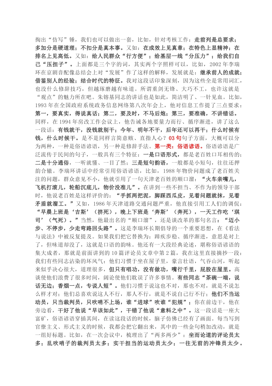 今天,我们来讲讲第5把“符号锤”——口语的韵味。这个韵味来自哪里?我觉得可以从以下3方面来看:第一,这个韵味来自于“声音”。语言的第一属性是什么?不是文字,而是声音,这就是现代语言学之父索绪尔所强调的:口语处于首要地位!是先有口语,还是先有文字?肯定是先有口语。人类历史上有数以万计的语言,只有106种语言使用过文字或产生了文学。现存的3000种语言中,大约只有78种语言有书面文献。交流的本质是“声音”,就算你在阅读文字的时候,脑子里也会不自觉响起一种声音。不信的话,现在就可以试一试。所以,语言首先是一种口语现象,“口语”在一切交流中都处于首要地位。第二,这个韵味来自于“传播”。从包含与被包含的关系来看,概念最大的是语言,然后是文字,文字下面又包含口语文字、书面文字。但归根结底它们的根本任务只有一个,那就是“传播”,凡是与这个中心目的相违背的,都是耍流氓。讲一个“秀才买柴”的故事。一个秀才看到一个挑担卖柴的,喊道:“荷薪者过来。”卖柴人听懂了“过来”两字,就过来了。秀才指着柴问:“其价几何?”卖柴人听懂了一个字:“价”,就告诉他了。秀才又摇头晃脑地说:“其薪枝多而茎少,烟多而焰少,请损之!”意思是:你这个柴小枝多、大段少,烟多、火不旺,便宜点吧。卖柴人一个字也没听懂,扭头走了。秀才的话有没有文化?有!但有没有用?没有!这就是我们在文稿写作中经常犯的“书生病”“拽文病”。你老老实实说“人话”就行了,非得故作高深,别人听得难受,没有传播效果,一切都是白费。书面语的传播力低于口语,这不是什么原理问题,这是生理问题。第三,这个韵味来自于“互动”。口语毕竟是琐碎的、不成体系的,经过人们的不断加工、提纯,最后转化为书面语,我们得到了书面语的精准,但也使得它与口语之间产生了距离。每一个文字,在诞生之初都是伴随着语境的,这就是口语的另外一大优势:可共情、能互动。比如,1983年,陈云在中央工作会议上对现代化建设,讲了著名的“八字”方针:一要吃饭,二要建设。正是这两句大白话,把保民生与抓发展之间的关系说得清清楚楚。如果把“一要吃饭,二要建设”这句大白话翻译成书面语,应该就是“尽力而为、量力而行”。同样是八个字,但我们会发现,很明显前者更有温度,因为它来自日常生活,有烟火气。好了,以上是道理的“心法”,下面我们谈谈实践的“技法”。这个技法不太好写,因为“口语”这把符号锤特点就像口语一样,虽然天天嘴巴上讲,但真要总结,好像又没什么特点。这个时候只能再次翻开李瑞环的《看法与说法》,整整四册、64万字,几乎每一个字都是从嘴巴里讲出来的。所以,我准备以这本书为主,同时兼顾其他素材,尝试着去摸一摸“口语”这把锤子的门道。从文本形式上,我将其分为“字”“词”“句”三大类:01字所谓“字”,就是口语化标题出现频次较高的字,主要有这么一些:了:我们每个人讲得最多的一个字,也许就是“了”,作为一个语气助词,它天生就有口语基因。1985年1月,李瑞环同《中国城市经济社会年鉴》的记者谈话,他用“十个了”,讲述了天津发展之变:天变青了;地变绿;房变多了;路变宽了;水变甜了;害变利了;脏变净了;破变好了;难变易了;城变美了。1994年2月,在第三次西藏工作座谈会筹备领导小组会上,他用“三个了”阐明了什么是大是大非:祖宗留下这块地皮,不能叫我们给搞小了;中华民族的好传统,不能叫我们给搞丢了;革命先烈留下的好制度,不能叫我们给搞坏了。这与总书记2012年强调的“三件事”有异曲同工之妙:五千年的优秀文化不要搞丢了,老前辈确立的正确政治制度不要搞坏了,老祖宗留下来的地盘不要搞小了2011年4月20日的《人民日报》,也是用一组“了”作标题:能耗低了、排放少了、低碳俏了,讲述江苏昆山节能减排的发展实践。来:“了”字嘴上说得多,但“来”字纸上写得更多,它是口语化标题中的常客,并且上得厅堂、下得厨房,可以全场景作战,十分了得。比如,在民主生活会上,它可以辣味十足:要把身段“放下来”;要把问题“摆出来”;要把群众“请进来”。在部署讲话中,它又可以态度鲜明:规矩立起来;底线划...