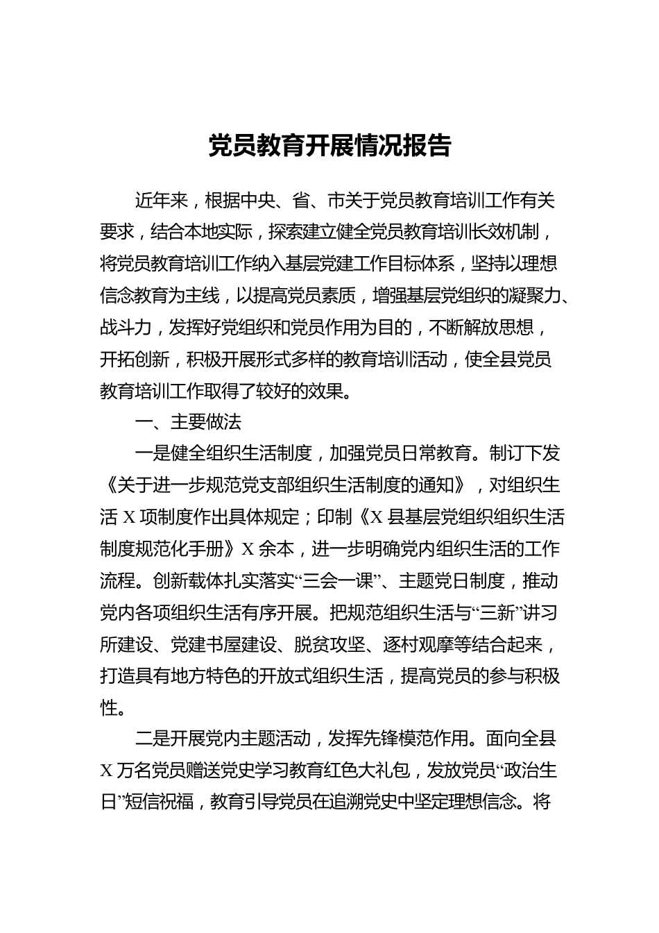党员教育开展情况报告近年来,根据中央、省、市关于党员教育培训工作有关要求,结合本地实际,探索建立健全党员教育培训长效机制,将党员教育培训工作纳入基层党建工作目标体系,坚持以理想信念教育为主线,以提高党员素质,增强基层党组织的凝聚力、战斗力,发挥好党组织和党员作用为目的,不断解放思想,开拓创新,积极开展形式多样的教育培训活动,使全县党员教育培训工作取得了较好的效果。一、主要做法一是健全组织生活制度,加强党员日常教育。制订下发《关于进一步规范党支部组织生活制度的通知》,对组织生活X项制度作出具体规定;印制《X县基层党组织组织生活制度规范化手册》X余本,进一步明确党内组织生活的工作流程。创新载体扎实落实“三会一课”、主题党日制度,推动党内各项组织生活有序开展。把规范组织生活与“三新”讲习所建设、党建书屋建设、脱贫攻坚、逐村观摩等结合起来,打造具有地方特色的开放式组织生活,提高党员的参与积极性。二是开展党内主题活动,发挥先锋模范作用。面向全县X万名党员赠送党史学习教育红色大礼包,发放党员“政治生日”短信祝福,教育引导党员在追溯党史中坚定理想信念。将每月X日确定为全县统一的支部“主题党日”,经常性组织开展各类党内主题活动,有效激发党员履职尽责、担当作为的内生动力。建立X党小组活动模式,指导党员在设岗定责服务群众、助力精准乡村振兴等方面,发挥先锋模范作用。三是实行分级轮训,确保全员覆盖。全面实施党员培训培优计划,认真开展“万名党员进党校”培训活动。按照分级培训和全员培训的原则,通过县委组织部示范培训,乡镇党委重点培训,依托县、镇两级党校,有计划、有步骤、有重点地开展党员轮训工作。由县委组织部牵头、县委党校承办,全年负责对基层党组织书记、基层党员、党务工作者等进行集中培训,举办各类培训班X期,累计培训党员X人次。由乡镇党委依托镇级党校,运用“互联网+智慧党建”融平台,采取“镇会场现场授课+村会场(各行政村远程教育站点)视频会议”的形式,实现基层党员培训全覆盖。四是强化培训管理,确保培训实效。目前有一个培训基地。位于X县小镇,占地面积X亩,建筑面积X㎡,有容纳X人多功能报告厅X个,有容纳X人多功能报告厅X个,有容纳X人以上教室和会议室X个,有藏书X册资料室兼阅览室一个,有X台电脑微机室X个,可同时容纳X余人培训食宿。县委党校编制X人,现有教职工X人,其中专职教师X人(高级讲师X人,讲师X人,助讲X人),管理和工勤人员X人。现设办公室、教研室、干训科、后勤股四个职能科室。在培训管理方面,一是加强校风建设,坚持“严”字当头,严以治校、严以治教、严以治学,严格落实中央八项规定精神,建立健全各项管理制度。二是县内所有班次实行封闭式培训,所有班次安排正副班主任全程跟班管理,并邀请组织纪检部门对学员学风现场监督。三是建立健全学员在校管理档案,对学员参训情况、在校表现、考试成绩作出全面详实记录,并作出综合鉴定,其结果纳入干部个人档案。四是健全保障机制,增强党员教育长效性。一是建立领导工作责任制。县委组织部定期研究部署党员教育培训工作,制定全县党员教育培训计划,各党委结合自身实际,制定切实可行的党员教育规划,把党员教育培训工作作为硬任务、硬指标,纳入党建总体工作目标。党委书记作为党建工作的第一责任人,切实加强对党员教育培训的领导。进一步明确各党委、纪检、组织、宣传、党校等部门的职责,分工协作,形成各职能部门齐抓共管的良好格局。二是建立督导检查制度。县委组织部履行牵头抓总的职责,通过深入基层督查指导,及时掌握了解党员教育培训情况,督促基层落实“三会一课”、主题党日、定期学习、民主评议党员、党内谈心谈话等党员教育管理制度,不断拓宽教育培训渠道,切实做到常抓不懈、持之以恒。三是建立经费保障制度。县财政每年列支党员教育专项经费,县委组织部也从党费中拿出部分资金,采取举办各类培训、订购党建书刊、添置电教设备、下拨培训经费等措施,确保党员教育经费的落实。二、存在的问题一是教育培训内容需进一步优化。在党员教育培训中还存在着“三多三少”现象,即教...