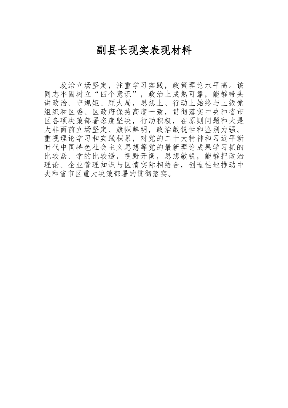 副县长现实表现材料政治立场坚定,注重学习实践,政策理论水平高。该同志牢固树立“四个意识”,政治上成熟可靠,能够带头讲政治、守规矩、顾大局,思想上、行动上始终与上级党组织和区委、区政府保持高度一致,贯彻落实中央和省市区各项决策部署态度坚决,行动积极,在原则问题和大是大非面前立场坚定、旗帜鲜明,政治敏锐性和鉴别力强。重视理论学习和实践积累,对党的二十大精神和习近平新时代中国特色社会主义思想等党的最新理论成果学习抓的比较紧、学的比较透,视野开阔,思想敏锐,能够把政治理论、企业管理知识与区情实际相结合,创造性地推动中央和省市区重大决策部署的贯彻落实。作风务实高效,勇于担当负责,尽职履责实绩好。该同志作风务实,勤勉尽责,注重运用务实地企业管理理念看问题、出主意、抓工作。一年年来,按照“重工作实效创一流业绩”的要求,带领分管部门攻坚克难,真抓实干圆满完成了分管的科技、司法等部门工作任务。抓实项目建设,多次赴省、市相关部门对接、协调,协助引进了文化产业园等项目,建成了种子存储加工三期项目、种子仓储等项目,总投资额达3亿元,进一步夯实了全区经济社会发展基础。充分发挥科技支撑和引领作用,坚持把科技项目资金争取作为科技工作的重中之重,年内申请立项省、市科技项目65项,到位资金达2000万元;引进试验农作物新品种180多个,示范推广新农业技术60多项;加快企业技术创新体系建设,认定“区级众创空间”20家,营造了良好的创新创业生态环境。全面提升司法保障和服务水平牢牢抓住司法所规范化建设这条主线,加强硬件建设,着力提升干部业务能力,打造了10个精品司法所,指导编写了《司法工作法律汇编》,司法规范化建设扎实推进。督促抓好特殊人群服务管理,社区接收服刑人员建档率、衔接率均达100%。深入推进矛盾化解,年内累计调处矛盾纠纷2222起,调处率达到98%,有效促进了社会和谐稳定。深入开展“八五”普法,组织开展了形式多样的大型集中法治讲座、宣传222场次,培养“法律明白人”6万余人,群众法律知识素养进一步提高。组织观念较好,敢于坚持原则,团结协作意识强。该同志能够坚决遵守党的民主集中制原则,自觉摆正位置,积极建言献策,坚决落实区委、区政府的重大决策部署,坚持重大事项请示报告制度,自觉维护区政府领导班子团结;对分管工作的进展情况,及时向主要领导汇报,向班子其他领导通气。遇事主动同分管部门领导沟通,积极协调解决重大问题,善于调动分管部门领导的工作积极性,有效推动工作任务落实。能够自觉接受人大政协监督,注意加强与上级政府和市直部门的沟通联系,较好地处理各个方面的关系,为开展工作创造了良好环境。为人公道正派,勤于修身律己,廉政责任落实严。该同志始终坚持严以律己、廉洁从政,时刻敬畏权力、恪守规矩。时时注意遵守纪律规定,严格抓好分管口的廉政建设和意识形态工作。多次约谈分管部门班子成员,进一步促进了主体责任落实和干部作风改进,所分管的部门及其班子成员未发生党风廉政方面的问题。严格管控和引领分管部门意识形态工作,对于错误观点和错误倾向,及时澄清谬误、消除影响;对于大是大非问题和政治原则问题,能够旗帜鲜明、立场坚定地开展斗争,分管部门未曾出现意识形态问题。同时严格要求自己、家属及身边工作人员注重品德修养,秉公办事、廉洁奉公,树立了良好个人形象。不足之处:对区情实际调查了解得不深不细,到基层乡村农户去得少;工作中有时存在畏难情绪,工作魄力不够;工作的预见性和超前性不够等。