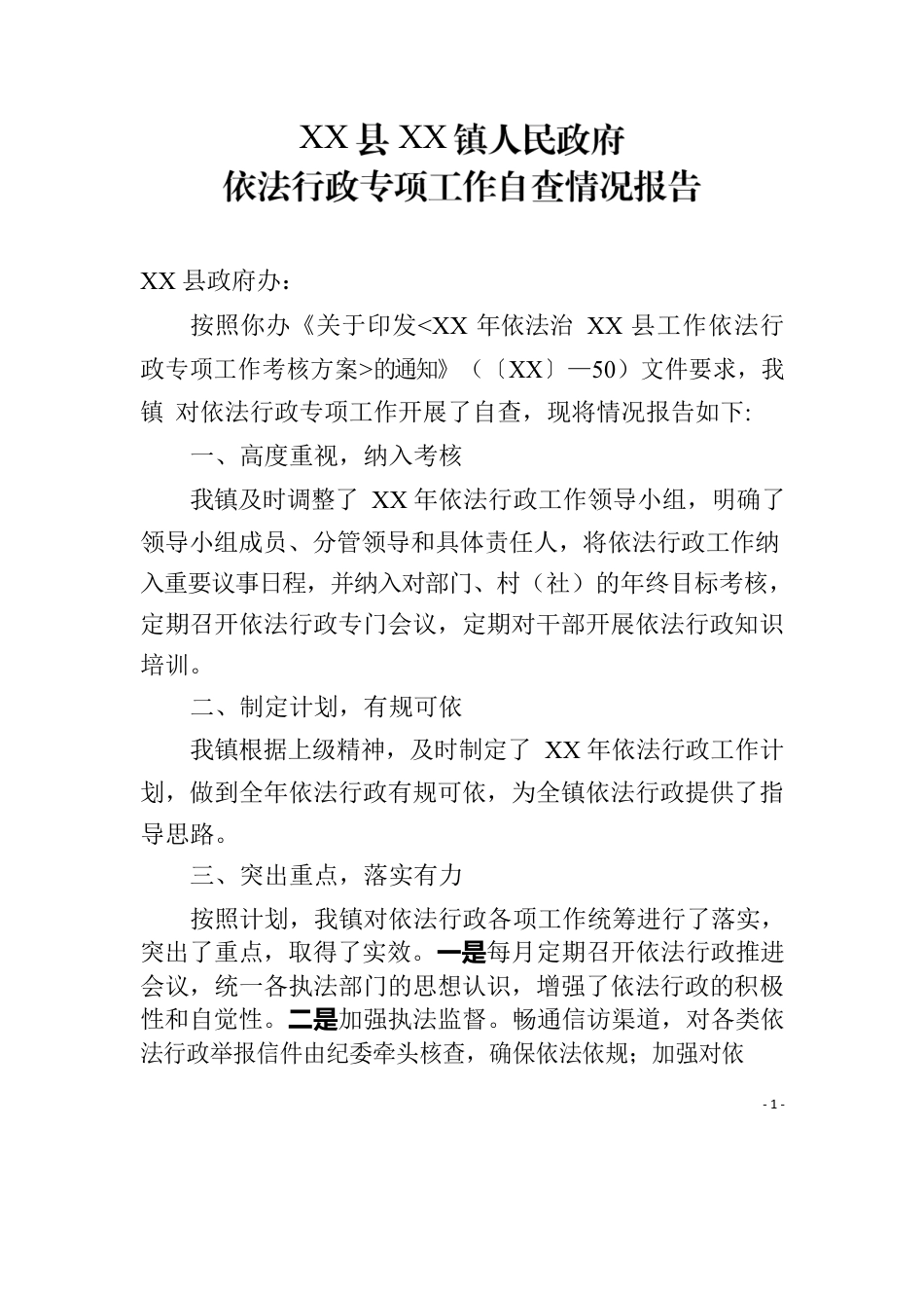 XXXXXX县政府办:按照你办《关于印发的通知》(〔XX〕—50)文件要求,我镇对依法行政专项工作开展了自查,现将情况报告如下:一、高度重视,纳入考核我镇及时调整了XX年依法行政工作领导小组,明确了领导小组成员、分管领导和具体责任人,将依法行政工作纳入重要议事日程,并纳入对部门、村(社)的年终目标考核,定期召开依法行政专门会议,定期对干部开展依法行政知识培训。二、制定计划,有规可依我镇根据上级精神,及时制定了XX年依法行政工作计划,做到全年依法行政有规可依,为全镇依法行政提供了指导思路。三、突出重点,落实有力按照计划,我镇对依法行政各项工作统筹进行了落实,突出了重点,取得了实效。一是每月定期召开依法行政推进会议,统一各执法部门的思想认识,增强了依法行政的积极性和自觉性。二是加强执法监督。畅通信访渠道,对各类依法行政举报信件由纪委牵头核查,确保依法依规;加强对依-1-法征收社会抚养费、城镇配套设施建设费等的监管审计,及时上交XX县财政,绝不私设小金库。三是强化政务、村务公开。对涉及群众利益的国土、民政、村镇、计生、党务、项目工程等等各项工作应公开尽公开。四是重点抓好“一卡通”专项督查整改,针对市、XX县督查反馈问题,逐一整改到位,同时举一反三开展自查自纠,确保群众本人持卡、资金发放到位。五是及时自查整改。对群众上访反映的问题和走访调研等收集的问题认真进行梳理分析,剖析原因。及时研判制定对策整改措施,做到边查边改。四、存在的问题一是执法权限有限。基层工作纷繁复杂、包罗万象,俗话说“上面千条线、下面一根针”,由于乡镇一级执法权限有限,影响了统筹协调和管理职能的发挥。二是部门协同欠缺。基层政府无权处理的一些事务,其行政权限在上级有关职能部门。当群众有相关要求时,基层政府无法在第一时间予以解决,待反映到上级部门进行处理时,已有部分群众因等不及而产生越级上访等情况。五、下一步工作打算一是加强法制宣传教育,强化法律意识。一方面加强执法队伍的执法水平,另一方面加强群众的遵法守法意识。二是加强监督执纪,规范行政行为。由纪委牵头强化对执法人员的监督,确保行政执法人员的行政行为要以法律为依据。-2-三是加强教育培训,提升执法队伍的素质。加强对执法人员的思想政治教育,同时提升具体的业务素质,做到人岗相适。四是改进作风,提升效率。完善制度,加强对干部队伍的管理,形成热情、周到的服务态度,高效、迅速的工作节奏,不断构建公开透明、廉洁高效的政府形象。-3-