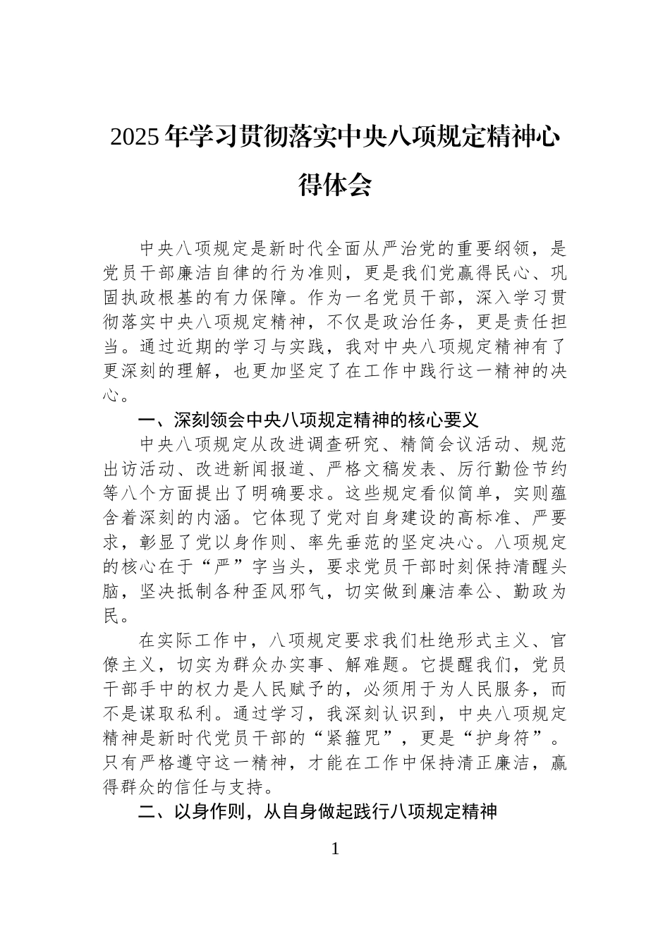 2025年学习贯彻落实xxx精神心得体会xxx是新时代全面从严治党的重要纲领,是党员干部廉洁自律的行为准则,更是我们党赢得民心、巩固执政根基的有力保障。作为一名党员干部,深入学习贯彻落实xxx精神,不仅是政治任务,更是责任担当。通过近期的学习与实践,我对xxx精神有了更深刻的理解,也更加坚定了在工作中践行这一精神的决心。一、深刻领会xxx精神的核心要义xxx从改进调查研究、精简会议活动、规范出访活动、改进新闻报道、严格文稿发表、厉行勤俭节约等八个方面提出了明确要求。这些规定看似简单,实则蕴含着深刻的内涵。它体现了党对自身建设的高标准、严要求,彰显了党以身作则、率先垂范的坚定决心。八项规定的核心在于“严”字当头,要求党员干部时刻保持清醒头脑,坚决抵制各种歪风邪气,切实做到廉洁奉公、勤政为民。在实际工作中,八项规定要求我们杜绝形式主义、官僚主义,切实为群众办实事、解难题。它提醒我们,党员干部手中的权力是人民赋予的,必须用于为人民服务,而不是谋取私利。通过学习,我深刻认识到,xxx精神是新时代党员干部的“紧箍咒”,更是“护身符”。只有严格遵守这一精神,才能在工作中保持清正廉洁,赢得群众的信任与支持。二、以身作则,从自身做起践行八项规定精神1作为一名党员干部,我深知自己的一言一行都代表着党的形象。因此,在日常工作中,我时刻以xxx精神为准则,严格要求自己。(一)改进工作作风,密切联系群众工作中,我积极践行“从群众中来,到群众中去”的工作方法。通过深入基层调研,了解群众的实际需求和困难,努力为群众办实事。在调研过程中,我严格遵守规定轻车简从,不给基层增加负担。同时,注重调研实效,避免走过场、搞形式主义。通过与群众面对面交流,我不仅收集到了大量有价值的信息,还增进了与群众的感情,进一步坚定了为人民服务的信念。(二)严守纪律规矩,筑牢廉洁防线xxx精神是党员干部的纪律红线,我时刻提醒自己要严守这一红线。在工作中,我严格遵守廉洁自律各项规定,坚决抵制各种诱惑。无论是面对金钱的诱惑,还是人情的干扰,我都坚守底线,做到不越雷池一步。同时,我也注重加强自身修养,培养健康的生活情趣,自觉净化社交圈、生活圈、朋友圈。通过不断学习党纪国法,我进一步增强了纪律意识和规矩意识,时刻保持清醒头脑筑牢廉洁防线。(三)弘扬艰苦奋斗精神,厉行勤俭节约艰苦奋斗是我们党的优良传统,也是xxx精神的重要体现。在日常工作中,我注重从点滴做起,弘扬艰苦奋斗精神。办公用品做到节约使用,杜绝浪费;办公场所尽量利用自然光,减少用电;出行时优先选择公共交通工具,减少公车使用。通过这些看似微不足道的小事,我不仅践行了勤俭节约的理念,还带动了身边的同事共同参与。同时,我也积极倡导单位内部形成勤俭节约的良好氛围,从源头上杜绝铺张浪费现象的发生。三、加强监督管理,推动八项规定精神落地生根2xxx精神的贯彻落实,离不开有效的监督管理。作为一名党员干部,我不仅要以身作则,还要积极参与单位内部的监督工作,推动八项规定精神在本单位落地生根。(一)强化内部监督,完善制度建设建立健全一系列监督制度,加强对党员干部的日常监督。通过定期开展廉政谈话、民主评议等活动,及时发现和纠正党员干部在工作作风、廉洁自律等方面存在的问题同时,进一步完善财务管理制度、公务接待制度等,从制度层面规范党员干部的行为,确保八项规定精神落到实处在监督过程中,我积极参与,认真履行监督职责,对发现的问题及时提出整改意见,确保监督工作取得实效。(二)加强宣传教育,营造廉洁氛围为推动xxx精神深入人心,广泛开展宣传教育活动。通过组织专题学习、观看警示教育片、开展廉政文化活动等形式,不断增强党员干部的廉洁意识和纪律意识。同时,还利用单位内部的宣传栏、电子显示屏等平台宣传八项规定精神和廉洁自律要求,营造浓厚的廉洁氛围通过这些宣传教育活动,党员干部对八项规定精神的理解更加深刻,自觉践行的意识也不断增强。(三)发挥群众监督作...