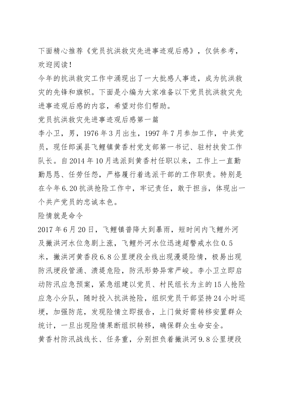 党员抗洪救灾先进事迹观后感下面精心推荐《党员抗洪救灾先进事迹观后感》,仅供参考,欢迎阅读!今年的抗洪救灾工作中涌现出了一大批感人事迹,成为抗洪救灾的先锋和旗帜。下面是小编为大家准备以下党员抗洪救灾先进事迹观后感的内容,希望对你们帮助。党员抗洪救灾先进事迹观后感第一篇李小卫,男,1976年3月出生,1997年7月参加工作,中共党员,现任郎溪县飞鲤镇黄香村党支部第一书记、驻村扶贫工作队长。自2014年10月选派到黄香村任职以来,工作上一直勤勤恳恳、任劳任怨,严格履行着选派干部的工作职责。特别是在今年6.20抗洪抢险工作中,牢记责任,敢于担当,体现出一个共产党员的忠诚本色。险情就是命令2017年6月20日,飞鲤镇普降大到暴雨,短时间内飞鲤外河及撇洪河水位急剧上涨,飞鲤外河水位迅速超警戒水位0.5米,撇洪河黄香段6.8公里埂段全线出现漫堤险情,极易出现防汛埂段管涌、溃堤危险,防汛形势异常严峻。李小卫立即启动防汛应急预案,紧急组建以党员、村民组长为主的15人抢险应急小分队,随时投入抗洪抢险,组织党员干部坚持24小时巡埂,加强防范,发现险情立即报告,上门做好需转移安置群众统计,一旦出现险情果断组织转移,确保群众生命安全。黄香村防汛战线长、任务重,分别担负着撇洪河9.8公里埂段的70%和飞鲤镇南大堤下段1.1公里的防汛任务。6月20日下午1点,当时李小卫驻守南大堤,村里另外两名干部驻守撇洪河,因为山水来势凶猛,大的险情先从撇洪河发生。极短时间内,撇洪河水位急剧上涨,迅速漫堤。李小卫在撇洪河水位达到警戒时接到告急电话,立即通知村民组长和党员组织人员赶赴撇洪河增援,并迅速开车向撇洪河挺进。当车辆行驶到跃进圩内道路时,圩内的水已经开始漫路。倒车掉头另选道路的话,时间等不及,一旦圩埂倒塌,不但良田被冲,群众的住房都要被冲毁;不倒车一直前进,车辆极有可能因进水而熄火。怎么办?李小卫当时只有一个念想,灾情就是命令,闯不得也要闯。立即挂档,沿着尚能看清的道路疾奔。当冲过漫水区,车牌已经被水流冲击的翘起,一颗螺丝也冲掉了。因为人员调来及时,指挥得当,在附近100多村民从下午五点多奋战到凌晨两点的努力下,撇洪河圩堤上共码起了三段500多米的土包,防止了溃坝的危险。是党员跟我上“在灾情面前,党员,就是老百姓的主心骨,只有我们党员带头上埂,带头运土,带头冲锋在抗洪第一线,才能凝聚合力。”6月21日上午9点,接到镇防汛指挥部命令,南大堤出现蚁穴管涌险情,飞鲤镇南大堤是全镇最危险的埂段之一,李小卫立即带领9名党员赶赴集结地点南大堤,与抢险分队队员一道立即身先士卒,投入抗洪抢险第一线,奋战9小时成功完成南大堤两处抢险任务。晚上7时继续带班巡埂至次日8点交接班,在巡查南大堤埂段过程中,共发现5处渗漏、管涌险情并立即报告镇领导,得到妥善处置。6月21日夜里11点,南大堤下段中部发生前期处理过的险情二次恶化情况,李小卫当日依然驻守在南大堤,接到镇分指挥所支援电话后,立即联系村里5名抢险队员奔赴险情现场,并驱车从南大堤下部向中部开进,因为当晚雨天路滑,车行不到200米,就陷入泥浆打滑,无法前进。是继续弄车还是先赶赴险情地段参与救援?选择依然如前。李小卫立即熄火,从车上拿下铁锹,扔下车辆,跑步奔向险情现场,第一时间参与到救援之中。此次抢险一直持续到第二日凌晨两点多,待险情处理完毕后才回去弄车。6月24日中午12点,再次带领7名突击队员奋战南大堤抢险任务。6月25日开始上门统计需转移安置群众名单,启动防汛转移安置应急预案,共摸排出51户122名群众需转移安置。舍小家,为顾大家“作为党员、下派干部、第一书记,防汛险情就是命令,消灭险情,就是责任,就是保护人民群众的生命财产安全,至于其他的,一时考虑不了那么多”。李小卫在汛情发生后连续18天未归家,期间李小卫回过一次郎溪县城,那是因为要到县农委急报本村灾情相关材料,那一次回县城,离家只剩两里路,但是李小卫毅然调转车头,报完材料疾奔飞鲤,坚守防汛责任埂段。在这次抗洪抢险工作中,李小卫不停转战在两条防汛战线上,自6月20日以来,共参加撇洪河抢险8次(大的险情),跃进圩南大堤抢险1...