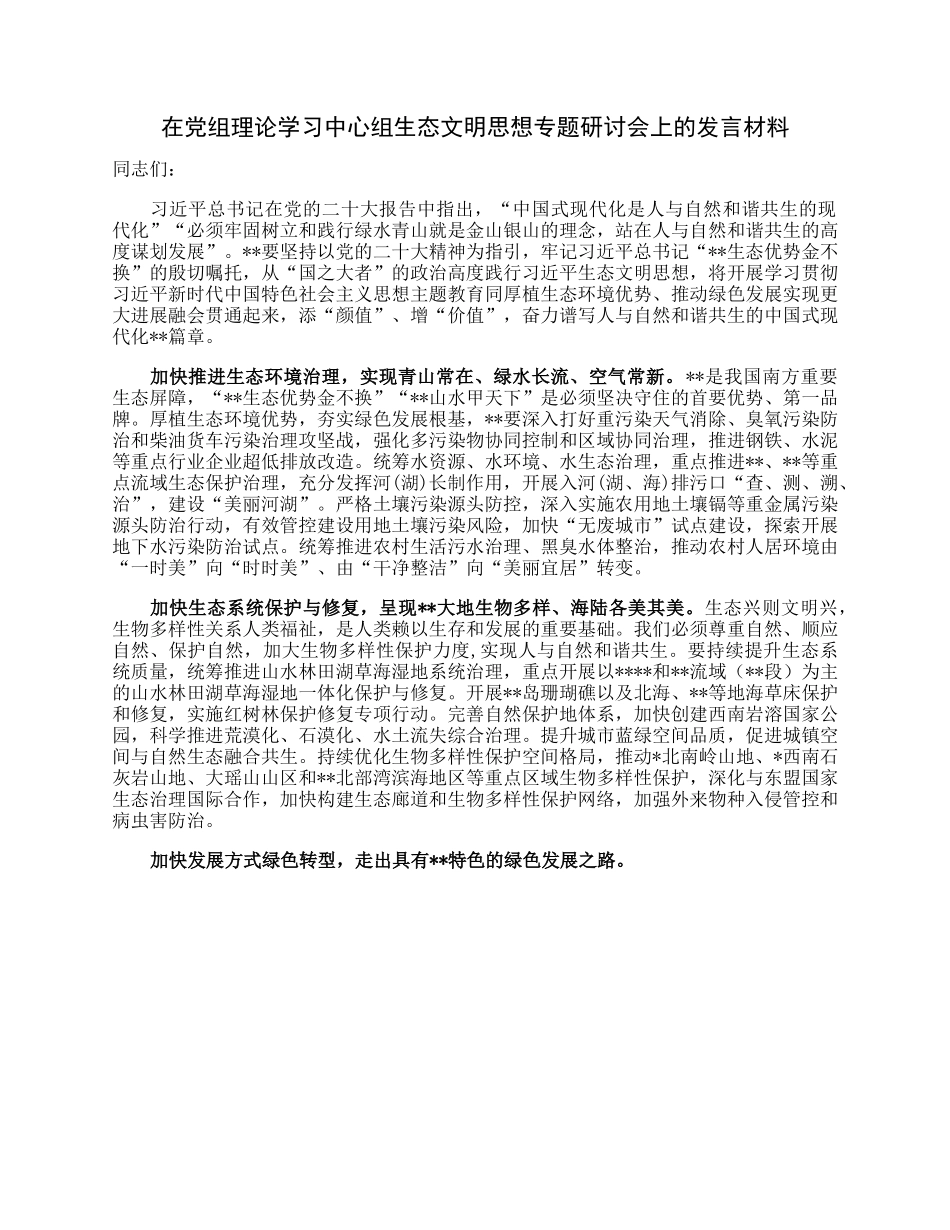在党组理论学习中心组生态文明思想专题研讨会上的发言材料同志们:习近平总书记在党的二十大报告中指出,“中国式现代化是人与自然和谐共生的现代化”“必须牢固树立和践行绿水青山就是金山银山的理念,站在人与自然和谐共生的高度谋划发展”。**要坚持以党的二十大精神为指引,牢记习近平总书记“**生态优势金不换”的殷切嘱托,从“国之大者”的政治高度践行习近平生态文明思想,将开展学习贯彻习近平新时代中国特色社会主义思想主题教育同厚植生态环境优势、推动绿色发展实现更大进展融会贯通起来,添“颜值”、增“价值”,奋力谱写人与自然和谐共生的中国式现代化**篇章。加快推进生态环境治理,实现青山常在、绿水长流、空气常新。**是我国南方重要生态屏障,“**生态优势金不换”“**山水甲天下”是必须坚决守住的首要优势、第一品牌。厚植生态环境优势,夯实绿色发展根基,**要深入打好重污染天气消除、臭氧污染防治和柴油货车污染治理攻坚战,强化多污染物协同控制和区域协同治理,推进钢铁、水泥等重点行业企业超低排放改造。统筹水资源、水环境、水生态治理,重点推进**、**等重点流域生态保护治理,充分发挥河(湖)长制作用,开展入河(湖、海)排污口“查、测、溯、治”,建设“美丽河湖”。严格土壤污染源头防控,深入实施农用地土壤镉等重金属污染源头防治行动,有效管控建设用地土壤污染风险,加快“无废城市”试点建设,探索开展地下水污染防治试点。统筹推进农村生活污水治理、黑臭水体整治,推动农村人居环境由“一时美”向“时时美”、由“干净整洁”向“美丽宜居”转变。加快生态系统保护与修复,呈现**大地生物多样、海陆各美其美。生态兴则文明兴,生物多样性关系人类福祉,是人类赖以生存和发展的重要基础。我们必须尊重自然、顺应自然、保护自然,加大生物多样性保护力度,实现人与自然和谐共生。要持续提升生态系统质量,统筹推进山水林田湖草海湿地系统治理,重点开展以****和**流域(**段)为主的山水林田湖草海湿地一体化保护与修复。开展**岛珊瑚礁以及北海、**等地海草床保护和修复,实施红树林保护修复专项行动。完善自然保护地体系,加快创建西南岩溶国家公园,科学推进荒漠化、石漠化、水土流失综合治理。提升城市蓝绿空间品质,促进城镇空间与自然生态融合共生。持续优化生物多样性保护空间格局,推动*北南岭山地、*西南石灰岩山地、大瑶山山区和**北部湾滨海地区等重点区域生物多样性保护,深化与东盟国家生态治理国际合作,加快构建生态廊道和生物多样性保护网络,加强外来物种入侵管控和病虫害防治。加快发展方式绿色转型,走出具有**特色的绿色发展之路。当前,**经济增长仍处于以资源型产业结构拉动经济增长向依靠要素效率提升拉动经济增长转变的阶段,绿色转型、绿色崛起任重而道远。要完整准确全面贯彻新发展理念,围绕高水平共建西部陆海新通道、平陆运河经济带建设、打造**世界级旅游城市、环北部湾**水资源配置工程等重大区域协调发展战略,科学开展区域产业空间布局研究,突出规划先行,强化落实绿色低碳发展导向和任务要求。推动生产方式绿色化,聚焦优势产业持续建链补链延链强链,推动制糖、机械、汽车、冶金、有色金属、石化化工等传统产业向高端化、智能化、绿色化、融合化迈进,大力发展新一代信息技术、生物技术、新能源、新材料、新能源汽车、绿色环保、高端装备制造等战略性新兴产业。深入实施绿色制造工程,大力发展循环经济,推动园区循环化改造,促进现代服务业与先进制造业深度融合,打造一批绿色园区、绿色工厂、绿色产品。实施农业生产“三品一标”提升行动,引领农业绿色发展,建设一批绿色农业产业园区、产业强镇、产业集群,带动农村一二三产业融合发展、绿色升级。加快发展节能环保产业,重点发展资源综合利用、可降解材料、节能环保装备和节能环保服务产业,鼓励社会资金投入节能环保工程建设。积极稳妥推进碳达峰碳中和,助力绿色发展驶入“快车道”。随着全国整体疫情进入低流行水平,各地迎来一场“拼经济”热潮,需要统筹好高质量发展与生态环境保护的关系。要坚决遏制高耗能高排放项目盲目发展,新建、扩建钢...
