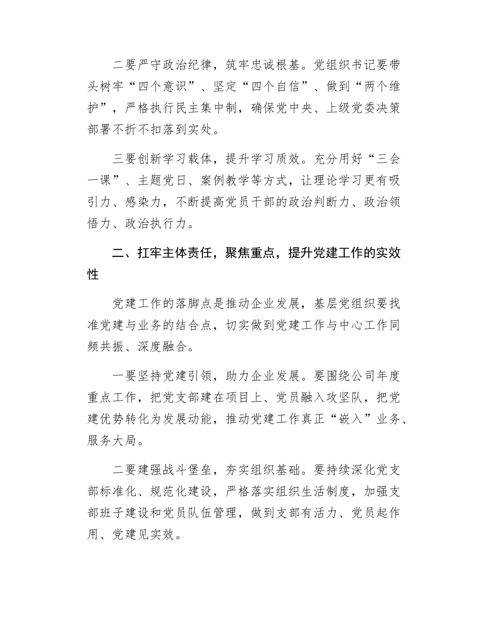 在基层党组织书记工作例会上的讲话(1580字)同志们:今天,我们召开基层党组织书记工作例会,既是一次党建工作的交流研讨会,也是一次总结提升、凝聚共识、明确方向的部署会。基层党组织书记是党的方针政策在基层贯彻落实的关键,是企业高质量发展的组织者、推动者和实践者。面对新形势、新任务,我们必须进一步提高站位、扛牢责任,切实把基层党建做深做实,为企业改革发展提供坚强政治保障。一、提高政治站位,把准方向,强化基层党建的政治引领力基层党组织是党的工作最前沿,是企业生产经营的“主心骨”,必须始终坚持党的全面领导,把讲政治贯穿到各项工作中。一要强化理论武装,增强政治定力。要深入学习贯彻习近平新时代中国特色社会主义思想,特别是习近平总书记关于国有企业改革发展和党的建设的重要论述,深刻领会新质生产力、科技创新、绿色低碳等重大决策部署,做到学思用贯通、知信行统一。二要严守政治纪律,筑牢忠诚根基。党组织书记要带头树牢“四个意识”、坚定“四个自信”、做到“两个维护”,严格执行民主集中制,确保党中央、上级党委决策部署不折不扣落到实处。三要创新学习载体,提升学习质效。充分用好“三会一课”、主题党日、案例教学等方式,让理论学习更有吸引力、感染力,不断提高党员干部的政治判断力、政治领悟力、政治执行力。二、扛牢主体责任,聚焦重点,提升党建工作的实效性党建工作的落脚点是推动企业发展,基层党组织要找准党建与业务的结合点,切实做到党建工作与中心工作同频共振、深度融合。一要坚持党建引领,助力企业发展。要围绕公司年度重点工作,把党支部建在项目上、党员融入攻坚队,把党建优势转化为发展动能,推动党建工作真正“嵌入”业务、服务大局。二要建强战斗堡垒,夯实组织基础。要持续深化党支部标准化、规范化建设,严格落实组织生活制度,加强支部班子建设和党员队伍管理,做到支部有活力、党员起作用、党建见实效。三要深化品牌创建,增强党建影响力。结合企业特点,打造特色党建品牌,如“党建+安全生产”“党建+技术攻关”“党建+降本增效”等,使党建工作更有温度、更加鲜活、更具实效。三、严明纪律规矩,正风肃纪,营造风清气正的政治生态全面从严治党永远在路上,基层党组织书记要发挥“头雁效应”,始终保持廉洁自律,带动形成干事创业的良好氛围。一要严守纪律规矩,筑牢廉洁防线。党组织书记要带头遵守党章党规党纪,严格落实中央八项规定精神,坚决防止和纠治“四风”问题,特别是在公务接待、选人用人、工程招投标等方面守住底线、不越红线。二要加强警示教育,强化底线思维。用好典型案例开展警示教育,做到以案为鉴、以案促改,让广大党员干部知敬畏、存戒惧、守底线,把遵规守纪内化为日常行为习惯。三要强化监督检查,压实管党治党责任。要深化党风廉政建设责任制,推动全面从严治党向基层延伸,加强对重点领域、关键环节的监督检查,确保管党治党责任层层压紧压实。四、狠抓工作落实,担当作为,确保党建工作取得实效党建工作关键在落实,基层党组织书记要树立鲜明的实干导向,以扎实的作风推动各项任务落地见效。一要压实责任链条,推动任务落地。党建工作不是“软指标”,而是“硬任务”。各基层党组织书记要对照年度党建工作目标,逐项细化措施,确保工作有人抓、责任有人担、成效有保障。二要注重实绩导向,激发干事热情。要健全党建考核机制,把党建责任落实情况纳入绩效考核,强化考核结果运用,推动形成比学赶超的良好氛围。三要坚持问题导向,破解发展难题。要深入调查研究,主动倾听一线职工意见,找准党建与企业经营管理的结合点,精准发力,推动解决企业发展中的实际问题,让党建工作更加接地气、见实效。同志们,基层党组织书记责任重大、使命光荣。希望大家以更高的标准、更实的作风、更强的担当,扎实做好基层党建工作,为公司高质量发展提供坚强支撑,以优异成绩迎接新挑战、再创新辉煌!谢谢大家!免责声明:文稿来源网络整理,版权归原作者所有。若侵犯了您的合法权益,请作者持权属证明与本站联系,我们将及时更正、删除!谢谢!文稿首发平台:www.gongwentang.com(公文堂)