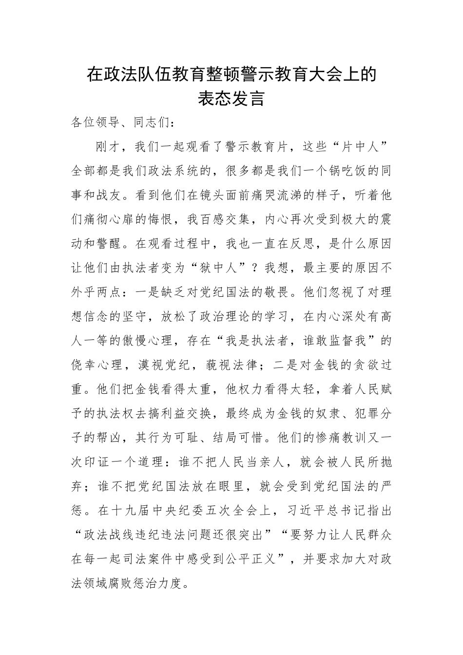 在政法队伍教育整顿警示教育大会上的表态发言各位领导、同志们:刚才,我们一起观看了警示教育片,这些“片中人”全部都是我们政法系统的,很多都是我们一个锅吃饭的同事和战友。看到他们在镜头面前痛哭流涕的样子,听着他们痛彻心扉的悔恨,我百感交集,内心再次受到极大的震动和警醒。在观看过程中,我也一直在反思,是什么原因让他们由执法者变为“狱中人”?我想,最主要的原因不外乎两点:一是缺乏对党纪国法的敬畏。他们忽视了对理想信念的坚守,放松了政治理论的学习,在内心深处有高人一等的傲慢心理,存在“我是执法者,谁敢监督我”的侥幸心理,漠视党纪,藐视法律;二是对金钱的贪欲过重。他们把金钱看得太重,他权力看得太轻,拿着人民赋予的执法权去搞利益交换,最终成为金钱的奴隶、犯罪分子的帮凶,其行为可耻、结局可惜。他们的惨痛教训又一次印证一个道理:谁不把人民当亲人,就会被人民所抛弃;谁不把党纪国法放在眼里,就会受到党纪国法的严惩。在十九届中央纪委五次全会上,习近平总书记指出“政法战线违纪违法问题还很突出”“要努力让人民群众在每一起司法案件中感受到公平正义”,并要求加大对政法领域腐败惩治力度。下面,结合学习习近平总书记重要讲话精神和参加今天的警示教育会议感悟,我就政法干部如何把握自我、坚守防线,谈谈四点心得体会:一、始终不忘初心,保持清醒头脑市公安局刑警大队副大队长X在忏悔录中说:“人虽然入了党,但思想却并未真正入党。宗旨意识不牢,理想信念动摇,革命意志衰退。”X虽说党龄长达30年,但是他的人生航标从一开始就已发生偏离。尽管他出生在农村,可是他最大的梦想就是光宗耀祖,“尽快富起来,别像小时候那样受穷”成为他当官的原动力。为了让家人过上“好日子”,从他手中握有权力的那一刻起,就赤裸裸地寻找一切机会为家族谋利,官做到哪里,家族势力就延伸到哪里,不择手段地完成家族资本的血腥积累。可见X在穿上警服的时候、在非法获取“第一桶金”的时候,他已经忘记了自己的初心。何为初心,初心是理想信念,是人生的总开关,是能否做到自律的思想基础,只有坚定共产主义理想和有中国特色社会主义信念,才能在大是大非面前保持头脑清醒,在小事细节方面严格要求自己。理想信念的动摇是最危险的动摇,理想信念的滑坡是最致命的滑坡。X的事实证明,背弃理想信念是腐败分子违纪违法甚至犯罪的根本原因。我们政法干部手里握着“刀把子”,要坚定理想信念,坚持用习近平新时代中国特色社会主义思想武装头脑、指导实践、推动事业,开展好党史学习教育,努力做习近平新时代中国特色社会主义思想的坚定信仰者、有力传播者、忠诚践行者,着力提高政治判断力、政治领悟力、政治执行力。二、正确对待名利,把住关键环节政法干部每天与各色各样的人打交道,必须正确对待名利,净化社交圈。正所谓“千里之堤,溃于蚁穴”。近年来,像X这样很多被查处的腐败分子虽然职务各有高低、年龄差别较大、学历层次不等,走向犯罪道路的心路历程也不尽相同,但都有一个共同特点,就是不能正确看待个人名利得失,小洞不补,大洞吃苦。X在《忏悔书》中说,“自己认为金钱虽然不是万能的,但离开了金钱也是万万不能的,金钱对退休后无职无权的人将显得更为重要,这一想法成为我后期工作生活的价值取向”、“怕退休后人走茶凉、门庭冷落,产生了有权不用过期作废、趁自己还在位能捞就捞的想法”、“看到一些能力和贡献都远不如自己的人,却靠不正当手段富起来,相比之下,自己收入微薄、囊中羞涩,显得十分寒酸,这种攀比心理让我极不平衡”,诸如此类的想法,成为绝大部分腐败分子对待名利的心态。政法干部要筑牢拒腐防变的防线,必须始终保持高度警惕和良好心态,正确对待名利,从司空见惯的小事和小节抓起加强世界观改造,树立正确的权力观、地位观、利益观,自觉抵制不良思想的侵蚀,切实做到未雨绸缪,防患于未然。三、加强思想教育,筑严思想防线一个人的变化是从思想上的变化开始的。X在《忏悔书》中这样说,“自己平时不注重理论学习,放松了世界观改造,往往以工作忙为由,以干代学。书柜里的书很少看,多数是用来包装的,而不...
