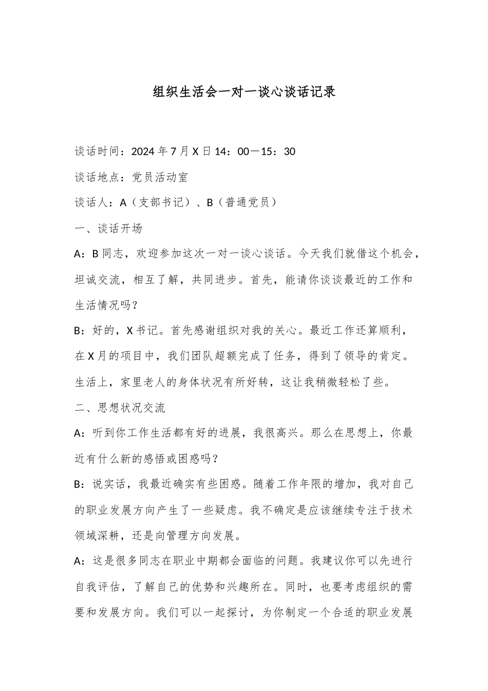 组织生活会一对一谈心谈话记录谈话时间:2024年7月X日14:00-15:30谈话地点:党员活动室谈话人:A(支部书记)、B(普通党员)一、谈话开场A:B同志,欢迎参加这次一对一谈心谈话。今天我们就借这个机会,坦诚交流,相互了解,共同进步。首先,能请你谈谈最近的工作和生活情况吗?B:好的,X书记。首先感谢组织对我的关心。最近工作还算顺利,在X月的项目中,我们团队超额完成了任务,得到了领导的肯定。生活上,家里老人的身体状况有所好转,这让我稍微轻松了些。二、思想状况交流A:听到你工作生活都有好的进展,我很高兴。那么在思想上,你最近有什么新的感悟或困惑吗?B:说实话,我最近确实有些困惑。随着工作年限的增加,我对自己的职业发展方向产生了一些疑虑。我不确定是应该继续专注于技术领域深耕,还是向管理方向发展。A:这是很多同志在职业中期都会面临的问题。我建议你可以先进行自我评估,了解自己的优势和兴趣所在。同时,也要考虑组织的需要和发展方向。我们可以一起探讨,为你制定一个合适的职业发展规划。三、党性修养讨论A:在党性修养方面,你觉得自己还有哪些需要提高的地方?B:我觉得自己在理论学习方面还有不足。虽然参加了组织的集中学习,但是自学不够系统和深入。另外,在联系群众、服务群众方面,我觉得自己做得还不够好。A:你的自我认识很到位。对于理论学习,我建议你可以利用”学习强国”平台,制定个人学习计划。关于联系服务群众,我们最近正在筹划X项社区服务活动,你可以多参与,在实践中提高。四、工作建议与期望A:对于支部的工作,你有什么建议或期望吗?B:我觉得我们可以加强支部内部的交流与合作。比如,可以组织一些跨部门的项目小组,让大家有机会相互学习,取长补短。另外,希望能增加一些与先进支部交流的机会,开拓视野。A:这些建议很好,我们会认真考虑。关于跨部门合作,我会在下次支委会上提出讨论。至于与先进支部交流,我们计划在下半年组织X次参观学习活动。五、个人发展与组织关怀A:B同志,组织一直关注你的成长。你对自己未来的发展有什么规划吗?组织可以为你提供哪些帮助?B:谢谢组织的关心。我希望在未来X年内,能在专业技能上有更大的提升,争取成为行业内的专家。如果可能的话,我也想尝试带领一个小型团队,锻炼自己的领导能力。A:你的规划很清晰。针对你的发展需求,我们会为你提供以下支持:1.推荐你参加X期高级技术培训,提升专业能力。2.在下半年的项目中,给你安排X个小型团队,让你积累管理经验。3.为你匹配一位经验丰富的党员导师,在工作和思想上给予指导。六、谈话总结A:今天的谈话非常有成效。你坦诚地分享了自己的想法,也提出了很好的建议。我相信通过我们共同的努力,你一定会有更好的发展。组织会一如既往地支持你,也希望你继续发挥先锋模范作用,为我们的事业贡献力量。B:非常感谢张书记的谈话和指导。这次交流让我倍受鼓舞,也更加明确了今后的努力方向。我会珍惜组织提供的机会,不断提高自己,为支部和单位的发展尽自己的一份力。A:很好,祝你在今后的工作中取得更大的进步。我们保持联系,有任何问题随时沟通。记录人:C2024年7月X日