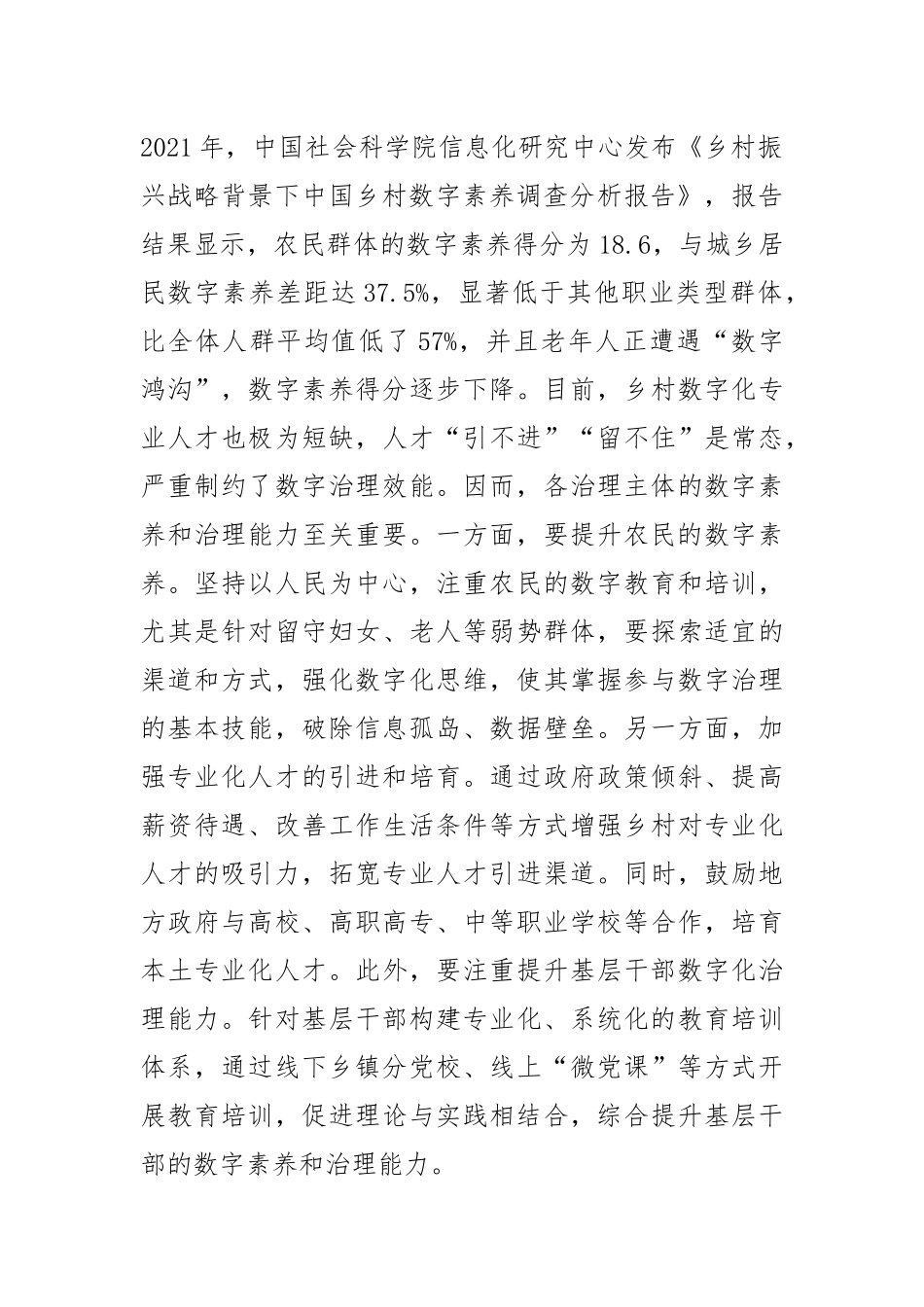 【乡镇党委书记中心组研讨发言】加快推动数字技术赋能乡村治理党的二十大报告明确指出,要完善社会治理体系。完善网格化管理、精细化服务、信息化支撑的基层治理平台;加快建设制造强国、质量强国、航天强国、交通强国、网络强国、数字中国。数字技术作为现代化治理体系的有力支撑,精准契合了乡村治理需求,为现代化治理手段下沉到乡村治理实践提供了支持,成为重塑乡村治理格局的动力引擎。一、理念层面:突破传统束缚,强化多元共治根深蒂固的传统治理理念具有很强的影响力,成为了数字治理理念内化于乡村治理实践的阻滞因素。不仅是部分基层干部缺乏数字化思维,农民对数字治理的接受和认同感不足,而且村委会、乡镇政府及县直相关单位等诸多主体,仍然存在定位不准、职责不清、各自为政现象。因此,需要突破传统治理理念束缚,强化多元共治。一方面,要加大数字治理理念的推广和宣传。使基层政府、社会组织、村民等各类治理主体全面认识和理解乡村数字治理的重要性和必要性,从思想层面上认同和接受,继而升级为实践中主动运用这一工具的行动自觉,主动运用数字治理解决实际问题。另一方面,要加强多元共治理念的塑造。数字治理强调高效协调政府、社会组织、农民及市场机构等多元主体,利用数字技术突破信息共享的空间局限,破解治理供需间的信息不对称问题,促进数字技术与乡村治理的深度耦合。二、能力层面:提升数字素养,注重人才培养2021年,中国社会科学院信息化研究中心发布《乡村振兴战略背景下中国乡村数字素养调查分析报告》,报告结果显示,农民群体的数字素养得分为18.6,与城乡居民数字素养差距达37.5%,显著低于其他职业类型群体,比全体人群平均值低了57%,并且老年人正遭遇“数字鸿沟”,数字素养得分逐步下降。目前,乡村数字化专业人才也极为短缺,人才“引不进”“留不住”是常态,严重制约了数字治理效能。因而,各治理主体的数字素养和治理能力至关重要。一方面,要提升农民的数字素养。坚持以人民为中心,注重农民的数字教育和培训,尤其是针对留守妇女、老人等弱势群体,要探索适宜的渠道和方式,强化数字化思维,使其掌握参与数字治理的基本技能,破除信息孤岛、数据壁垒。另一方面,加强专业化人才的引进和培育。通过政府政策倾斜、提高薪资待遇、改善工作生活条件等方式增强乡村对专业化人才的吸引力,拓宽专业人才引进渠道。同时,鼓励地方政府与高校、高职高专、中等职业学校等合作,培育本土专业化人才。此外,要注重提升基层干部数字化治理能力。针对基层干部构建专业化、系统化的教育培训体系,通过线下乡镇分党校、线上“微党课”等方式开展教育培训,促进理论与实践相结合,综合提升基层干部的数字素养和治理能力。三、基建层面:加强设施建设,夯实治理基础由于受经济发展、地理位置、人口规模等多方面因素的影响,乡村地区的数字基础设施建设无论在硬件还是软件方面都存在短板,与城市地区有较大的差距。据2022年第50次《中国互联网络发展状况统计报告》数据,截至2022年6月,城镇地区互联网普及率为82.9%,农村地区互联网普及率为58.8%,低于城镇24.1个百分点。我国城镇网民规模达7.58亿,占网民整体的72.1%;农村网民规模达2.93亿,仅占网民整体的27.9%。2021年9月,中央网信办联合农业农村部、工信部等多部门发布《数字乡村建设指南1.0》,明确提出在数字乡村总建设框架基础上要不断加快乡村数字基础设施建设,夯实数字治理基础。因此,要加快数字治理平台及基础设施的建设,夯实乡村数字化治理基础,持续弥合城乡数字鸿沟,促进乡村治理供需对接。深耕数字惠民工程,加快乡村“双基共建”建设,持续扩大5G网络覆盖范围。四、制度层面:完善治理机制,健全保障体系乡村数字治理能否有效落地,健全的制度保障体系至关重要。国家在数字乡村、数字治理等方面,已经制定颁布了一系列政策措施,如《数字乡村发展战略纲要》《关于开展国家数字乡村试点工作的通知》《数字乡村发展行动计划(2022—2025年)》等,形成了有力的顶层设计与政策支撑。但是,很多地方的乡村数字治理尚处于起步阶段,相应的治理机制不健全,缺乏配套的法律法规,面...