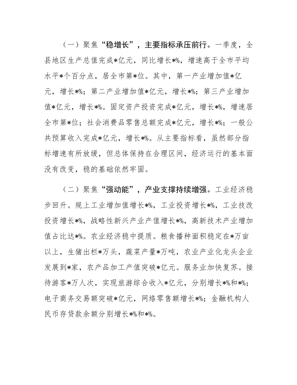 某县委在市委第一季度经济运行分析调度会上的表态发言同志们:今天,市委召开第一季度经济运行分析调度会,专题研究部署下阶段经济工作,充分体现了市委抓经济、促发展的鲜明导向和坚定决心。作为县域经济单元,我们深感责任重大、使命光荣。今年以来,在市委的坚强领导下,我县深入贯彻中央和省委、市委经济工作会议精神,坚持稳中求进、以进促稳、先立后破,全力以赴拼经济、搞建设、抓发展,一季度经济运行呈现“总体平稳、稳中有进、进中承压”态势。下面,我代表县委从三个方面作表态发言。一、客观总结成绩,坚定发展信心,以清醒认识把握经济运行态势今年以来,面对复杂严峻的宏观经济环境和艰巨繁重的发展任务,我县始终把经济建设作为中心工作,以“开局就是决战、起步就要冲刺”的奋进姿态,全力推动经济实现质的有效提升和量的合理增长。(一)聚焦“稳增长”,主要指标承压前行。一季度,全县地区生产总值完成*亿元,同比增长*%,增速高于全市平均水平*个百分点,居全市第*位。其中,第一产业增加值*亿元,增长*%;第二产业增加值*亿元,增长*%;第三产业增加值*亿元,增长*%。固定资产投资完成*亿元,增长*%,增速居全市第*位;社会消费品零售总额完成*亿元,增长*%;一般公共预算收入完成*亿元,增长*%。从主要指标看,虽然部分指标增速有所放缓,但总体保持在合理区间,经济运行的基本面没有改变,稳的基础依然牢固。(二)聚焦“强动能”,产业支撑持续增强。工业经济稳步回升。规上工业增加值增长*%,工业投资增长*%,工业技改投资增长*%,战略性新兴产业产值增长*%,高新技术产业增加值占比达*%。农业经济稳中提质。粮食播种面积稳定在*万亩以上,生猪出栏*万头,蔬菜产量*万吨,农业产业化龙头企业发展到*家,农产品加工产值突破*亿元。服务业加快复苏。接待游客*万人次,实现旅游综合收入*亿元,分别增长*%和*%;电子商务交易额突破*亿元,网络零售额增长*%;金融机构人民币存贷款余额分别增长*%和*%。(三)聚焦“增后劲”,项目攻坚成效显著。坚持“项目为王”理念,深入实施“项目建设攻坚年”行动,一季度集中开工重大项目*个,总投资*亿元,年度计划投资*亿元。省重点项目完成投资*亿元,占年度计划的*%;市重点项目完成投资*亿元,占年度计划的*%。招商引资成果丰硕。新签约亿元以上项目*个,其中*亿元以上项目*个,实际到位内资*亿元,利用外资*万美元。要素保障有力有效。争取中央和省预算内资金*亿元,发行地方政府专项债券*亿元,供应建设用地*亩,有力保障了重点项目用地需求。(四)聚焦“惠民生”,社会大局和谐稳定。民生支出占一般公共预算支出的比重达*%,城镇新增就业*人,农村劳动力转移就业*万人,城乡居民人均可支配收入分别增长*%和*%。教育、医疗、文化、体育等社会事业全面发展,高考本科上线率达*%,县医院成功创建三级乙等综合医院,县文化馆、图书馆获评国家一级馆。安全生产形势总体平稳,社会治理创新深入推进,群众安全感满意度达*%,居全市第*位。二、精准研判形势,抢抓发展机遇,以超常举措攻坚二季度目标任务二季度是全年经济工作的关键期、攻坚期。我们将认真贯彻落实本次会议精神,特别是市委书记的重要讲话要求,坚持目标不变、任务不减、标准不降,以超常决心、超常举措、超常力度,全力冲刺二季度,确保实现“双过半”,为完成全年目标任务奠定坚实基础。(一)突出“三个强化”,全力稳住经济基本盘。一是强化运行调度。完善经济运行监测预警机制,坚持“周监测、月调度、季分析”制度,紧盯GDP、固定资产投资、社会消费品零售总额等关键指标,加强形势研判和精准调度,及时发现解决经济运行中的苗头性、倾向性问题。二是强化政策落实。全面落实中央和省、市稳经济一揽子政策措施,加大政策宣传解读力度,推动政策直达快享、应享尽享,切实发挥政策效应。三是强化企业帮扶。深入开展“企业服务日”活动,落实县级领导联系重点企业制度,一企一策帮助企业解决融资、用工、用地等实际困难,支持企业稳产满产、扩产增效。(二)突出“三个加快”,全力扩大有效投资。一是加快项目建设。抢抓施工黄金期,倒排工期、挂图作...