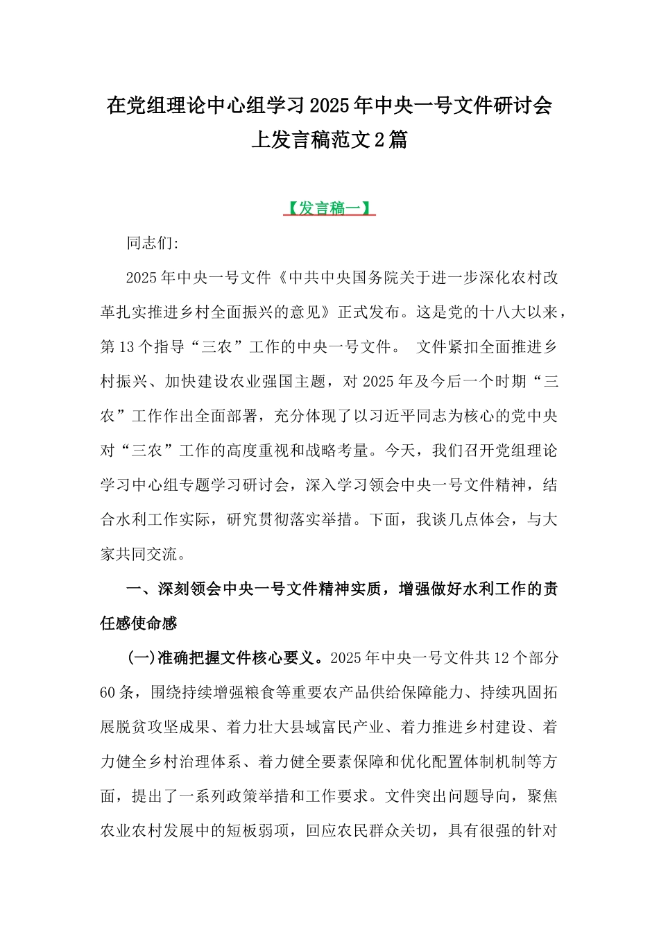 在党组理论中心组学习2025年中央一号文件研讨会上发言稿范文2篇【发言稿一】同志们:2025年中央一号文件《中共中央国务院关于进一步深化农村改革扎实推进乡村全面振兴的意见》正式发布。这是党的十八大以来,第13个指导“三农”工作的中央一号文件。文件紧扣全面推进乡村振兴、加快建设农业强国主题,对2025年及今后一个时期“三农”工作作出全面部署,充分体现了以习近平同志为核心的党中央对“三农”工作的高度重视和战略考量。今天,我们召开党组理论学习中心组专题学习研讨会,深入学习领会中央一号文件精神,结合水利工作实际,研究贯彻落实举措。下面,我谈几点体会,与大家共同交流。一、深刻领会中央一号文件精神实质,增强做好水利工作的责任感使命感(一)准确把握文件核心要义。2025年中央一号文件共12个部分60条,围绕持续增强粮食等重要农产品供给保障能力、持续巩固拓展脱贫攻坚成果、着力壮大县域富民产业、着力推进乡村建设、着力健全乡村治理体系、着力健全要素保障和优化配置体制机制等方面,提出了一系列政策举措和工作要求。文件突出问题导向,聚焦农业农村发展中的短板弱项,回应农民群众关切,具有很强的针对性和指导性。文件把保障粮食安全放在首位,提出稳定粮食播种面积,主攻单产和品质提升,确保粮食稳产丰产,这为我们水利部门做好农田水利工作指明了方向。文件强调推进乡村建设,要求推动基础设施向农村延伸,其中水利基础设施是农村基础设施的重要组成部分,我们要加快农村供水、灌溉等水利设施建设,提升农村水利保障水平。文件注重深化农村改革,提出创新乡村振兴投融资机制,这为我们拓宽水利建设资金渠道,破解水利发展资金瓶颈提供了思路。(二)充分认识水利在乡村振兴中的重要作用。水利是农业的命脉,是乡村振兴的重要支撑。水是农业生产的基本要素,良好的水利条件是保障粮食安全、发展乡村产业的基础。通过加强农田水利建设,提高灌溉保障能力,能够改善农业生产条件,提高农业综合生产能力,促进粮食增产、农业增效、农民增收。农村供水安全关系到农民群众的身体健康和生活质量。保障农村供水安全,是实现乡村振兴战略目标中“生活富裕”的基本要求,也是推进农村基本公共服务均等化的重要内容。水生态环境是乡村生态环境的重要组成部分。加强农村水生态保护和修复,改善农村水环境,能够打造生态宜居的美丽乡村,促进乡村生态振兴。水利工程建设和管理涉及面广,能够带动农村劳动力就业,促进农村经济发展,同时也为农村基层组织发挥作用提供了平台,有利于加强农村基层治理,促进乡村治理体系和治理能力现代化。(三)明确水利部门的职责使命。作为水利部门,我们要坚决贯彻落实中央一号文件精神,把保障国家粮食安全和乡村振兴战略实施作为水利工作的出发点和落脚点。要加强农田水利建设,提高灌溉保障能力,为粮食生产提供坚实的水利支撑。要加快推进农村供水工程建设和改造,提升农村供水保障水平,确保农村居民喝上安全水、放心水。要加强农村水生态保护和修复,推进河湖水系连通和农村水系综合整治,改善农村水生态环境。要积极参与乡村建设行动,加强与相关部门的沟通协调,整合资源,形成合力,共同推进乡村振兴。要深化水利改革,创新水利发展体制机制,提高水利管理水平和服务效能,为乡村振兴提供有力的制度保障。二、聚焦粮食安全,加强农田水利建设(一)加大高标准农田水利设施建设力度。高标准农田建设是提高农业综合生产能力、保障国家粮食安全的关键举措。我们要按照中央一号文件要求,加大高标准农田水利设施建设投入,提高建设标准和质量。要科学规划,根据不同地区的地形地貌、水资源条件和农业生产需求,合理布局灌溉渠道、排水系统、机井等水利设施,提高水资源利用效率。要加强工程质量监管,建立健全质量监督体系,严格执行工程建设标准和规范,确保工程质量经得起检验。要完善建后管护机制,明确管护主体和责任,落实管护经费,加强日常维护管理,确保水利设施长期发挥效益。(二)推进大中型灌区续建配套与现代化改造。大中型灌区是我国粮食生产的重要保障。要加快推进大中型灌区续建配套与现代化改造,提高灌区灌溉保证...