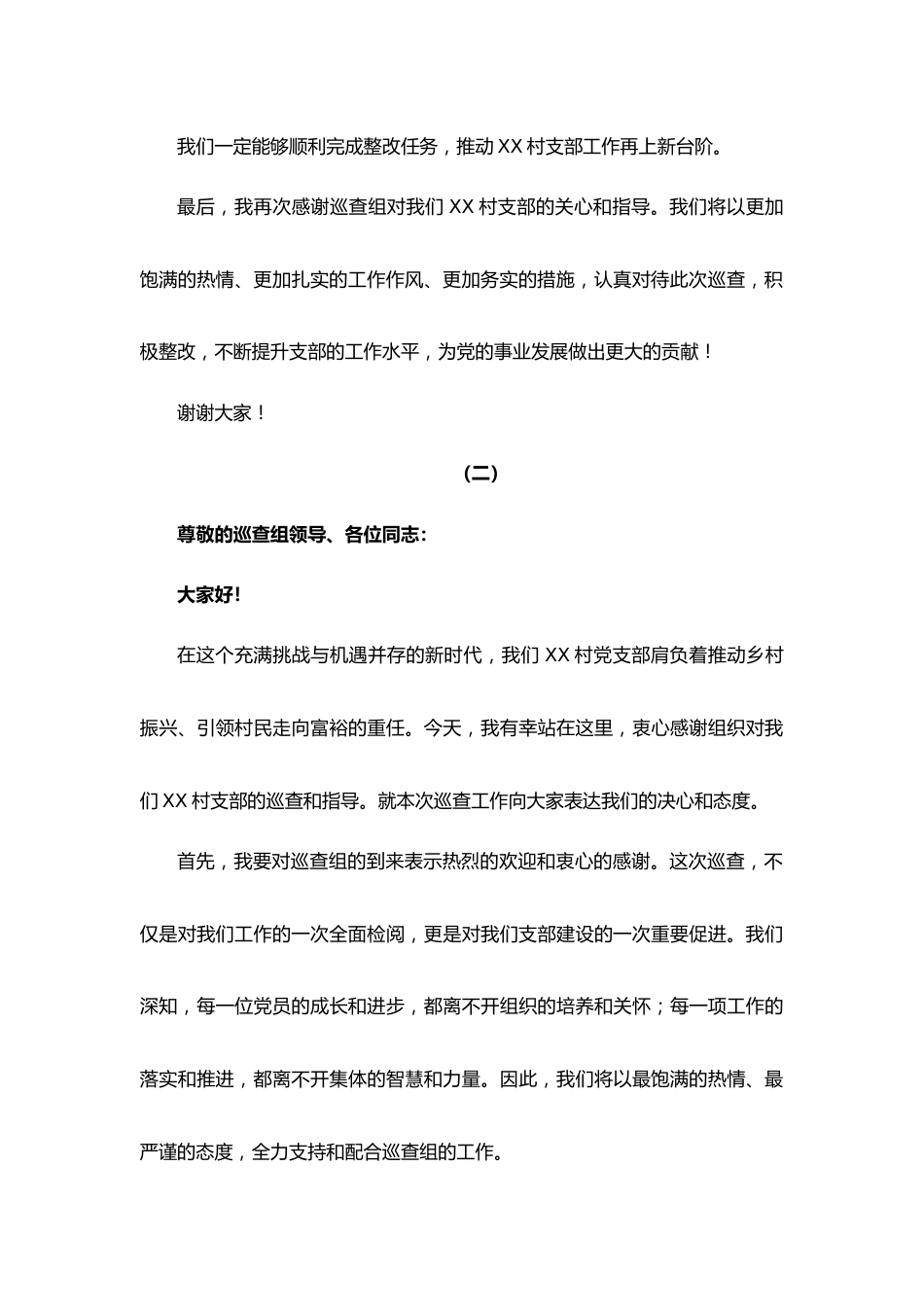 (一)尊敬的巡查组领导、各位同志:大家好!首先,我要衷心感谢组织对我们XX村支部的巡查和指导。这次巡查是对我们工作的关心与支持,也是对我们支部建设的一次全面体检和有力促进。在过去的一年里,我们XX村支部在上级党委的正确领导下,紧紧围绕“服务群众、推动发展”的核心任务,取得了一定的成绩。但是,我们也清醒地认识到,与上级的要求和群众的期待相比,我们还存在不少差距和不足。因此,我们非常期待通过这次巡查,发现问题、解决问题,推动支部工作再上新台阶。作为XX村的支部书记,我深感责任重大。在此,我向大家郑重表态:我们将全力支持和配合巡查组的工作,确保巡查工作的顺利开展。同时,我们也将认真对待巡查中发现的问题和不足,切实加以整改。具体来说,我们将采取以下措施:一是加强组织领导,明确责任分工。我们支部将成立专门的整改工作小组,由我任组长,全面负责整改工作的组织协调和督促检查。同时,我们支部将明确支委成员的职责和任务,形成齐抓共管的工作格局。二是深入分析问题,找准症结所在。我们支部将组织相关人员对巡查中发现的问题进行深入分析,找出问题的根源和症结所在,为制定切实可行的整改措施提供依据。三是制定整改方案,明确整改时限和目标。我们支部将根据问题的性质和严重程度,制定切实可行的整改方案,明确整改的时限和目标。同时,我们将建立问题清单和整改台账,确保整改工作落到实处。四是加强督促检查,确保整改到位。我们支部将建立定期督查机制,对整改工作进行督促检查。同时,我们将鼓励和支持广大党员群众积极参与整改工作,提出宝贵意见和建议。五是注重总结经验,推动长效管理。我们支部将及时总结整改工作中的经验和教训,建立健全相关制度和机制,推动支部工作实现长效管理。各位领导、同志们,我们支部深知整改工作不是一蹴而就的,需要长期坚持和努力。但是,我们相信在上级党委的正确领导下,在全体党员的共同努力下,我们一定能够顺利完成整改任务,推动XX村支部工作再上新台阶。最后,我再次感谢巡查组对我们XX村支部的关心和指导。我们将以更加饱满的热情、更加扎实的工作作风、更加务实的措施,认真对待此次巡查,积极整改,不断提升支部的工作水平,为党的事业发展做出更大的贡献!谢谢大家!(二)尊敬的巡查组领导、各位同志:大家好!在这个充满挑战与机遇并存的新时代,我们XX村党支部肩负着推动乡村振兴、引领村民走向富裕的重任。今天,我有幸站在这里,衷心感谢组织对我们XX村支部的巡查和指导。就本次巡查工作向大家表达我们的决心和态度。首先,我要对巡查组的到来表示热烈的欢迎和衷心的感谢。这次巡查,不仅是对我们工作的一次全面检阅,更是对我们支部建设的一次重要促进。我们深知,每一位党员的成长和进步,都离不开组织的培养和关怀;每一项工作的落实和推进,都离不开集体的智慧和力量。因此,我们将以最饱满的热情、最严谨的态度,全力支持和配合巡查组的工作。回顾过去的工作,我们取得了一定的成绩。在党的XX大精神的指引下,我们村党支部紧紧围绕“产业兴旺、生态宜居、乡风文明、治理有效、生活富裕”的总要求,积极推进乡村振兴战略。具体来说,我们在以下几个方面取得了显著成效:1.产业发展方面:通过引进优质高粱品种和先进种植技术,我们村的农业产值逐年增长。去年,我们村的农业总产值达到了XX万元,同比增长率达到了XX%。同时,我们还积极探索农产品深加工和销售渠道,提高农产品附加值,增加农民收入。2.基础设施建设方面:在上级党委政府的支持下,我们村的基础设施得到了大幅改善。去年,我们村新建了XX公里的水泥路,实现了村内道路硬化率100%。此外,我们还投入资金修建了XX座便民桥,解决了村民出行难的问题。同时,我们还加强了水利设施建设,新建了XX座小型蓄水池,提高了农田灌溉率。3.生态环境保护方面:我们村注重生态环境保护,积极推进绿色发展。去年,我们村完成了XX亩退耕还林任务,森林覆盖率达到了XX%。同时,我们还加强了河道治理和污水处理工作,确保了水源的清洁和生态的平衡。此外,我们还积极推广清洁能源,鼓励村民使用太阳能、沼气等清洁能源,减少对...
