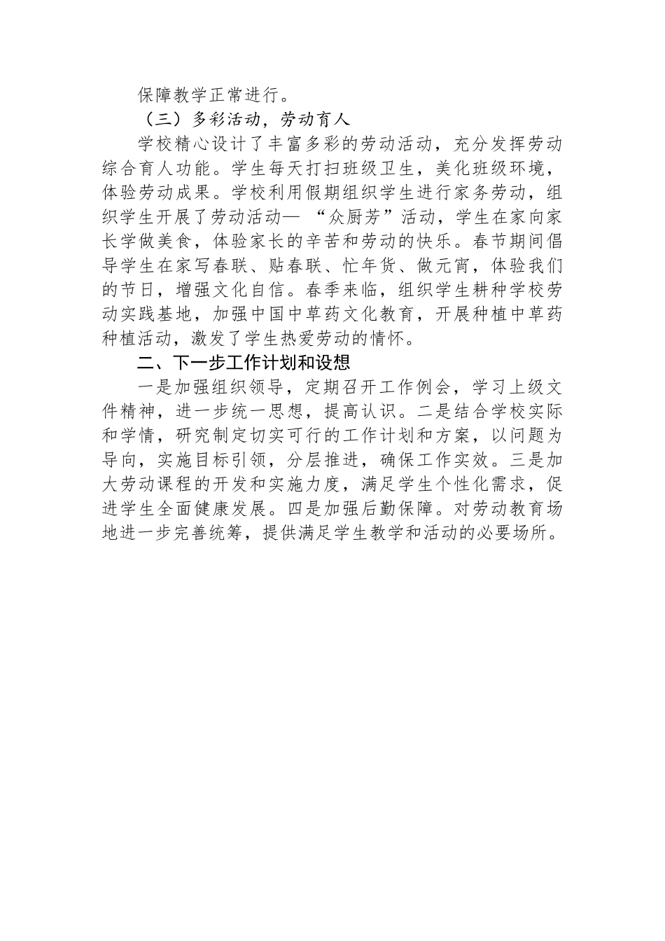 县XX中学2023年上半年劳动教育工作总结为进一步贯彻落实《中共中央国务院关于全面加强新时代大中小学劳动教育的意见》(中发〔2020〕7号),落实《教育部关于印发<大中小学劳动教育指导纲要(试行)>的通知》(教材(〔2020〕4号)和山东省教育厅劳动教育工作要求,学校高度重视,结合学校实际,研究制定工作方案并严格落实相关要求,现将工作开展情况汇报如下:一、劳动教育开展的基本情况(一)成立组织,落实责任学校成立加强学生劳动教育领导小组和工作小组,校长任组长,副校长任副组长,中层干部担任成员,办公室具体负责上级政策传达和工作宣传,组织人事科负责师资的选聘,教务处具体负责课程的开发和实施,政教处和团委负责学生劳动实践活动的组织开展,总务处负责场地保障和经费支持,安全保卫科负责学生安全保障。学校制定了学生劳动教育工作计划和实施方案,各部门各负其职,在工作中认真执行落实。(二)完善课程,周密实施学校开设了劳动课程,每周一个课时。同时开设了丰富多彩的实践课程。学校组织兴趣小组、社会实践活动,师资队伍基本稳定。教学场地有保障,功能教室兼劳动教育教室,保障教学正常进行。(三)多彩活动,劳动育人学校精心设计了丰富多彩的劳动活动,充分发挥劳动综合育人功能。学生每天打扫班级卫生,美化班级环境,体验劳动成果。学校利用假期组织学生进行家务劳动,组织学生开展了劳动活动—“众厨芳”活动,学生在家向家长学做美食,体验家长的辛苦和劳动的快乐。春节期间倡导学生在家写春联、贴春联、忙年货、做元宵,体验我们的节日,增强文化自信。春季来临,组织学生耕种学校劳动实践基地,加强中国中草药文化教育,开展种植中草药种植活动,激发了学生热爱劳动的情怀。二、下一步工作计划和设想一是加强组织领导,定期召开工作例会,学习上级文件精神,进一步统一思想,提高认识。二是结合学校实际和学情,研究制定切实可行的工作计划和方案,以问题为导向,实施目标引领,分层推进,确保工作实效。三是加大劳动课程的开发和实施力度,满足学生个性化需求,促进学生全面健康发展。四是加强后勤保障。对劳动教育场地进一步完善统筹,提供满足学生教学和活动的必要场所。