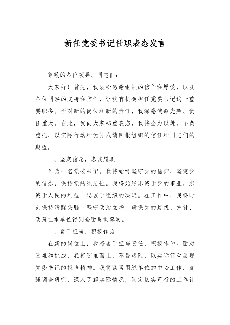 新任党委书记任职表态发言尊敬的各位领导、同志们:大家好!首先,我衷心感谢组织的信任和厚爱,以及各位同事的支持和信任,让我有机会担任党委书记这一重要职务。面对新的岗位和新的责任,我深感使命光荣、责任重大。在此,我向大家郑重表态,我将全力以赴,不负重托,以实际行动和优异成绩回报组织的信任和同志们的期望。一、坚定信念,忠诚履职作为一名党委书记,我将始终坚守党的信仰,坚定党的信念,保持党的纯洁性。我将始终忠诚于党的事业,忠诚于人民的利益,忠诚于组织的决定。在工作中,我将时刻保持清醒头脑,坚守政治立场,确保党的路线、方针、政策在本单位得到全面贯彻落实。二、勇于担当,积极作为在新的岗位上,我将勇于担当责任,积极作为。面对困难和挑战,我将迎难而上,不畏艰险,以实际行动展现党委书记的担当精神。我将紧紧围绕单位的中心工作,加强调查研究,深入了解实际情况,制定切实可行的工作计划和措施,推动单位各项事业取得新的更大发展。三、加强学习,提升能力我将始终保持学习的热情和劲头,不断加强自身的政治素养和业务能力。我将认真学习党的理论和路线方针政策,学习先进的管理理念和经验,学习业务知识和专业技能,不断提高自己的综合素质和工作能力。同时,我也将注重向同志们学习,向实践学习,不断吸取新的知识和经验,为更好地履行职责打下坚实基础。四、团结协作,共创佳绩我深知,一个人的力量是有限的,只有团结协作才能创造更大的业绩。因此,我将始终注重与班子成员和同志们的团结协作,加强沟通与交流,形成合力。在工作中,我将尊重每一位同志的意见和建议,充分发挥大家的智慧和力量,共同推动单位各项事业的发展。五、廉洁自律,树立形象作为一名党委书记,我将始终坚守廉洁自律的底线,做到清正廉洁、公正无私。我将严格遵守党的纪律和规矩自觉接受组织和群众的监督。在工作中,我将以身作则、率先垂范,树立良好的形象和榜样。最后,我要再次感谢组织的信任和同志们的支持。我将以更加饱满的热情和更加扎实的工作作风,投身到新的工作中去。我相信,在大家的共同努力下,我们一定能够开创单位事业发展的新局面!谢谢大家!