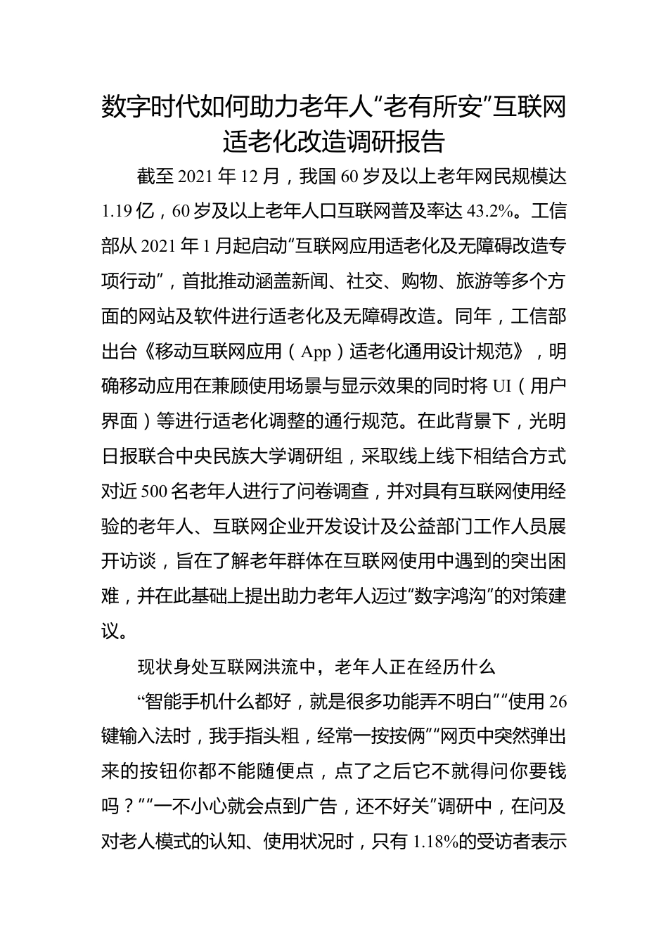 数字时代如何助力老年人“老有所安”互联网适老化改造调研报告截至2021年12月,我国60岁及以上老年网民规模达1.19亿,60岁及以上老年人口互联网普及率达43.2%。工信部从2021年1月起启动“互联网应用适老化及无障碍改造专项行动”,首批推动涵盖新闻、社交、购物、旅游等多个方面的网站及软件进行适老化及无障碍改造。同年,工信部出台《移动互联网应用(App)适老化通用设计规范》,明确移动应用在兼顾使用场景与显示效果的同时将UI(用户界面)等进行适老化调整的通行规范。在此背景下,光明日报联合中央民族大学调研组,采取线上线下相结合方式对近500名老年人进行了问卷调查,并对具有互联网使用经验的老年人、互联网企业开发设计及公益部门工作人员展开访谈,旨在了解老年群体在互联网使用中遇到的突出困难,并在此基础上提出助力老年人迈过“数字鸿沟”的对策建议。现状身处互联网洪流中,老年人正在经历什么“智能手机什么都好,就是很多功能弄不明白”“使用26键输入法时,我手指头粗,经常一按按俩”“网页中突然弹出来的按钮你都不能随便点,点了之后它不就得问你要钱吗?”“一不小心就会点到广告,还不好关”调研中,在问及对老人模式的认知、使用状况时,只有1.18%的受访者表示“非常了解,始终使用”,13.24%的受访者表示“比较熟悉,经常使用”。生理障碍:感官衰老给老年人入网带来难题互联网时代是人机交互的时代,视觉、听觉、触觉在接入互联网的过程中尤为重要,而老年人多感官的衰老都为他们的“触网困难”埋下了伏笔。调研中,视觉方面,分别有67.5%和58.3%的老人认为上网时的字号、字间距不符合他们的生理状况,难以看清文字;听觉方面,分别有62.88%和58.63%的老人认为手机音量过小、提示音太短;访谈过程中也不乏老年人提到使用智能手机触屏操作过于灵敏等问题,一位受访者(73岁)表示“智能手机非常容易按错,接电话都需要‘严阵以待’”。在视觉、听觉、触觉交互失灵的背后,是老人们接入互联网的鸿沟,是老年群体被迫脱离互联网社会的“前奏”。思维滞后:操作复杂、更新过快成为老年人入网的“拦路虎”一位大型互联网公司的开发人员表示,智能手机的UI图标、交互逻辑其实不太符合老年人的思维惯式,很多老年人在极简图标面前并不能看图知意,也很难理解智能手机目前通用的操作手势;年轻人习以为常的图标和操作逻辑不断给老年人带来难题,削弱他们的触网意愿。智能手机作为当下接入互联网的主要接口,各类手机应用争相迭代、花样翻新,当年轻人在新潮的功能中畅游冲浪时,老年人却被复杂拥挤的图标、高频转换的界面拒之门外。在调查中,软件更新频繁、无意中跳转到新页面、关不掉各类弹出式信息三类情况均给超过60%的老年人带来了“触网”难题,有受访对象(59岁)表示“一不小心就会点到广告一类的内容,还很难关掉”“手机太灵敏,不知道一碰会发生什么”。此外,调研中还了解到,目前仍存在部分老年人识字率低、受教育程度不高的情况,他们在接入互联网的过程中难以识别界面内容。老年人在日新月异的互联网环境中难以适应,任何一款新功能、任何一次灵活的界面转换都可能会造成他们在互联网中的“迷失”,成为阻拦他们“入网”的道道关卡。心理不适:入网障碍和求助行为给老年人造成心理负担调查发现,很多老年人在接入互联网的过程中自身主动性非常低,47.75%的老年人明确表示不太愿意学习新应用软件,很多受访者也拒绝接触“非必需”软件。究其原因是他们上网时难以顺利解决遇到的问题。调查显示,15.37%的老年人遇到困难会直接放弃处理,20.57%的老年人选择自己查找解决方法,这些入网障碍不断积攒,最终引发了老年人抵触入网的心理。另外,老年人在遇到困难时产生的求助行为也会使他们产生心理不适、不断降低自我效能感,有46.57%的老年人表示求助会有“不好意思”的感受,入网障碍和求助行为给老年人的互联网使用带来双重心理负担。难辨真假:诈骗陷阱、谣言漩涡带来心理恐慌互联网环境具有自身的复杂性,诈骗陷阱、虚假信息等在各式伪装下往往难以辨认。调查中有47%的老年人担心遭遇网络诈骗,一位70岁的受访老人表示“不可能在网络上花钱”...