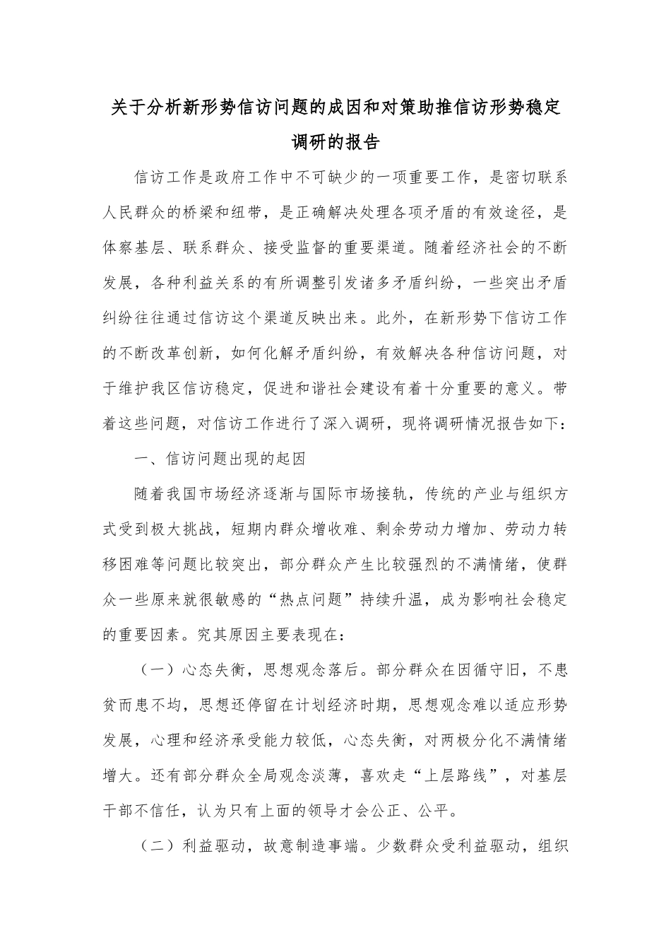 关于分析新形势信访问题的成因和对策助推信访形势稳定调研的报告信访工作是政府工作中不可缺少的一项重要工作,是密切联系人民群众的桥梁和纽带,是正确解决处理各项矛盾的有效途径,是体察基层、联系群众、接受监督的重要渠道。随着经济社会的不断发展,各种利益关系的有所调整引发诸多矛盾纠纷,一些突出矛盾纠纷往往通过信访这个渠道反映出来。此外,在新形势下信访工作的不断改革创新,如何化解矛盾纠纷,有效解决各种信访问题,对于维护我区信访稳定,促进和谐社会建设有着十分重要的意义。带着这些问题,对信访工作进行了深入调研,现将调研情况报告如下:一、信访问题出现的起因随着我国市场经济逐渐与国际市场接轨,传统的产业与组织方式受到极大挑战,短期内群众增收难、剩余劳动力增加、劳动力转移困难等问题比较突出,部分群众产生比较强烈的不满情绪,使群众一些原来就很敏感的“热点问题”持续升温,成为影响社会稳定的重要因素。究其原因主要表现在:(一)心态失衡,思想观念落后。部分群众在因循守旧,不患贫而患不均,思想还停留在计划经济时期,思想观念难以适应形势发展,心理和经济承受能力较低,心态失衡,对两极分化不满情绪增大。还有部分群众全局观念淡薄,喜欢走“上层路线”,对基层干部不信任,认为只有上面的领导才会公正、公平。(二)利益驱动,故意制造事端。少数群众受利益驱动,组织策划群众上访,煽动群众闹事,以便自己从中获利。如因集体资源、宗派利益等产生磨擦,就故意挑起矛盾,煽动群众闹事。有的是为了博得群众对自己的信任,让上级觉得自己有能力处理各种棘手之事。还有的为了达到自己的目的,千方百计制造事端,激发矛盾为自己非法谋利提供条件。只要出现一定规模的上访,一般都存在着组织者、领导者。(三)被动服务,信访工作能力亟需增强。一是基层组织因经济基础薄弱,服务功能被动、弱化,没有及时、主动地去帮助群众解决生产、生活中出现的困难和问题,致使一些本来很小的矛盾激化升级,酿成大纠纷,从而加大了调处的难度。二是部分干部文化素质偏低,分析问题、解决问题的能力较差。有个别干部,政治思想很好,品德人缘也很好,群众称为“老实人”。但是,一遇到难办的事,就讲不出政策,说不出道理,拿不出新招,调处起来不周全,没有一定的魄力和前瞻性,使一些问题由小变大,由少积多,逐步酿成大的矛盾。(四)管理滞后,民主氛围不浓。信访管理制度落实不到位,一些重要制度执行不到位的问题仍不同程度地存在,导致群众对民主管理的监督缺失,群众的利益受损,进而引起群众的强烈不满。有些信访多村和街道征求群众意见较少等等。二、新形势下做好农村信访工作的对策(一)抓住“早”,变上访为下访。要及时捕捉信息,及早化解矛盾。在具体操作中,要坚决克服“上访无好人”的观点,正确对待上访群众,教育引导群众通过正当渠道反映问题,依照法律法规解决矛盾,及时有效地疏导群众。要立足于“抓早、抓小、抓苗头”,经常深入基层调查研究,广泛搜集信息,超前预测,防患未然。要把易发、多发信访的村、街道、企业作为重点排查对象,对排查出的苗头性、倾向性问题和不安定因素,及时摸清产生的原因,有针对性地制定解决措施,将问题化解在萌芽状态。(二)突出“快”,变久拖为速决。对于群众上访,接访后要做到快调查、速处理、快结案,力争一次处理到位,不留后患,避免重复上访、越级上访的发生。在调查处理中要坚持两个“要”,把握两个“关”,做到“三不结”。即:事实要查细,把握好事实关;有错要必纠,把握好处理关。要做到问题未查清的不结案;处理结果未与上访人见面的不结案;调查结论群众不满意的不结案。(三)把握“源”,变处理为预防。实践中,每发生一次群众上访都会存在一定的工作成本,而一旦引发集体上访,则更加需要花费大量的人力、物力和财力。因此,我们在解决群众上访问题的同时,要注重超前防范,标本兼治,从根本上减少信访案件的发生。一是要配备好强有力的基层信访干部队伍。二是要加强对群众信访工作的创新解决能力,提高信访队伍的政治素质和工作能力。(四)强化“责”,变被动为联动。...