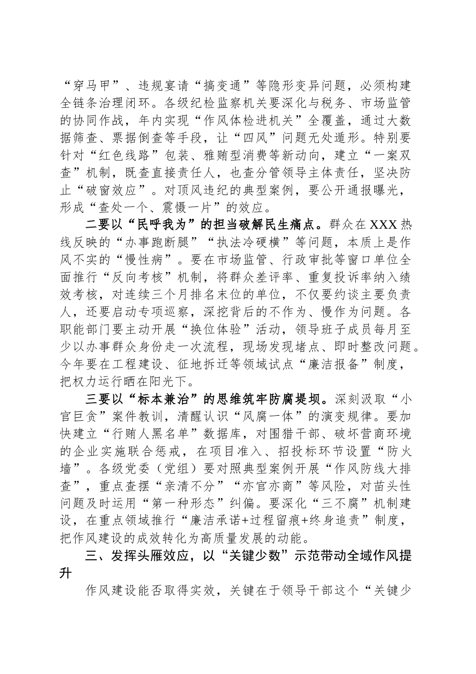 在深入贯彻xxx精神学习教育读书班作风建设集中学习研讨发言材料同志们:在全党上下开展xxx精神学习教育之际,市委举办这次作风建设专题读书班,既是贯彻落实党中央关于加强作风建设决策部署的具体行动,更是推动全面从严治党向纵深发展的关键举措。按照读书班学习安排,我们集中学习了中央党的建设工作领导小组会议精神、原原本本重温了中央八项规规定全文,全市上下必须从政治高度深刻领悟作风建设“永远在路上”的深意,以党的创新理论为行动指南,全面落实党中央部署要求,在深学细悟中找准方向,在真查实改中激浊扬清,在常态长效中锻造铁军,以过硬作风保障中国式现代化实践行稳致远。一、站稳政治立场,以理论清醒强化作风建设使命担当作为党员领导干部,我们必须在作风建设这一重大命题上保持高度的政治清醒和责任担当。“党的作风就是党的形象,关系人心向背,关系党的生死存亡”,这一论断深刻揭示了作风建设在党和国家事业全局中的根本性地位。我们要始终将作风建设作为检验拥护“两个确立”、践行“两个维护”的试金石,从政治高度把握作风问题的本质,以理论武装夯实实践根基。从苏区干部“自带干粮办公”的朴素传统,到新时代党推进自我革命的战略部署,作风建设始终是党永葆生机活力的关键。当前,面对改革发展稳定中复杂多变的挑战,我们必须警惕“高楼大厦背后脱离群众的危险”,摒弃任何形式的官僚主义、形式主义,切实以作风建设实效筑牢党的执政根基。为此,我们必须坚持从创新理论中汲取营养,把学习本次学习教育与弘扬党的优良传统紧密结合。去年,我们以专题研讨形式重温苏区精神,深入剖析“塔西佗陷阱”警示案例,通过“作风建设与城市治理现代化”大讨论,推动全市干部深刻认识“作风不正则民心不聚、事业难兴”的客观规律。同时,注重“以案促学、以学促改”,组织基层单位对照典型案例查摆问题,引导干部用理论清醒破除思想麻痹,树牢“为民用权、为民担责”的政绩观。今年以来,我们围绕中央纪委四次全会“四个聚焦”部署开展专项整治,直面群众反映强烈的痛点堵点:针对政务服务窗口“推诿扯皮”顽疾,建立窗口服务“一事一评”考核机制;针对惠民资金“悬空挂账”、文旅项目“指尖浪费”等隐形中梗阻问题,出台《市县两级干部作风正负面清单二十条》,明确“可为”与“不可为”的标尺;通过群众监督、媒体曝光与纪检督办“三线联动”,让“躺平式”干部无处遁形。这些举措表明,作风建设必须从具体问题切入,以钉钉子精神推动整改落地。作风建设不仅要立足当下,更要着眼长远,以体制性改革破解深层次矛盾。对此,我们坚持以刀刃向内的勇气推进制度革新,通过整合压缩市级督导考核指标,将“基层减负增效”纳入巡查整改硬性要求,推动考核从“台账厚度”向“群众满意度”转变;建立“一线工作法”激励机制,要求领导干部每周深入社区、企业、工地现场办公;在市级重大项目推进中实施“作风承诺制”,将作风建设成效与干部考核选拔直接挂钩。作风顽疾的根治既要强化思想引领,更要用制度保障实干者有位、懈怠者让位,真正让“担当作为、务实清廉”成为全市干事创业的主旋律。二、聚焦问题攻坚,以刀刃向内的魄力深化作风顽疾整治当前,我市正处于转型升级的关键期,群众对干部作风的期待更高,改革发展对作风效能的要求更严。我们要以此次集中学习为契机,聚焦问题、直击痛点,持续加压发力。一要以“刮骨疗毒”的决心整治作风顽疾。面对公款旅游“穿马甲”、违规宴请“搞变通”等隐形变异问题,必须构建全链条治理闭环。各级纪检监察机关要深化与税务、市场监管的协同作战,年内实现“作风体检进机关”全覆盖,通过大数据筛查、票据倒查等手段,让“四风”问题无处遁形。特别要针对“红色线路”包装、雅贿型消费等新动向,建立“一案双查”机制,既查直接责任人,也查分管领导主体责任,坚决防止“破窗效应”。对顶风违纪的典型案例,要公开通报曝光,形成“查处一个、震慑一片”的效应。二要以“民呼我为”的担当破解民生痛点。群众在XXX热线反映的“办事跑断腿”“执法冷硬横”等问题,本质上是作风不实的“慢性病”。要在市场...