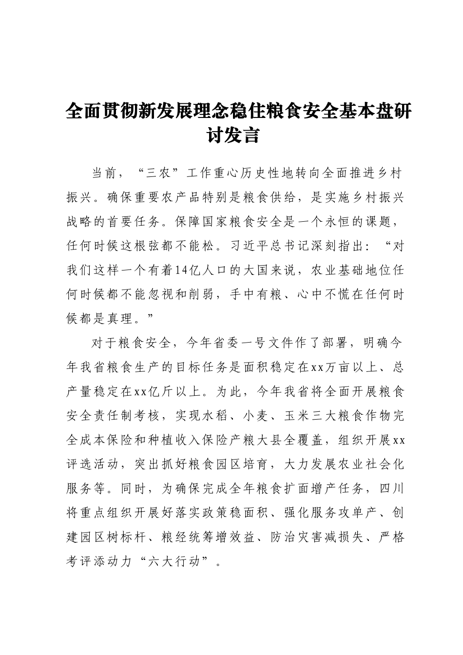 全面贯彻新发展理念稳住粮食安全基本盘研讨发言当前,“三农”工作重心历史性地转向全面推进乡村振兴。确保重要农产品特别是粮食供给,是实施乡村振兴战略的首要任务。保障国家粮食安全是一个永恒的课题,任何时候这根弦都不能松。习近平总书记深刻指出:“对我们这样一个有着14亿人口的大国来说,农业基础地位任何时候都不能忽视和削弱,手中有粮、心中不慌在任何时候都是真理。”对于粮食安全,今年省委一号文件作了部署,明确今年我省粮食生产的目标任务是面积稳定在xx万亩以上、总产量稳定在xx亿斤以上。为此,今年我省将全面开展粮食安全责任制考核,实现水稻、小麦、玉米三大粮食作物完全成本保险和种植收入保险产粮大县全覆盖,组织开展xx评选活动,突出抓好粮食园区培育,大力发展农业社会化服务等。同时,为确保完成全年粮食扩面增产任务,四川将重点组织开展好落实政策稳面积、强化服务攻单产、创建园区树标杆、粮经统筹增效益、防治灾害减损失、严格考评添动力“六大行动”。在xx会中提出要构建以“中国农业硅谷”为龙头的绿色农业产业体系。依托xx谷得天独厚的光热资源,以高端育种为核心,坚持“科学、技术、生产”三位一体深度融合,聚集农业高校、科研机构、领军企业、头部公司,推进品种选育、品系改良、育种材料创制、高效培育技术等现代种业新技术、新产品新产业,串珠成链,结链成谷,把xx谷建成全国乃至全球具有较大影响力和较大知名度的“中国农业硅谷”,在维护国家种业中展现xx担当。在县xx会提出要牢固树立“粮猪安天下、特色促增收”的农业产业发展理念,深化农业供给侧结构性改革,推进农业现代化、精品化。确保粮食安全。严守耕地保护红线,落实“藏粮于地、藏粮于技”战略,确保粮食增产增收,提质增效。一、粮食安全提升到国家战略层面是基于国际内外形势做出的重大部署就中央、省、州而言,都将粮食安全战略提到了一个前所未有的高度,同时从外部国际形势和内部形势上看,都能印证“粮食多一点少一点是战术问题,粮食安全则是战略问题”的深远涵义。从外部形式上来看,这主要包括国际安全形势、世界粮食价格以及世界各国的粮食进出口政策等。一是国际形势变化对我国粮食的国际供给产生复杂影响。当今世界正处于百年未有之大变局,大变局必然带来大调整,也可能引发大动荡。受xx影响,世界经济增速趋缓、国际交往受限、经济全球化遭遇逆流、地缘政治风险上升,一些传统产粮大国出于各种原因开始收紧粮食出口政策。据统计,从新冠肺炎疫情暴发到xx,全球共有38个国家或地区针对196种农产品累计实施了1336项出口限制措施,其中大部分措施都集中针对粮食产品。二是农业竞争力不强,农业产业链面临被进一步挤压和控制的风险。一方面,外资大举抢占上游种业市场份额,在一定程度上埋下了粮食安全隐患。数据显示,过去100年,农业生产效率的提升60%得益于种子技术的发展。种子被称为农业的“芯片”。目前,我国种子企业有3000多家,总体上呈现出“小、散、弱”的特点。中国种子贸易协会数据显示,xx年我国种子进口量为6.6万吨,进口额4.35亿美元,进出口赤字约为2.24亿美元。我国主粮水稻与小麦种子基本可以自足,但玉米、马铃薯种子依赖进口程度较高,大豆基本依赖进口。目前国内大量种植的番茄、洋葱、茄子、胡萝卜、辣椒、西兰花的种子都是依赖进口。“种业发展基础仍不牢固,保障种源自主可控比过去任何时候都更加紧迫。”另一方面,国际粮农巨头不断加强对农产品加工、销售和研发等高附加值环节的拓展,而我国农业尖端科技发展不平衡、总体研发水平偏低、竞争力不强,直接影响我国民族粮食品牌的建设发展,对我国农业发展造成较大压力。就内部形式来看,这主要体现在粮食生产土地、能力质量等方面。一是耕地面积持续减少。历史地看,我国人多地少矛盾十分突出,户均耕地规模仅相当于欧盟的四十分之一、美国的四百分之一。xx年第三次全国国土调查数据显示,我国耕地面积19.18亿亩。和第二次全国土地调查相比,10年间全国耕地地类减少了1.13亿亩。不断减少的耕地面积势必会削弱我国粮食生产能力,影响粮食安全。二是土地污染严重。国家统计局的数据显示...