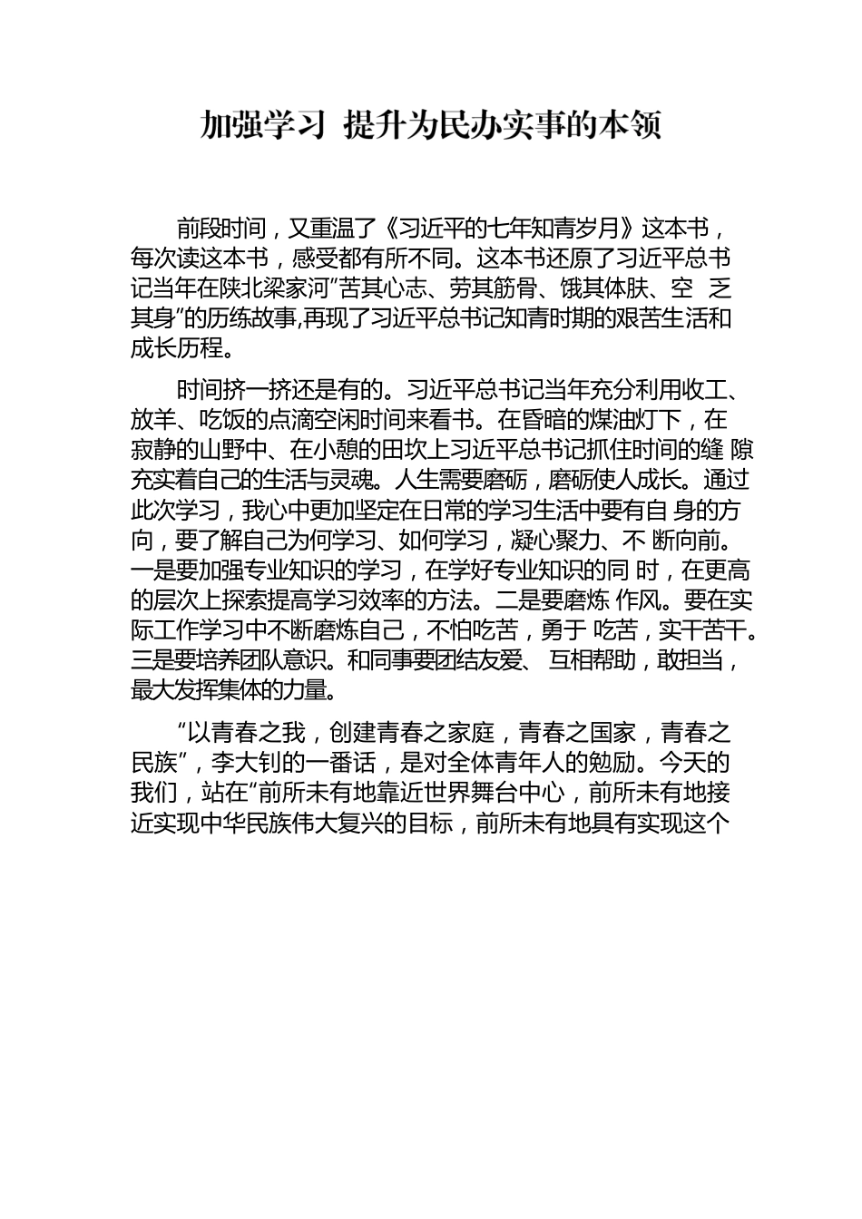 前段时间,又重温了《习近平的七年知青岁月》这本书,每次读这本书,感受都有所不同。这本书还原了习近平总书记当年在陕北梁家河”苦其心志、劳其筋骨、饿其体肤、空乏其身”的历练故事,再现了习近平总书记知青时期的艰苦生活和成长历程。时间挤一挤还是有的。习近平总书记当年充分利用收工、放羊、吃饭的点滴空闲时间来看书。在昏暗的煤油灯下,在寂静的山野中、在小憩的田坎上习近平总书记抓住时间的缝隙充实着自己的生活与灵魂。人生需要磨砺,磨砺使人成长。通过此次学习,我心中更加坚定在日常的学习生活中要有自身的方向,要了解自己为何学习、如何学习,凝心聚力、不断向前。一是要加强专业知识的学习,在学好专业知识的同时,在更高的层次上探索提高学习效率的方法。二是要磨炼作风。要在实际工作学习中不断磨炼自己,不怕吃苦,勇于吃苦,实干苦干。三是要培养团队意识。和同事要团结友爱、互相帮助,敢担当,最大发挥集体的力量。“以青春之我,创建青春之家庭,青春之国家,青春之民族”,李大钊的一番话,是对全体青年人的勉励。今天的我们,站在“前所未有地靠近世界舞台中心,前所未有地接近实现中华民族伟大复兴的目标,前所未有地具有实现这个目标的能力和信心”的历史节点,更当努力思索,自己所追求的人生是什么样,自己所参与建设的中国未来是什么样。这个问题,在梁家河的田垄上,在乡亲们的口碑中,在习近平总书记一句“作为一个人民公仆,陕北高原是我的根,因为这里培养出了我不变的信念:要为人民做实事!”的自述里可以找到答案。