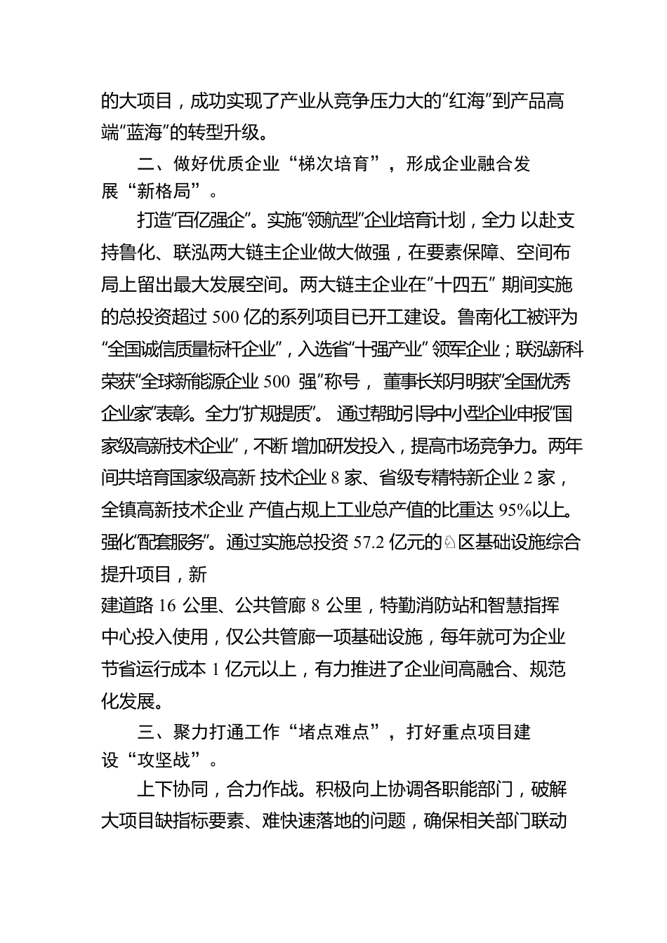 乡镇工业经济发展工作汇报去年以来,我镇树牢“快就是大局”理念,结合“工业强市、产业兴市”三年攻坚突破行动,不断完善产业体系、做好企业培育、推进项目建设,蹚出了一条以工业强势突破、产业提质升级的XX路径。一、构建“一体两翼”产业体系,加速开启工业发展“强引擎”。“一体”带动。聚焦高端化工主业,按照“中游补链、下游延链、整体强链”的思路,编制“十四五”产业发展规划,开展产业链精准招商,两年来共签约总投资超600亿元的系列高端化工产业项目,实现了“从原料到材料”“从低端到高端”的转型升级。“两翼”协同。一方面,构建高端化工向新能源产业转型发展。突出锂电产业首位驱动,结合现有产业链对锂电产业上下游进行深入剖析,选定了从煤到甲醇制烯烃再到锂电池电解液、隔膜材料的产业链条,把产量大的甲醇、醋酸等初端产品升级为碳酸酯、超高分子量聚乙烯等终端产品,打通了从“地下黑色能源”到“地上绿色能源”的产业聚合新路径。另一方面,构建高端化工向新材料产业转型发展。用创新链布局产业链,充分发挥煤基化工新材料技术创新中心等14个创新中心的作用,重点突破POE、PLA等新材料领域“卡脖子”技术,规划建设了2000亩的高端尼龙材料产业♘,通过招引落地尼龙6材料、生物可降解材料的大项目,成功实现了产业从竞争压力大的“红海”到产品高端“蓝海”的转型升级。二、做好优质企业“梯次培育”,形成企业融合发展“新格局”。打造“百亿强企”。实施“领航型”企业培育计划,全力以赴支持鲁化、联泓两大链主企业做大做强,在要素保障、空间布局上留出最大发展空间。两大链主企业在”十四五”期间实施的总投资超过500亿的系列项目已开工建设。鲁南化工被评为“全国诚信质量标杆企业”,入选省“十强产业”领军企业;联泓新科荣获“全球新能源企业500强”称号,董事长郑月明获“全国优秀企业家”表彰。全力“扩规提质”。通过帮助引导中小型企业申报“国家级高新技术企业”,不断增加研发投入,提高市场竞争力。两年间共培育国家级高新技术企业8家、省级专精特新企业2家,全镇高新技术企业产值占规上工业总产值的比重达95%以上。强化“配套服务”。通过实施总投资57.2亿元的区基础设施综合♘提升项目,新建道路16公里、公共管廊8公里,特勤消防站和智慧指挥中心投入使用,仅公共管廊一项基础设施,每年就可为企业节省运行成本1亿元以上,有力推进了企业间高融合、规范化发展。三、聚力打通工作“堵点难点”,打好重点项目建设“攻坚战”。上下协同,合力作战。积极向上协调各职能部门,破解大项目缺指标要素、难快速落地的问题,确保相关部门联动保障土地、能耗、煤耗等要素配置。联泓锂电材料碳酸酯项目建设周期比同类型项目缩短13个月,创造了化工类项目的最快速度。专班推进,兵团作战。结合镇域“鲁化东展、联泓南延、多点开花”的发展规划,以321省道为界限,成立了由两名副书记牵头的征地专班。所有专班成员以“一对一”“多对一”的形式,对项目的前期选址、用地拆迁等方面进行全方位帮包,并用时一个月完成30万吨/年己内酰胺项目664亩土地的征收工作。全流程服务,挂图作战。针对全年总投资259.4亿元的19个省市重点项目,按照立项申请、规划审批、开工建设等12个关键节点,逐一绘制“进度图”。面对疫情冲击,落实好项目现场闭环管理、施工人员核酸检测、畅通物资运输渠道等措施,全力保障好项目建设进度。19个重点项目在疫情期间“不停工、不打烊”,超额完成全年投资计划。