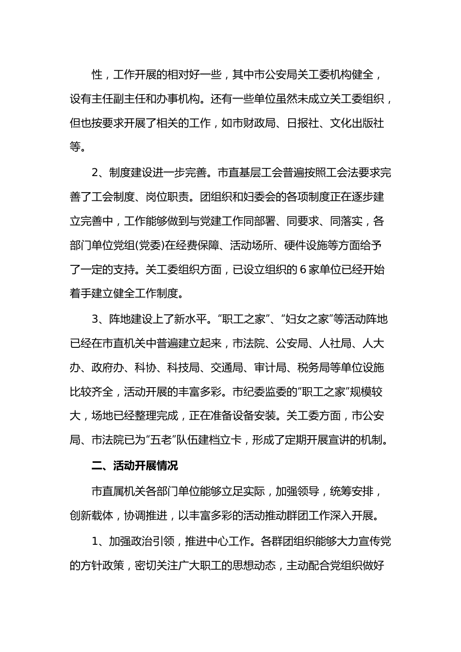 党建带群建工作督查调研报告3500字市委直属机关工委党建带群建工作督查调研报告为贯彻落实我市群团工作会议精神,加强市直机关党建带群建工作,市直属机关工委组成由领导同志带队的三个督查调研组,从2019年3月底至4月上旬深入市直63个部门单位开展了党建带群建工作督查调研。工作中,各组同志认真听取工作汇报,实地查看相关资料,与各单位群团负责人和具体工作人员座谈了解情况,帮助他们学习吃透上级要求和相关法律章程,协助他们理清工作思路、明确工作重点。通过督查调研挖掘到了许多工作亮点,也发现了一些普遍存在的问题或困难,现将总体情况报告如下:一、组织建设情况总的来看,市直属机关各部门单位坚持“党建带动群建,群建服务党建”的基本思路,围绕中心、服务大局,始终把群团工作作为党建工作的一部分不断加强组织体系建设。1、组织机构进一步健全。市直各部门单位的工会、妇委会组织都已建立起来,普遍选举了工作能力强、业务素质高的骨千人员担任负责人,组织机构进一步健全,工作水平不断提高。团组织建设方面,市直共有25个部门单位设立各级团委4个、团支部21个,占工委管辖部门单位的三分之一,其他未设团组织的单位主要是因为没有适龄的团员青年或团员青年人数不足。目前市直机关设立关工委组织的单位共6家,即市委政法委、公检法机关、团市委及市体校,他们大多直属于市关工委,能够较好地发挥离退休党支部老同志的优势和积极性,工作开展的相对好一些,其中市公安局关工委机构健全,设有主任副主任和办事机构。还有一些单位虽然未成立关工委组织,但也按要求开展了相关的工作,如市财政局、日报社、文化出版社等。2、制度建设进一步完善。市直基层工会普遍按照工会法要求完善了工会制度、岗位职责。团组织和妇委会的各项制度正在逐步建立完善中,工作能够做到与党建工作同部署、同要求、同落实,各部门单位党组(党委)在经费保障、活动场所、硬件设施等方面给予了一定的支持。关工委组织方面,已设立组织的6家单位已经开始着手建立健全工作制度。3、阵地建设上了新水平。“职工之家”、“妇女之家”等活动阵地已经在市直机关中普遍建立起来,市法院、公安局、人社局、人大办、政府办、科协、科技局、交通局、审计局、税务局等单位设施比较齐全,活动开展的丰富多彩。市纪委监委的“职工之家”规模较大,场地已经整理完成,正在准备设备安装。关工委方面,市公安局、市法院已为“五老”队伍建档立卡,形成了定期开展宣讲的机制。二、活动开展情况市直属机关各部门单位能够立足实际,加强领导,统筹安排,创新载体,协调推进,以丰富多彩的活动推动群团工作深入开展。1、加强政治引领,推进中心工作。各群团组织能够大力宣传党的方针政策,密切关注广大职工的思想动态,主动配合党组织做好职工的思想政治工作,引导职工、妇女、团员青年正确对待和理解单位的各项决策,贯彻执行上级重大决策部署。市委办组织开展《习近平总书记成长之路》主题学习研讨、安全教育、五四青年节主题党日、团日。市妇联组织职工观看《邹碧华》《云曙碧》等宣传教育影片。市外事办举办“转作风、提素质、能担当”演讲活动。市接待办举办“党务和业务知识竞赛”。市公安局“关心下一代”宣讲团多次走进校园开展“传承红色基因争做新时代好少年”等爱国主义和法治教育。市发改委以微信群组的形式学习研讨了习总书记关于青少年和共青团的重要指示和讲话精神。市场监管局组织观看《家风》宣传片,开展了“巾帼展风采建功新时代”活动。市住建委积极组织女职工参加“不忘初心跟党走,住建儿女爱中华”朗诵比赛。市法院活动载体新颖丰富,通过诗歌朗诵比赛、讲身边故事、文艺汇演、书画摄影比赛等弘扬社会主义核心价值观。2、服务基层群众,助力脱贫攻坚。一些部门在服务群众的活动中注重关爱困难群体,将扶贫与扶智相结合,为脱贫攻坚助力。市法院组织干警对鄂温克旗贫困学生进行资助。团市委为特教中心筹建“爱心书吧”并捐款捐物6万元。文化出版社开展送书下乡、送书进校等活动,在哈克村设立文化书架。市委组织部开展了为帮扶贫困户捐款活动。市体校每年开展老职工、贫困职工慰问工作。3...