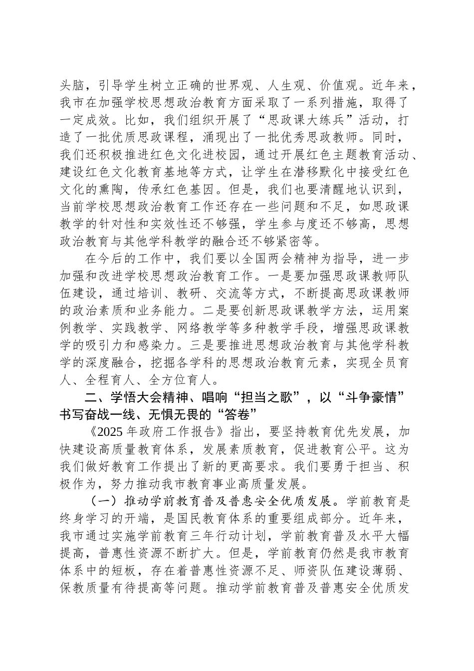 市教育局局长在理论学习中心组会上的研讨发言材料同志们:今年的全国两会,是在深入贯彻落实党的XX大和二十届二中、三中全会精神,全面建设社会主义现代化国家开局起步的关键时期召开的一次重要会议。会议期间,习近平总书记发表了一系列重要讲话,为我们做好当前和今后一个时期的工作指明了方向、提供了根本遵循。《2025年政府工作报告》对教育工作提出了明确要求,为我们推进教育事业发展提供了行动指南。通过认真学习全国两会精神和《政府工作报告》,结合我市教育工作实际,我谈几点体会。一、学悟大会精神、唱响“忠诚之歌”,以“忘我奋斗”书写许党报国、矢志不渝的“答卷”全国两会是党和国家政治生活中的一件大事,承载着人民的期望,肩负着时代的使命。习近平总书记在全国两会上的重要讲话,高屋建瓴、思想深邃,为我们在新时代新征程上推进各项工作提供了根本遵循。作为教育工作者,我们要把学习贯彻全国两会精神作为当前和今后一个时期的重要政治任务,深刻领悟“两个确立”的决定性意义,增强“四个意识”、坚定“四个自信”、做到“两个维护”,不断提高政治判断力、政治领悟力、政治执行力。忠诚于党和人民的教育事业,是教育工作者的首要政治品质。我们要牢记为党育人、为国育才的初心使命,全面贯彻党的教育方针,坚持社会主义办学方向,培养德智体美劳全面发展的社会主义建设者和接班人。要把思想政治教育贯穿教育教学全过程,加强和改进学校思想政治工作,推动习近平新时代中国特色社会主义思想进教材、进课堂、进头脑,引导学生树立正确的世界观、人生观、价值观。近年来,我市在加强学校思想政治教育方面采取了一系列措施,取得了一定成效。比如,我们组织开展了“思政课大练兵”活动,打造了一批优质思政课程,涌现出了一批优秀思政教师。同时,我们还积极推进红色文化进校园,通过开展红色主题教育活动、建设红色文化教育基地等方式,让学生在潜移默化中接受红色文化的熏陶,传承红色基因。但是,我们也要清醒地认识到,当前学校思想政治教育工作还存在一些问题和不足,如思政课教学的针对性和实效性还不够强,学生参与度还不够高,思想政治教育与其他学科教学的融合还不够紧密等。在今后的工作中,我们要以全国两会精神为指导,进一步加强和改进学校思想政治教育工作。一是要加强思政课教师队伍建设,通过培训、教研、交流等方式,不断提高思政课教师的政治素质和业务能力。二是要创新思政课教学方法,运用案例教学、实践教学、网络教学等多种教学手段,增强思政课教学的吸引力和感染力。三是要推进思想政治教育与其他学科教学的深度融合,挖掘各学科的思想政治教育元素,实现全员育人、全程育人、全方位育人。二、学悟大会精神、唱响“担当之歌”,以“斗争豪情”书写奋战一线、无惧无畏的“答卷”《2025年政府工作报告》指出,要坚持教育优先发展,加快建设高质量教育体系,发展素质教育,促进教育公平。这为我们做好教育工作提出了新的更高要求。我们要勇于担当、积极作为,努力推动我市教育事业高质量发展。(一)推动学前教育普及普惠安全优质发展。学前教育是终身学习的开端,是国民教育体系的重要组成部分。近年来,我市通过实施学前教育三年行动计划,学前教育普及水平大幅提高,普惠性资源不断扩大。但是,学前教育仍然是我市教育体系中的短板,存在着普惠性资源不足、师资队伍建设薄弱、保教质量有待提高等问题。推动学前教育普及普惠安全优质发展,我们要加大财政投入,新建、改扩建一批公办幼儿园,增加普惠性学前教育资源供给。要加强学前教育师资队伍建设,通过招聘、培训等方式,提高幼儿教师的专业素质和待遇水平。要加强幼儿园规范管理,严格执行幼儿园准入制度,加强对幼儿园办园行为的监管,确保幼儿在园安全。同时,我们还要注重提高幼儿园保教质量,遵循幼儿身心发展规律,坚持以游戏为基本活动,培养幼儿良好的品德和行为习惯。(二)推进义务教育优质均衡发展和城乡一体化。义务教育是教育公平的基础。近年来,我市通过实施义务教育均衡发展行动计划,义务教育学校办学条件得到明显改善,城乡、区域、校际差距逐步缩小。但是,义务...