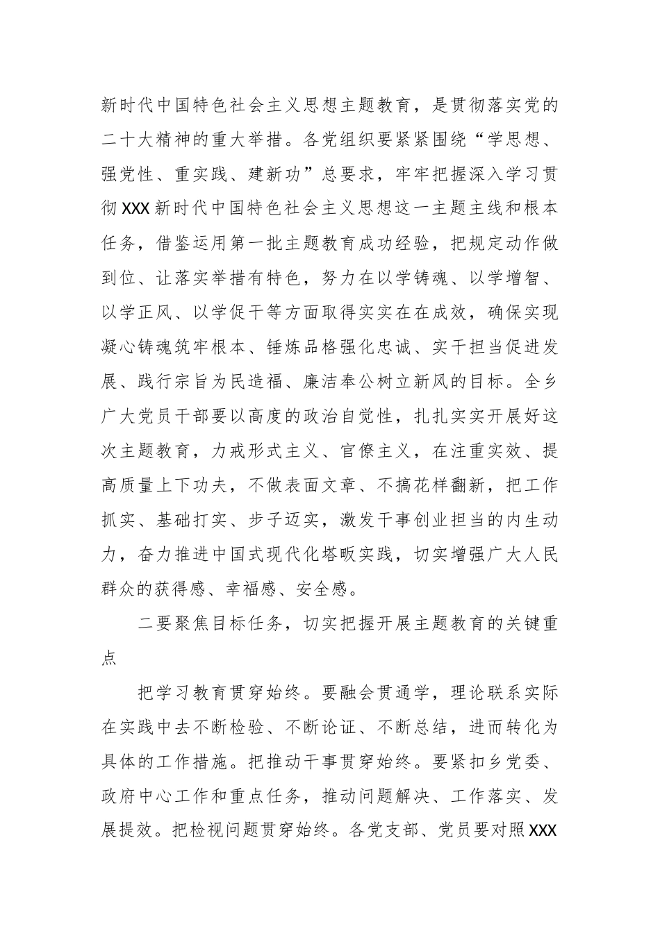 上级领导在全乡学习贯彻2023年主题教育部署会暨重点工作推进会上的讲话同志们:今天的会议要求全体乡村干部参加,召开这么大规模的会议,主要目的有两个:一是对学习贯彻XXX新时代中国特色社会主义思想主题教育进行部署安排;二是总结回顾今年三个季度的工作开展情况,找找亮点、查查不足、比比优劣,让大家清楚我们上半年都干了些什么,取得了哪些成绩,还存在哪些问题;距年底各项工作考核越来越近,一些工作离年初党代会、人代会定的目标还有较大差距,还有很多重点工作需要尽快安排部署,还需要进一步发力落实,需要全乡上下统一思想,凝聚共识,齐心协力实干快干。刚才,六位班子成员就各自分管负责的工作做了汇报并就下一步工作安排做了部署,约进乡长也对年内重点工作进行了点评和要求。讲的非常好,我完全赞同,我在这里也就不重复了。下面,我再强调以下三个方面的问题。一、学习贯彻XXX新时代中国特色社会主义思想主题教育是当前乃至今后一段时间最重要的政治任务一要提高政治站位,深刻认识开展主题教育的重大意义在全党深入开展学习贯彻XXX新时代中国特色社会主义思想主题教育,是贯彻落实党的二十大精神的重大举措。各党组织要紧紧围绕“学思想、强党性、重实践、建新功”总要求,牢牢把握深入学习贯彻XXX新时代中国特色社会主义思想这一主题主线和根本任务,借鉴运用第一批主题教育成功经验,把规定动作做到位、让落实举措有特色,努力在以学铸魂、以学增智、以学正风、以学促干等方面取得实实在在成效,确保实现凝心铸魂筑牢根本、锤炼品格强化忠诚、实干担当促进发展、践行宗旨为民造福、廉洁奉公树立新风的目标。全乡广大党员干部要以高度的政治自觉性,扎扎实实开展好这次主题教育,力戒形式主义、官僚主义,在注重实效、提高质量上下功夫,不做表面文章、不搞花样翻新,把工作抓实、基础打实、步子迈实,激发干事创业担当的内生动力,奋力推进中国式现代化塔畈实践,切实增强广大人民群众的获得感、幸福感、安全感。二要聚焦目标任务,切实把握开展主题教育的关键重点把学习教育贯穿始终。要融会贯通学,理论联系实际在实践中去不断检验、不断论证、不断总结,进而转化为具体的工作措施。把推动干事贯穿始终。要紧扣乡党委、政府中心工作和重点任务,推动问题解决、工作落实、发展提效。把检视问题贯穿始终。各党支部、党员要对照XXX新时代中国特色社会主义思想,对照党章党规党纪等方面进行党性分析,深入查找自身存在的突出问题。把整改落实贯穿始终。各党支部要对检视中发现的问题,分析研判组织制定整改措施,切实找准解决问题的思路和办法。三要认真组织实施,确保全乡主题教育取得实效突出落实工作责任。乡领导班子和领导干部要抓好自身教育,为全乡当示范、做表率;领导小组各成员单位要各尽其责、密切配合、合力推进;各党(总)支部书记要精准把握好、落实好主题教育各项要求。突出提升工作质量。要把开展主题教育与乡党委、政府工作紧密结合起来与推进当前重点任务结合起来,促进各项工作提质增效、创先争优。突出防止形式主义。要着眼于提升党员干部思想政治素质、解决实际问题的能力来推进主题教育,各分管领导、乡直各单位要结合塔畈实际,把各项工作做扎实做到位,确保取得实实在在的成效。二、全力推进年度重点工作是当前直至年底的最现实的发展要求前三季度,我们用担当打下了坚实基础。2023年我们针对缺乏大项目、好项目支撑的最大短板,全面、全速发力“双招双引”,领导班子成员率先垂范,全乡上下齐心努力,摸排有效招商线索7条,我和乡长带队外出开展“双招双引”活动7次,已签约项目3个。为了稳住茶叶发展大乡的优势,我们持续加大省级现代农业产业园建设力度,成功举办第二届茶文化旅游节,无论是在规模、档次、活动还是影响力上较往届都有了很大的提升。为了加快推进农旅、茶旅、康旅融合步伐,我们围绕冯冲、西河试点建设大众民宿集群,国庆中秋期间西河又将迎来4家民宿试营业,进一步推进民宿、茶旅、美丽乡村等串珠成链。扎实开展工业“向上”、农业“兴农”、文旅“登高”三大行动,全乡上下抓产业、抓招商、抓项目的氛围日益浓厚...