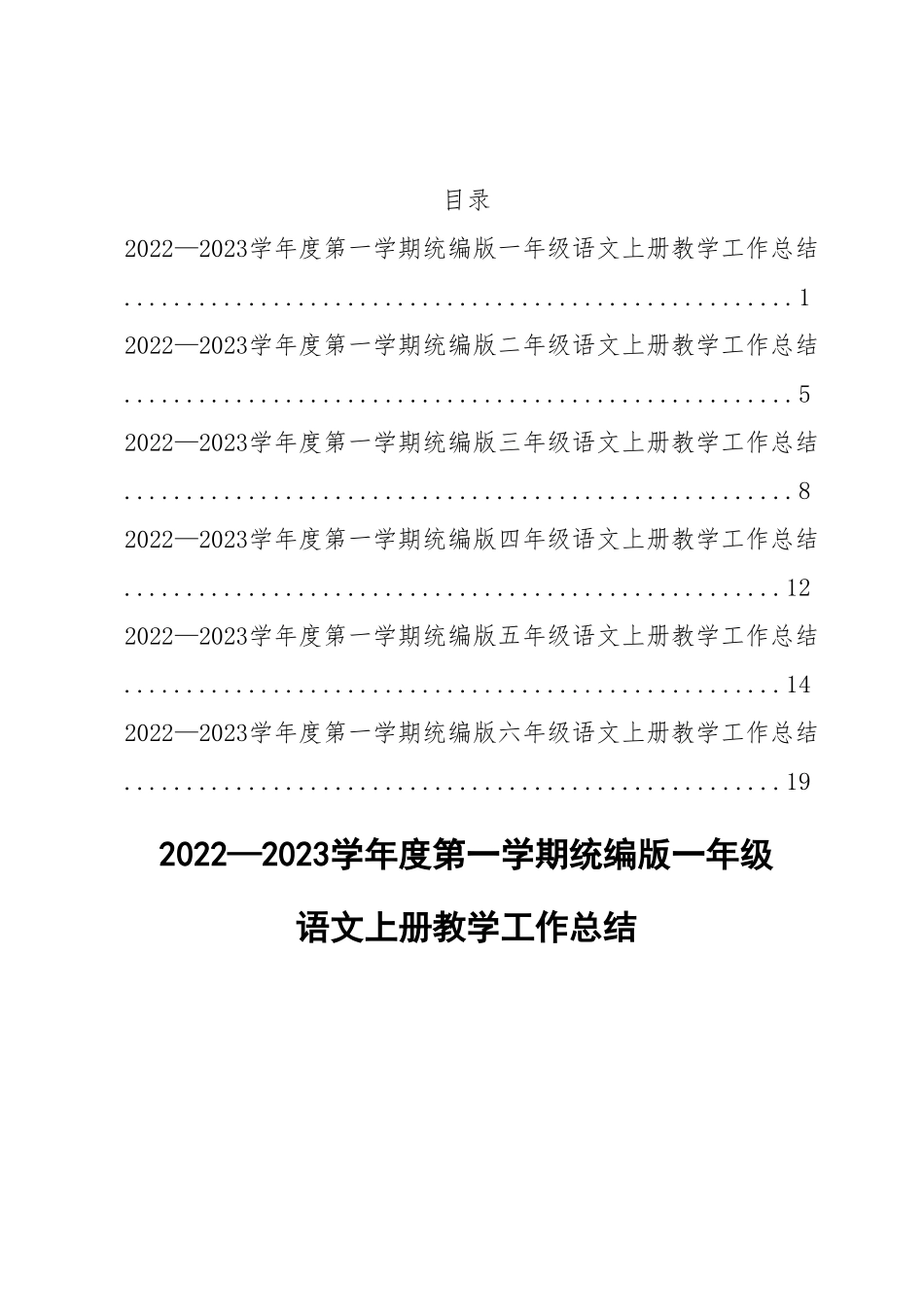 目录2022—2023学年度第一学期统编版一年级语文上册教学工作总结......................................................12022—2023学年度第一学期统编版二年级语文上册教学工作总结......................................................52022—2023学年度第一学期统编版三年级语文上册教学工作总结......................................................82022—2023学年度第一学期统编版四年级语文上册教学工作总结.....................................................122022—2023学年度第一学期统编版五年级语文上册教学工作总结.....................................................142022—2023学年度第一学期统编版六年级语文上册教学工作总结.....................................................192022—2023学年度第一学期统编版一年级语文上册教学工作总结时间过的真快,转眼间就到了学期末,本学期我担任一年级的语文教学工作。作为一名教师,我对于自己所从事的事业不敢有半点懈怠。本着一切为了学生的发展为前提,尽自己最大的努力较好地完成了本学期的教学任务。下面将我的教学工作做如下总结:一、细读教学内容,精心组织教学一年级一册的语文教学任务繁重,汉语拼音知识既是学生学好语文的基础,又是学好语文的重点。要求学生认对、读准23个声母、24个韵母和16个整体认读音节,能准确地拼读音节,能说出声调符号的名称,读准四声,学读轻声,认识四线格,能正确书写声母、韵母和音节;能借助汉语拼音识字、正音、学说普通话;认识常用汉字300个,其中100个要求会写。这么大的学习量如果不讲究科学合理的方法,而让学生单调地读,重复地写,长此以往,学生将对拼读、识字产生厌恶情绪。由于一年级小朋友以不随意记忆为主,课堂上经常会发生这样那样想不到的状况。在开学前一个半月教学拼音的时间里,我尽力将拼音知识活学活用,通过学儿歌、“拼音小明星”游戏等形式激发学生学习的兴趣。本学期,除备课写教案,我花了大量的时间制作大量形象直观的课件辅助教学,用来激发学生学语文的兴趣。课堂上看到学生求知的眼神,一切的辛苦都变成了乐趣。课后,我针对教学实际,坚持进行反思,努力调整教学策略,争取每天细微的进步。二、培养良好学习习惯,严格语文学习常规一年级是学生从幼儿园到小学的转换点,很多幼儿班的习惯也随之带了过来,如何能让他们在40分钟的课堂上认真地听讲,是非常重要的。因此,培养学生良好的学习习惯是我教学工作开始的重点。刚开学的两个星期里,我采用编儿歌、口令等形式,将学生学习习惯的培养融入情趣之中,让学生在情趣之中慢慢地养成良好的习惯。上课前准备充足,给了我底气,让我的心充实自信。基于这点,面对一群新生,我首要的工作就是“抓心”。心齐了,注意力集中了,课堂常规自然跟上了。课堂上,我努力营造和谐、活泼的氛围,努力让自己的语言变得更加亲切,充满激情。写字教学是一年级语文教学工作的难点。能让每一个学生写一手好字,是我最大的心愿。所以,在平时的教学工作中,我特别注意对学生写字的要求。首先,要让学生写好字,作为他们的语文老师,我更注重自己示范。其次,我充分利用多媒体课件中的写字教程,引导学生学会读帖、描红,既从技能方面要求学生,又从习惯方面的要求学生。特别是习惯方面的要求,如怎样握笔,保持怎样的写字姿势,这些往往容易忽略,而恰恰正是这影响了学生的写字质量的提高。因此,在抓好学生写好字的同时我更注重学生有良好的写字习惯。三、直面学生差异,公平对待全体学生。学生学习的能力差异是肯定存在的。为了减小差异,在课堂上我的提问任务程度不同,是有不同梯度的。我经常针对学生各自特点,请相对应的学生回答问题。我班的文玉萍、蒋业顺和文婷香,学习的速度比一般同学慢一点,作业不能及时完成。可是他们爱识字,针对他们这种情况,我在课堂上特别关注他们,多给他展示的机会,经常督促他,并及时鼓励他。一个学期结束,感觉他们有了一定的进步。这归根于学生感觉到了我对他们的关心。评价作业时,我尽可能的进行面批,这样能更好的掌握学生运用知识的情况,...