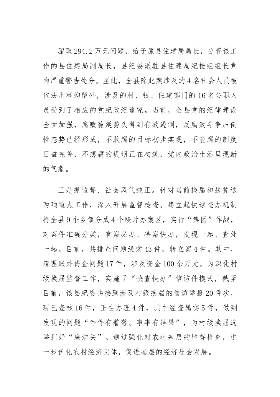 XX县纪委落实全县环境整治工作中“营造‘亲、清’政商关系以及优质服务实体经济”情况汇报县纪委按照县委、县政府和县环境整治战役指挥部打好“环境整治”战役的决策部署,着重抓好“营造‘亲、清’政商关系以及优质服务实体经济”工作,从以下几个方面着手:一、工作开展情况一是抓作风、工作效率提速。1-4月,共组建21个作风建设督查组,采取不定时间、不定单位、不打招呼三不方式,开展作风督查50余次,下发交办函11份,印发督查通报8期,通报单位14个次、87人次,问责处理86人。典型事例为:县纪委开展春节后上班第一天督查,“节后‘不收心、不归位’,56名公职人员被处理”。其中县民政局14人迟到和未打卡,县房产局26人迟到和未打卡,其主要负责人被约谈。经过一系列的作风问责,机关单位的形象明显好转、执行力明显提高。二是抓案件、廉洁意识变浓。斩钉截铁的查处案件,纠正腐败问题和不正之风,2017年来,立案46件,结案28件,典型案例为,2017年3月22日,XX县纪委对因履职不到位、“两个责任”落实不力,导致该县农村危房改造补助资金被骗取294.2万元问题,给予原县住建局局长,分管该工作的县住建局副局长,县纪委派驻县住建局纪检组组长党内严重警告处分。至此,全县除此案涉及的4名社会人员被依法刑事拘留外,涉及的村、镇、住建部门的16名公职人员受到了相应的党纪政纪追究。当前,全县党的纪律建设全面加强,腐败蔓延势头得到有效遏制,反腐败斗争压倒性态势已经形成,不敢腐的目标初步实现,不能腐的制度日益完善,不想腐的堤坝正在构筑,党内政治生活呈现新的气象。三是抓监督、社会风气纯正。针对当前换届和扶贫这两项重点工作,深入开展监督检查。建立起快速查办机制将全县9个乡镇分成4个联片办案区,实行“集团”作战,对案件准确分类,有案必办、特案快办,发现一起、查处一起。目前,共排查问题线索43件,转立案4件。其中,清理账外资金问题17件,涉及资金100余万元。为深化村级换届监督工作,实施了“快查快办”信访件模式,截至目前,该县纪委共接到涉及村级换届的信访举报20件次,现已查核16件,正在办理4件,其中经查属实5件,做到发现的问题“件件有着落、事事有结果”,为村级换届选举把好“廉洁关”。通过强化对农村基层的监督检查,进一步优化农村经济实体,促进基层的经济社会发展。四是抓宣传、群众信任感提升。按照打好“环境整治”战役的决策部署和抓好“营造‘亲、清’政商关系以及优质服务实体经济”工作的要求,加大对损害山前水秀政治环境行为的通报和宣传力度。1-4月党风廉政建设宣传报道中央媒体上稿6篇,省级媒体网络上稿85篇,市级媒体上稿118篇,宣传工作走在全市前列,开通“永明清风”微信公众号,关注人数达1万余名。通过廉政宣传,干部的廉政意识明显提高,群众的幸福感明显提高,如全县综治民调始终走在全市乃至全省前列。二、存在的问题通过一系列的纠风治乱、惩治腐败,全县党务政务环境明显好转,但也因客观因素的影响,一些工作未深化、细化。主要原因是表现为:主动发现案件线索的能力有待提高。目前我县案件线索的主要来源为信访举报,但基层群众反映的问题大多是村组干部办事不公、涉农惠农资金分配不公、违反计划生育、打牌赌博等问题,问题线索整体质量不高,而涉及到反映领导干部违反廉洁纪律、政治纪律、组织纪律等问题,往往都是捕风捉影、无凭无据。一些党员干部面对其他人的违纪问题,瞻前顾后、畏首畏尾,不愿不敢揭发检举,怕得罪别人、影响自己。这些问题导致我县大案要案线索不多,查办的大案要案数量较少。三、下一步的打算下一步,县纪委将按照“营造‘亲、清’政商关系以及优质服务实体经济”工作的要求,进一步优化作风、提升效率、肃清环境,力度再大一点、范围再广一点,办法再多一点,打造山清水秀的政治生态,为全县经济社会发展保驾护航。XX县纪委监察局2017年5月3日