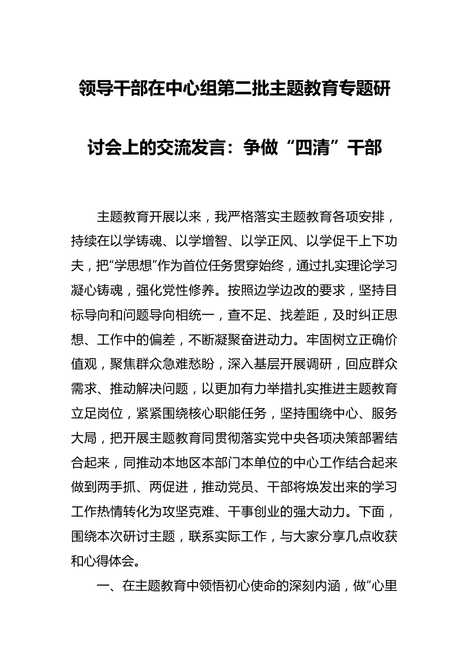 领导干部在中心组第二批主题教育专题研讨会上的交流发言:争做“四清”干部主题教育开展以来,我严格落实主题教育各项安排,持续在以学铸魂、以学增智、以学正风、以学促干上下功夫,把“学思想”作为首位任务贯穿始终,通过扎实理论学习凝心铸魂,强化党性修养。按照边学边改的要求,坚持目标导向和问题导向相统一,查不足、找差距,及时纠正思想、工作中的偏差,不断凝聚奋进动力。牢固树立正确价值观,聚焦群众急难愁盼,深入基层开展调研,回应群众需求、推动解决问题,以更加有力举措扎实推进主题教育立足岗位,紧紧围绕核心职能任务,坚持围绕中心、服务大局,把开展主题教育同贯彻落实党中央各项决策部署结合起来,同推动本地区本部门本单位的中心工作结合起来做到两手抓、两促进,推动党员、干部将焕发出来的学习工作热情转化为攻坚克难、干事创业的强大动力。下面,围绕本次研讨主题,联系实际工作,与大家分享几点收获和心得体会。一、在主题教育中领悟初心使命的深刻内涵,做“心里清楚”的干部。“不忘初心、牢记使命”,是党的十九大报告开门见山提出的重大命题,在党的二十大报告中又被重点强调,在这次主题教育中同样被着重强调,这既是对高质量开展主题教育提出的要求,也是向全党同志发出的号召A总书记强调,“这次主题教育要牢牢把握‘学思想、强党性、重实践、建新功’的总要求。”深刻认识中国共产党人的初心和使命起源,能“增进对党的创新理论的政治认同、思想认同、理论认同、情感认同。”牢固树立“人民至上”的崇高理想,贴近群众、依靠群众,站稳人民立场,走好群众路线,把人民群众对美好生活的向往作为奋斗目标,确保为民的初心“不变质”、实干的底色“不变色”,时刻将人民的急难愁盼记在心上,时刻将为人民谋幸福的坚定信念刻在心里,不谋私、不怕苦,厚植为民情怀,践行初心使命,做好人民群众的勤务员。应在主题教育中扑下身子、沉到一线,感情上贴近群众,行动上深入群众,工作上依靠群众,察民情、访民意,进行问题梳理、难题排查,说老百姓听得懂的话,问老百姓最关切的事情,真正解决群众急难愁盼问题。要将人民群众满意不满意、赞成不赞成、答应不答应作为衡量尺度,坚持边学习、边对照、边检视、边整改,查问题,找差距,时刻突出问题导向,把“问题清单”变成“责任清单”,奔着问题去、带着问题学、对着问题改,不断修正对齐,让人民群众真切地感受到主题教育带来的新变化,推动主题教育取得实实在在的成效。二、在主题教育中筑牢理想信念根基,做“头脑清醒”的干部。理论上清醒坚定,理想信念才能坚定执着,而高度的理论清醒来源于深入学习。主题教育中,学思想是一项重要要求,理论学习是一项重要任务,也是开展其他工作的前提和基础。基础不牢,地动山摇。也就要求广大党员干部要坚持把学习A新时代中国特色社会主义思想作为重中之重,全面系统学、深入思考学、联系实际学,原原本本原汁原味地学,带着问题、带着要求地学,逐字逐句、反反复复地学,以及认真完成党组织规定的各项学习任务,源源不断地从中汲取真理力量和思想养分,把其中的内涵要义、思想实质融入血脉、铸入灵魂,努力实现由似是而非的模糊感知上升为具体的深刻的清醒的认识,进而筑牢理想信念之基。必须高举马克思主义、中国特色社会主义伟大旗帜不动摇,坚持A新时代中国特色社会主义思想指导地位不动摇,自觉用科学理论武装头脑、指导实践、推动工作,努力做到学思用贯通、知信行统一;要把马克思主义作为党和人民事业不断发展的参天大树之根本、党和人民不断奋进的万里长河之泉源,自觉进行思想淬炼、政治历练、实践锻炼,常修常炼,培深培厚精神家园。要自觉锤炼品格强化党性,以主题教育为契机,坚持不懈用A新时代中国特色社会主义思想武装头脑,增强对党忠诚的理论自觉,始终在思想上政治上行动上同以A同志为核心的党中央保持高度一致,做到心往一处想、劲往一处使。要自觉把理论学习同具体实践相结合,拜先锋模范为师,深扎基层、服务群众,投入基层的火热实践中,体悟群众的苦与乐,解决群众的盼与求,利用基层工作的困难和挫折不断锤炼个人党性修养、保持共...
