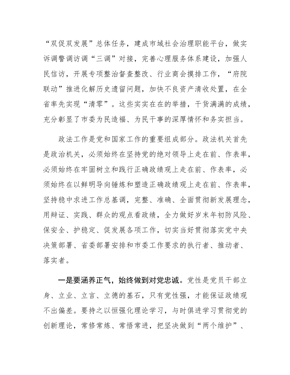 交流研讨:树立和践行正确政绩观尊敬的XX,同志们:按照会议安排,下面,我就近期学习思考,结合工作实际,就树立和践行正确政绩观作一简要交流发言,不妥之处,请批评指正。《党章》明确要求,党的各级领导干部要“树立正确政绩观,做出经得起实践、人民、历史检验的实绩。”《中国共产党纪律处分条例》总则中鲜明提出了“切实践行正确的权力观、政绩观、事业观”的纪律要求。政绩观正确与否,不仅影响到干部个人健康成长,更关系到党和人民事业发展。党的十八大以来,围绕政绩为谁而树、树什么样的政绩、靠什么树政绩等问题,总书记发表一系列重要论述,身体力行、率先垂范,为广大党员、干部树立了典范和标杆。省委ZZ书记提出要牢固树立和践行造福人民的政绩观,并从“始终做党性坚强的明白人、始终做人民群众的勤务员、始终做善作善成的多面手、始终做起而行之的实干家、始终做夯基垒台的建设者”五个方面提出具体要求。今年以来,市委常委会认真贯彻法治思想,以主动创稳提质增效为主线,聚焦打造社会治理典范,扎实推进“双促双发展”总体任务,建成市域社会治理职能平台,做实诉调警调访调“三调”对接,完善心理服务体系建设,加强人民信访,开展专项整治督查整改、行业商会摸排工作,“府院联动”推进化解历史遗留问题,加快不良资产清收处置,在全省率先实现“清零”。这些实实在在的举措,干货满满的成绩,充分彰显了市委为民造福、为民干事的深厚情怀和务实担当。政法工作是党和国家工作的重要组成部分。政法机关首先是政治机关,必须始终在坚持党的绝对领导上走在前、作表率,必须始终在牢固树立和践行正确政绩观上走在前、作表率,必须始终在以鲜明导向锤炼和塑造正确政绩观上走在前、作表率,坚持稳中求进工作总基调,完整、准确、全面贯彻新发展理念,用辩证、实践、群众的观点看政绩,全力做好岁末年初防风险、保安全、护稳定、促发展各项工作,切实当好贯彻落实党中央决策部署、省委部署安排和市委工作要求的执行者、推动者、落实者。一是要涵养正气,始终做到对党忠诚。党性是党员干部立身、立业、立言、立德的基石,只有党性强,才能保证政绩观不出偏差。要持之以恒强化理论学习,与时俱进学习贯彻党的创新理论,常修常炼、常悟常进,把坚决做到“两个维护”、坚决捍卫“两个确立”作为最高政治原则和根本政治规矩,砥砺政治忠诚、加强党性锻炼,筑牢思想根基,坚决贯彻落实好省委、市委部署要求,紧紧围绕“幸福南安”目标定位,聚焦打造“西南明珠”工作部署,尽忠职守、勤奋敬业,深思善谋、敢拼善赢。二是要坚定志气,始终践行群众路线。群众路线是党的根本工作路线,要悟透以人民为中心的发展思想,始终站在群里立场上想问题、作决策、办事情,不主观臆断、不简单片面。要善于“十指弹琴”,时刻把群众安危冷暖放在心上,深入研究和准确把握新形势下群众工作特点规律,紧密结合市委重点任务和政法委中心工作,从群众普遍关注、反映强烈、反复出现的问题出发,按照市委全力推进社会治理改革既定部署和节奏压茬推进,做到统筹兼顾、稳扎稳打、走深走实。三是要历练勇气,始终坚持求真务实。坚持一切从实际出发是我们想问题、办事情的出发点和落脚点。要以实情为基础、以实干为导向,从身上有土、脚上有泥的调查研究中找思路、找方法、找创新,坚持做事不作秀,造福不造势的务实作风,坚决摒弃好高骛远、脱离实际的官僚主义、形式主义。深化主动创安主动创稳,坚决守牢安全生产底线,社会稳定防线,发扬新时代“枫桥经验”,推动“一站式”矛盾纠纷多元化解工作提质增效,常态化开展扫黑除恶,推动法治南安建设取得新成效,以高水平安全保障高质量发展,让人们群众工作生活更有劲头、更有盼头。四是要锤炼锐气,始终精进自身修养。团结出凝聚力,出战斗力,要坚决服从组织决定,维护班子团结,顾全大局、善于协作,做到大事讲原则、小事讲风格。要坚持正确处理好稳和进、立和破、标和本、近和远,显功和潜功、大我和小我的关系,以“俯首甘为孺子牛”的实干精神、“一张蓝图绘到底”的坚韧意志和“功成不必在我、功成必定有我”的历史担当,对定下的工作部署...