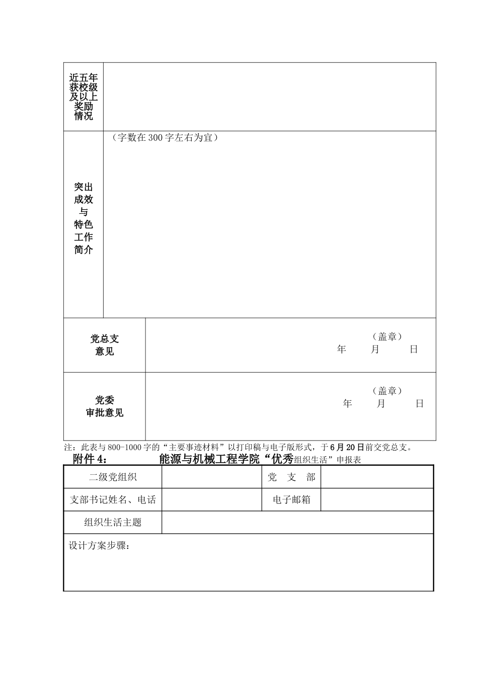 附件1:能源与机械工程学院“优秀共产党员”(教职工)推荐审批表姓名性别民族出生年月文化程度专业技术职务入党年月所在部门党政职务简历(从大学写起)近三年获校级及以上奖励的情况主要事迹简介(字数在300字左右为宜)党支部推荐意见签名(盖章):年月日党总支审批意见(盖章)年月日注:此表与800-1000字的“主要事迹材料”以打印稿与电子版形式,于6月20日前交党总支。附件2:能源与机械工程学院“优秀共产党员”(学生)推荐审批表姓名性别民族出生年月籍贯担任职务入党年月所在院系专业年级学号近三年获校级及以上奖励的情况主要事迹简介(字数在300字左右为宜)党支部推荐意见签名(盖章):年月日党总支审批意见(盖章)年月日注:此表与800-1000字的“主要事迹材料”以打印稿与电子版形式,于6月20日前交总支附件3:能源与机械工程学院“先进基层党组织”推荐审批表党组织全称书记姓名组建时间党员人数其中正式党员创先争优活动是否全覆盖基层组织考评(自评)情况近五年获校级及以上奖励情况突出成效与特色工作简介(字数在300字左右为宜)党总支意见(盖章)年月日党委审批意见(盖章)年月日注:此表与800-1000字的“主要事迹材料”以打印稿与电子版形式,于6月20日前交党总支。附件4:能源与机械工程学院“优秀组织生活”申报表二级党组织党支部支部书记姓名、电话电子邮箱组织生活主题设计方案步骤:活动成效:展示材料:支部书记(签名)年月日二级党组织初评与推荐意见:党总支负责人签章:年月日注:1、详细要求见《关于开展创建服务型基层党组织“十佳组织生活”评选展示活动的通知》(沪电院党〔2014〕17号),2、此表与展示材料以打印稿与电子版形式,于6月20日前交党总支。