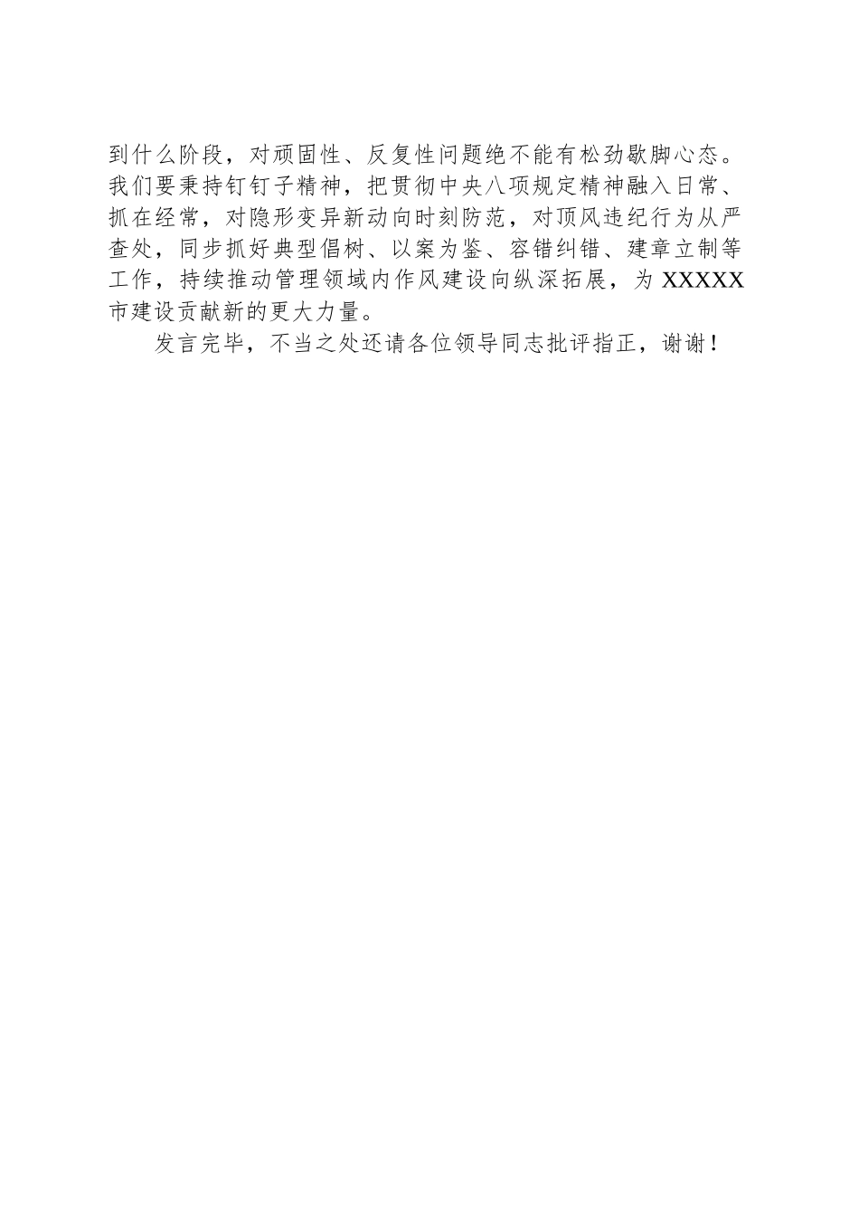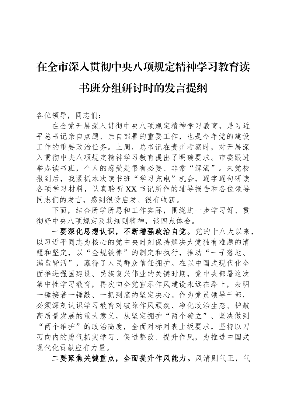 在全市深入贯彻xxx精神学习教育读书班分组研讨时的发言提纲各位领导,同志们:在全党开展深入贯彻xxx精神学习教育,是习近平总书记亲自点题、亲自部署的重要工作,也是今年党的建设工作的重要政治任务。上周,总书记在贵州考察时,对开展深入贯彻xxx精神学习教育提出了明确要求。市委跟进举办读书班,个人的感受是很有必要、非常“解渴”。来党校报到后,我紧抓本次读书班“学习充电”机会,逐字逐句研读各项学习材料,认真聆听XX书记所作的辅导报告和各位领导同志们的发言,感到很受启发、很有收获。下面,结合所学所思和工作实际,围绕进一步学习好、贯彻好xxx及其细则精神,谈四点体会。一要深化思想认识,不断增强政治自觉。党的十八大以来,以习近平同志为核心的党中央时刻保持解决大党独有难题的清醒和坚定,以“金规铁律”的制定和执行,推动“一子落地、满盘皆活”,赢得了人民群众信任拥护。在以中国式现代化全面推进强国建设、民族复兴伟业的关键时期,党中央部署这次集中性学习教育,再次向全党宣示作风建设永远在路上,表明一锤接着一锤敲、一抓到底的坚定决心。作为党员领导干部,必须深刻认识学习教育对破除作风顽疾、净化政治生态、护航高质量发展的重大意义,从坚定拥护“两个确立”、坚决做到“两个维护”的政治高度,全面对标对表上级要求,坚持以刀刃向内的勇气抓实学习、促进整改、提升作风,为推进中国式现代化贡献应有力量。二要聚焦关键重点,全面提升作风能力。风清则气正,气正则心齐,心齐则事成。在进一步全面深化改革的重要一年开展学习教育,一个重要着眼点就是教育引导党员干部拿出优良作风,坚持干字当头、争创业绩。到任XX区后,总的感受是干部队伍作风能力较强,但局部领域也存“四风”未清的问题,一定程度上影响了“XXXX第一区”建设的质量效益。今年,XX书记提出“XXXX年”工作主线,全区学习教育也已正式启动。下步,将始终把xxx精神作为铁规矩、硬杠杠,将作风建设的着力点嵌入“XXXX年”全链条,一体推进学查改各项工作,大力倡树创业奋斗之风、实干实战之风、清正廉洁之风,夯实“不打糊涂账、不搞花架子、不当太平官”思想根基,为全区干事创业营造好风清气正的政治生态和有力作风保障。三要注重以上率下,坚定做好示范引领。xxx颁布12年来,正是以习近平同志为核心的党中央为全党作出表率示范,带头严格执行八项规定,让全党全国人民看到了党中央锲而不舍抓作风建设的坚强决心,继而更为坚定团结奋斗的信心、开创了新时代的一个又一个胜利。从实践看,党员领导干部作为“关键少数”,“头雁效应”能否充分发挥,决定了作风建设责任链条能否彻底拧紧压实。在这面,我们绝不能“挂图不作战、挂帅不出征”,必须坚决扛起全面从严治党“第一责任人”职责,首要确保自身学有质量、查有力度、改有成效,进一步教育引导“责任田”内党员干部在思想上划出红线、在行动上明确界限,以优良作风推动各项工作高质量发展。四要突出常态长效,持续推动固本培元。习近平总书记强调,xxx堤坝是好不容易筑起的,一定要倍加珍惜,不断巡堤检修。总的看,通过坚持不懈抓、久久为功治,全国各行业领域的享乐主义、奢靡之风已经得到有力遏制,形式主义、官僚主义也已得到重点整治,xxx已经成为党员干部的行动自觉。但是我们也要清醒认识到,作风建设永远在路上,党和人民事业发展到什么阶段,党的作风建设就要推进到什么阶段,对顽固性、反复性问题绝不能有松劲歇脚心态。我们要秉持钉钉子精神,把贯彻xxx精神融入日常、抓在经常,对隐形变异新动向时刻防范,对顶风违纪行为从严查处,同步抓好典型倡树、以案为鉴、容错纠错、建章立制等工作,持续推动管理领域内作风建设向纵深拓展,为XXXXX市建设贡献新的更大力量。发言完毕,不当之处还请各位领导同志批评指正,谢谢!公文范文文库网站①【公文堂】:www.gongwentang.com公文范文文库网站②【公文堂】:www.gongwentang.com请各位用户务必收藏好以上两个网站,收藏好网址,终身可访问或下载全站公文范文客服微信:gongw...