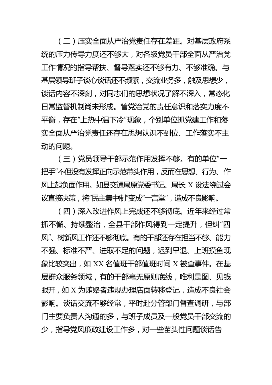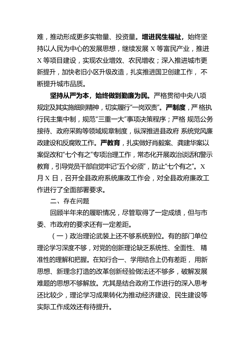2023年上半年履行全面从严治党“一岗双责”情况报告今年以来,本人紧紧围绕政府中心工作和全县发展大局,深入学习贯彻习近平新时代中国特色社会主义思想和党的二十大精神,严格履行“一岗双责”,认真落实全面从严治党主体责任,着力抓好党风廉政建设、意识形态建设和履职能力建设,推进政府系统作风建设持续向好。一、“一岗双责”履职情况坚持忠诚立魂,始终做到政治坚定。始终把提升政治站位作为首要前提,坚持第一议题贯穿理论学习始终,通过积极参加县委理论中心组学习,召开X次县政府常务会、X次县政府党组会集体学习最新重要讲话指示、会议精神等内容,不断提高政治判断力、政治领悟力、政治执行力。同时,坚决捍卫“两个确立”、做到“两个维护”,紧紧围绕中央和省、市、县委决策部署,压紧压实主体责任核心,带领班子成员和政府部门主要负责人不折不扣落实“一岗双责”要求,用实际行动践行对党绝对忠诚。坚持发展为基,始终做到奋发有为。稳定经济增长,围绕X等特色优势产业,聚焦“主攻工业、决战♘区”,大力实施“五十百千万”工程;带头每月外出开展产业链招商,不断壮大工业规模;加大项目调度频次和力度,落实落细各项惠企纾困政策,及时解决企业用地、用工、融资等实际困难,推动形成更多实物量、投资量。增进民生福祉,始终坚持以人民为中心的发展思想,继续发展X等富民产业,推进X等项目建设,实现农业增效、农民增收;深入推进城市更新提升,加快老旧小区升级改造,扎实推进国卫创建工作,不断提升城市品质。坚持从严为本,始终做到勤廉为民。严格贯彻中央八项规定及其实施细则精神,切实履行“一岗双责”。严制度,严格执行民主集中制,规范“三重一大”事项决策程序;严格规范公务接待、政府采购等领域规章制度,纵深推进县政府系统党风廉政建设和反腐败工作。严教育,扎实做好肖毅案、龚建华案以案促改和“七个有之”专项治理工作,常态化开展政治谈话和警示教育,引导党员干部自觉牢记“五个必须”,防止“七个有之”。X月X日,召开全县政府系统廉政工作会,对全县政府廉政工作进行了全面部署要求。二、存在问题回顾半年来的履职情况,尽管取得了一定成绩,但与市委、市政府的要求还有一定差距。(一)政治理论武装上还不够系统到位。有的部门单位理论学习深度不够,对党的创新理论缺乏系统性、全面性、精准性的理解和把握。在知行合一、学用结合上仍有差距,用新思想、新理念打造的改革创新经验做法还不够多,破解发展难题的思想不够解放。尤其是结合政府工作进行的深入思考还比较少,理论学习成果转化为推动经济建设、民生建设等实际工作成效还有待提升。(二)压实全面从严治党责任存在差距。对基层政府系统的压力传导力度还不够大,对各级党员干部全面从严治党工作情况的指导帮扶、督导落实还不够有力、不够准确。与基层领导班子谈心谈话还不频繁,交流业务多,触及思想少,谈话内容不深刻,对同志们的思想状况了解不深入,常态化日常监督机制尚未形成。管党治党的责任意识和落实力度不平衡,存在“上热中温下冷”现象,个别单位抓党建工作和落实全面从严治党责任还存在思想认识不到位、工作落实不主动的问题。(三)党员领导干部示范作用发挥不够。有的单位“一把手”不但没有发挥正向示范带头作用,反而在思想、行为、作风上起负面作用。如县交通局原党委书记、局长X设法绕过会议直接决策,将“民主集中制”变成“一言堂”,造成不良影响。(四)深入改进作风上完成还不够彻底。近年来经过常抓不懈、持续整治,全县干部作风得到一定提升,但纠“四风”、树新风工作还不够彻底。有的干部还存在担当不够、能力不强、标准不严、进取不足的问题,迟到早退、上班摸鱼现象比较突出,如XX名值班干部值班时间X被查事件。在基层群众服务领域,有的干部毫无原则底线,唯利是图、见钱眼开,如X为贿赂者违规办理店面转移登记,造成不良社会影响。谈话交流不够经常,平时赴分管部门督查调研,与部门主要负责人沟通的多,与班子成员及一般党员干部交流的少,指导党风廉政建设工作多,对一些苗头性问题谈话告诫的少,红脸出汗的更少。三、下步打算针对这些问题,我...