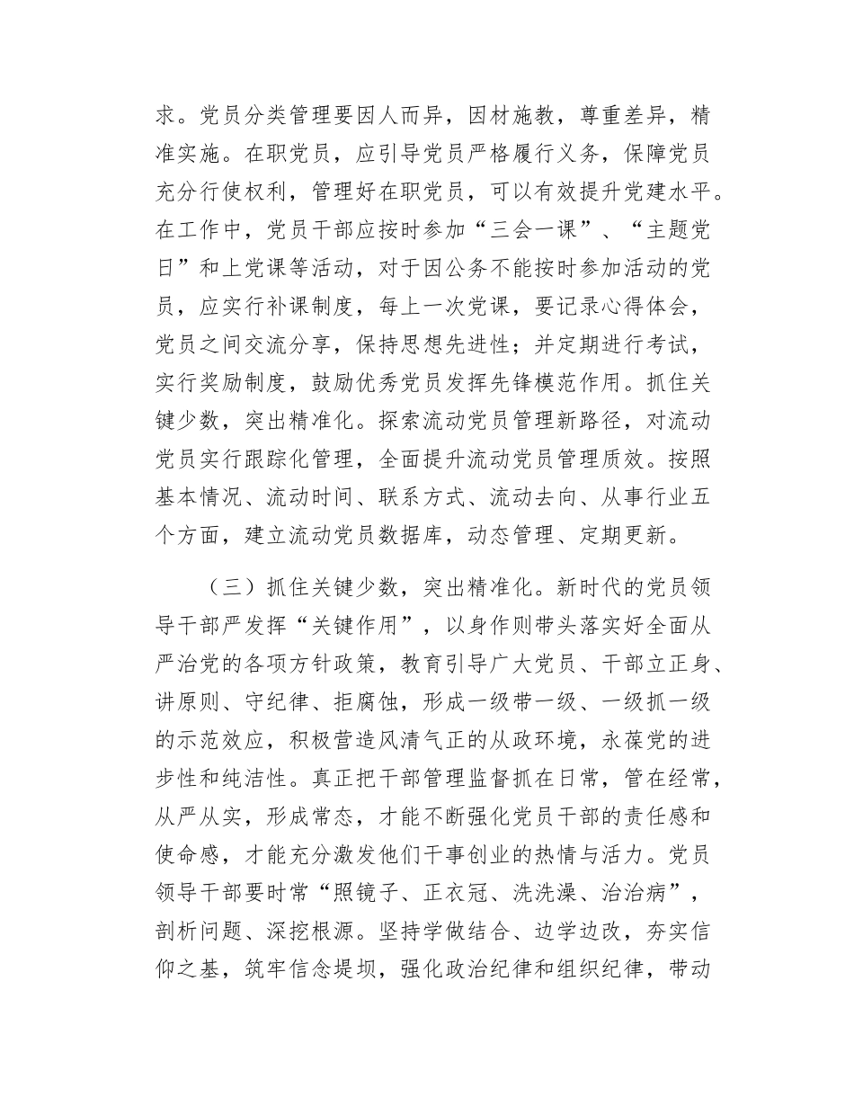 支部书记党课讲稿充分发挥党员先锋模范作用努力使每名党员都成为一面鲜红的旗帜同志们:一名党员,就是一面旗帜。百年来,中国共产党人用行动诠释初心和使命,树立起一座座精神丰碑。习近平总书记在中央和国家机关党的建设工作会议上指出,要严格党员教育管理监督,使每名党员都成为一面鲜红的旗帜。党的二十届三中全会召开后,习近平总书记就中央和国家机关学习贯彻党的二十届三中全会精神、推动机关党建高质量发展作出重要指示,强调要“当好排头兵”“走在前、作示范”,对党员发挥先锋模范作用提出新的更高要求。各基层党组织要抓好党员队伍建设,把思想入党教育贯穿发展党员工作始终,把严的标准、严的措施、严的纪律贯穿到党员教育管理全过程,让每名党员都成为一面鲜红的旗帜。今天的党课,主要围绕“加强党员教育管理,充分发挥党员先锋模范作用”,与大家交流几点想法。一、探索新思路新方法,提升党员教育管理针对性有效性党的二十届三中全会紧紧围绕推进中国式现代化这个主题擘画进一步全面深化改革蓝图,党员队伍是抓改革、促发展的先锋力量,要把宏伟蓝图变为美好现实,迫切需要党员走在前、作表率,建设过硬党员队伍,汇聚进一步全面深化改革、推进中国式现代化的强大力量。(一)抓实日常管理,突出常态化。党员是党的肌体的细胞,党员素质直接关系党的创造力凝聚力战斗力。抓实抓细党员日常管理,以支部为单位压实管理责任,认真落实“三会一课”、组织生活会、民主评议党员等党内生活制度,提高各领域党员管理的针对性实效性。畅通出口打破党员“终身制”,对存在问题的党员及时批评教育,对丧失党员条件的及时组织处置,对道德败坏、蜕化变质的坚决清除出党,坚决维护党员队伍的先进性纯洁性。抓党员管理不能怕麻烦、图省事,要采取更加精细化、个性化的措施。针对“大水漫灌”的传统教育方式,要善于创新方式、推陈出新,打造本地化、差异化的教育平台,多形式、多渠道、多元化强化理论武装、政治历练,确保每名党员组织入党、思想入党。突出党员教育的学用结合、成果转化,将党员担当作为评价标准,鼓励党员深入基层解决群众“急难愁盼”,引导党员以实际行动承诺践诺、示范领航,引导党员“高标准”自我要求。(二)抓好分类管理,突出科学化。随着时代的进步和发展,党员管理方式也需要紧跟时代发展潮流,与时俱进,开拓创新,使党员管理方式更加多元化。紧靠单一传统的管理模式,已经无法满足不同类型的党员多元化的需求。党员分类管理要因人而异,因材施教,尊重差异,精准实施。在职党员,应引导党员严格履行义务,保障党员充分行使权利,管理好在职党员,可以有效提升党建水平。在工作中,党员干部应按时参加“三会一课”、“主题党日”和上党课等活动,对于因公务不能按时参加活动的党员,应实行补课制度,每上一次党课,要记录心得体会,党员之间交流分享,保持思想先进性;并定期进行考试,实行奖励制度,鼓励优秀党员发挥先锋模范作用。抓住关键少数,突出精准化。探索流动党员管理新路径,对流动党员实行跟踪化管理,全面提升流动党员管理质效。按照基本情况、流动时间、联系方式、流动去向、从事行业五个方面,建立流动党员数据库,动态管理、定期更新。(三)抓住关键少数,突出精准化。新时代的党员领导干部严发挥“关键作用”,以身作则带头落实好全面从严治党的各项方针政策,教育引导广大党员、干部立正身、讲原则、守纪律、拒腐蚀,形成一级带一级、一级抓一级的示范效应,积极营造风清气正的从政环境,永葆党的进步性和纯洁性。真正把干部管理监督抓在日常,管在经常,从严从实,形成常态,才能不断强化党员干部的责任感和使命感,才能充分激发他们干事创业的热情与活力。党员领导干部要时常“照镜子、正衣冠、洗洗澡、治治病”,剖析问题、深挖根源。坚持学做结合、边学边改,夯实信仰之基,筑牢信念堤坝,强化政治纪律和组织纪律,带动廉洁纪律、群众纪律、工作纪律、生活纪律严起来,避免造成上梁不正下梁歪。要用制度防止“有权任性”,用制度治理“为官不为”,争做合格党员。二、调动党员积极性和创造性,推进党员队伍建设取得新成效...