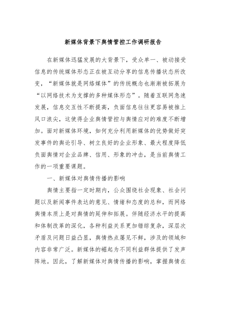 新媒体背景下舆情管控工作调研报告在新媒体迅猛发展的大背景下,受众单一、被动接受信息的传统媒体形态正在被互动分享的信息传播状态所改变,“新媒体就是网络媒体”的传统概念也渐渐被拓展为“以网络技术为支撑的多种媒体形态”。随着互联网急速发展,信息交互性不断提高,负面信息往往更容易被推上风口浪尖,这使得企业舆情管控与舆情应对的难度不断增加。面对新媒体环境,如何充分利用新媒体的优势做好突发事件的舆论引导、树立良好的企业形象、最大程度降低负面舆情对企业品牌、信用、形象的冲击,是当前舆情工作的一项重要课题。一、新媒体对舆情传播的影响舆情主要指一定时期内,公众围绕社会现象、社会问题以及新闻事件表达的意见、情绪和态度的总和,而网络舆情本质上是对舆情的延伸和拓展。伴随经济水平的提高和体制改革的深化,各种利益关系更加错综复杂,深层次矛盾及问题日益凸显,舆情热点屡见不鲜,涉及的领域和内容非常广泛。新媒体的崛起为不同利益群体提供了发声阵地。因此,了解新媒体对舆情传播的影响,掌握舆情在新媒体背景下呈现的新特征,对企业提升舆情管控水平有着重要意义。(一)信息传播的直接性与开放性融媒体时代,借助多样的网络传播工具,舆情传播更为直接,速度更快。通过微博、微信、直播软件可以做到信息传播与新闻事件发生、发展同步,满足公众第一时间直击现场、第二时间获取新闻的诉求。与此同时,新媒体充分利用互联网开放包容的特点,依靠海量信息容量和无时间限制的优势,为公众提供事件背景、专家评述、网友评论、观众“弹幕”等传统媒体无法提供的信息,给信息接收者更好的信息获取体验。(二)舆情热点的互动性与催发性传统媒体时代,新闻信息传播是单向的,大众获取新闻信息时也处于被动位置,而新媒体将“被动接受”转化为“主动推送”,使媒体与受众零距离接触,智能化、私密化的手机,已成为终端舆情信息散播的重要途径。信息接收者与发布者之间的互动交流更加便捷及时,增加信息互动性的同时,也使信息传播更加复杂化。新媒体平台上的各类观点会将突发事件、新闻热点升温催化,舆论发酵变得更为迅速,舆情事件发生的概率增大,解决难度也随之增加。(三)舆情内容的偏差性与反转性舆情在互联网传播中具有很大的随意性和不可控性,由于新媒体平台的参与性、互动性强,难以避免地会出现一些主观性强、诱导性强的观点信息被广泛传递,从而导致信息内容在传播过程中可能出现偏差甚至失真。真假难辨的碎片化信息再加上一些情绪化的观点,就可能成为点燃某一舆情的导火索,形成热点。当下,社会公众作为舆论主体,任何相矛盾的观点都会被展现,舆论呈现出矛盾、变换和交替的现象。随着信息偏差的不断出现、升级以及不断被矫正,舆论导向也会随之出现波动甚至反转。二、新媒体背景下XX舆情管控面临的困难与挑战由于新媒体舆论的主体匿名、渠道广泛、空间无界、汇集实时、自发生成、方向不定、观念多元等鲜明特征,使得公众参与舆情引导、传播舆论观点的门槛较低。新媒体背景下,企业处置与应对舆情面临着诸多困难与挑战。(一)负面舆情发生的概率大近年来,相较于外资与民营企业,国企舆情更容易引发公众关注。很多公众受到一些“网红”“大V”的言论影响,容易对国企产生“垄断暴利”“高薪低效”“腐败浪费”等偏见,使国企逐渐成为舆论场中的“弱势群体”。随着高铁的快速发展,XX行业备受社会关注,引发负面舆情的风险和隐患较为突出。新媒体背景下信息传播不仅速度快,而且不容易控制,因运输服务、设备故障等引发的旅客投诉、个别不文明旅客强扒、强占、强乘等吸引眼球的不和谐事件都可能在短时间内升温发酵,进而引发负面舆论,增大舆情风险。(二)负面舆情防控的难度大作为开放性、大众化的XX运输企业,其负面舆情往往具有突发性,防不胜防。在“全民皆是记者”的融媒体时代,涉路舆情一旦出现在网络上,舆论走向将很难控制。因为广大网友会受到情绪共振与群体效应的影响,个体化言论能够在极短时间内转化为群体化言论,造成“木已成舟”的局面,企业挽回舆论的余地变得极为有限,舆情事件转化为舆论危机的可能性大大增加。(...